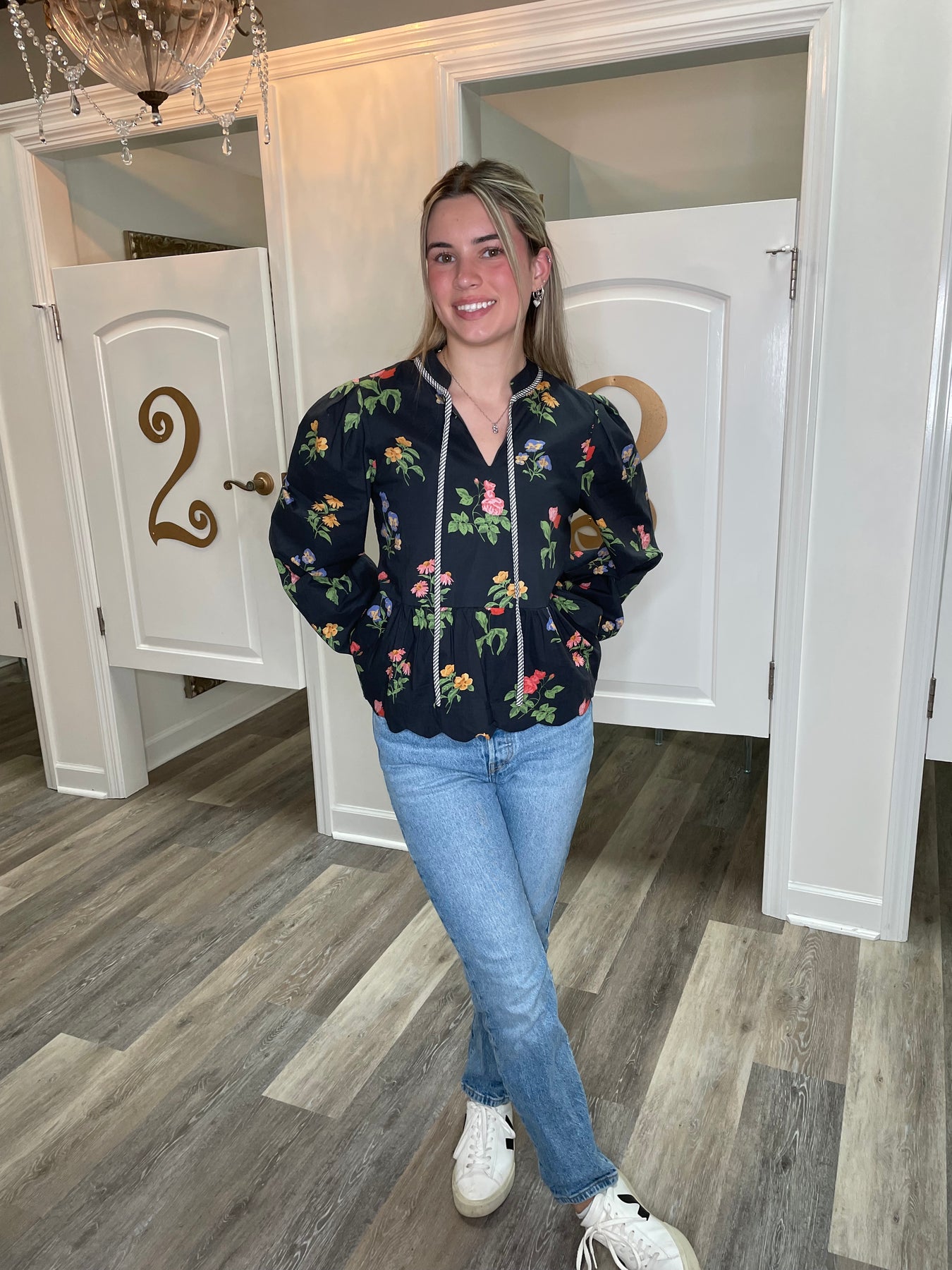 Add a touch of whimsy to your wardrobe with the Gracie Blouse. This playful top features long sleeves and a flattering peplum silhouette, highlighted by a delicate scallop hem. The charming floral print is perfectly complemented by a striped contrast string, adding a subtle twist that keeps things fun and fresh. Perfect for dressing up or down, the Gracie Blouse brings a lively spirit to any outfit.