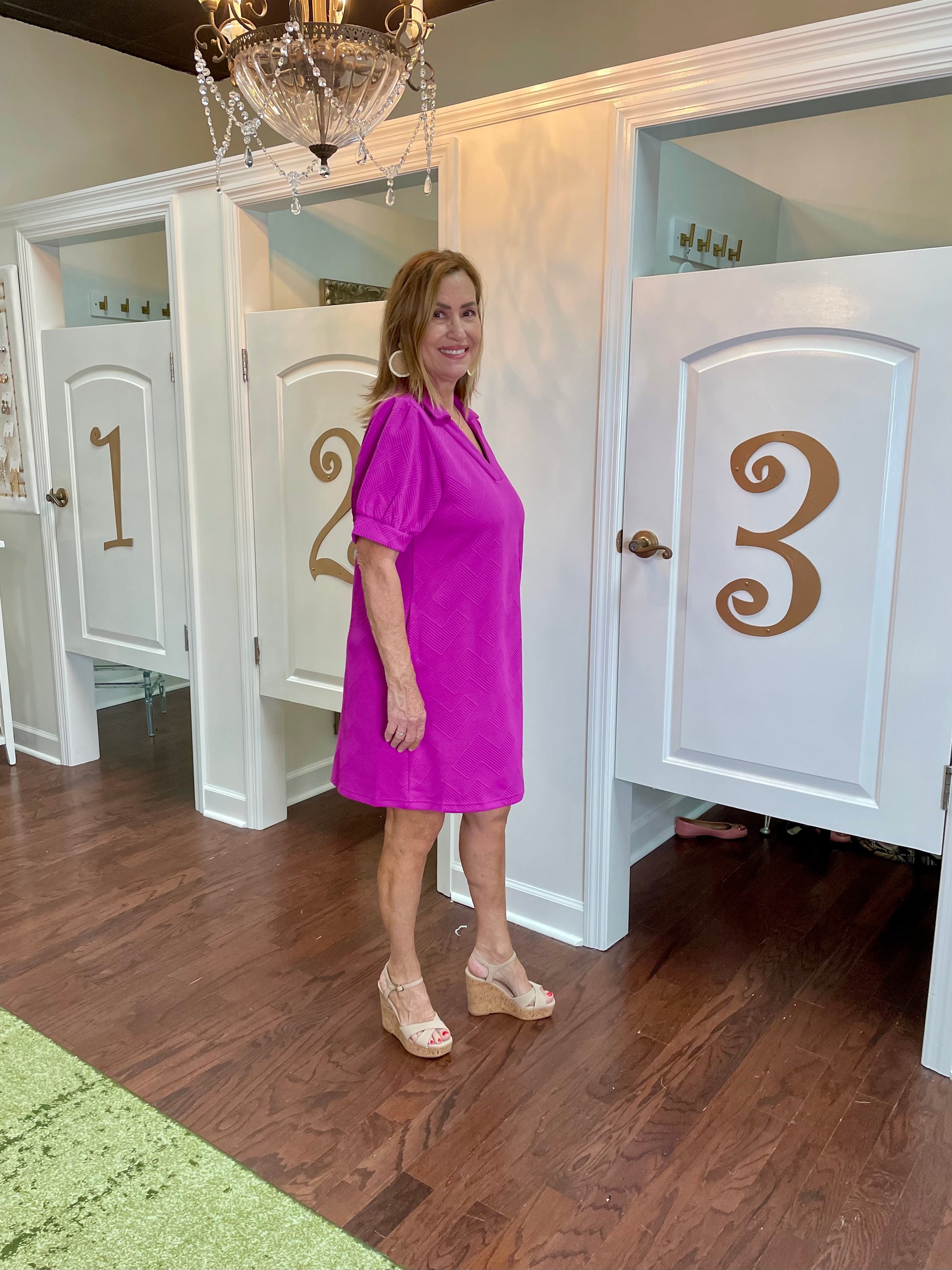 Add a touch of playful elegance to your wardrobe with the Nikki Dress! This textured dress features an open collared neckline, side pockets, and short peasant sleeves with banded cuffs. Made with 95% polyester and 5% spandex, it's the perfect casual dress that can easily be dressed up or down.