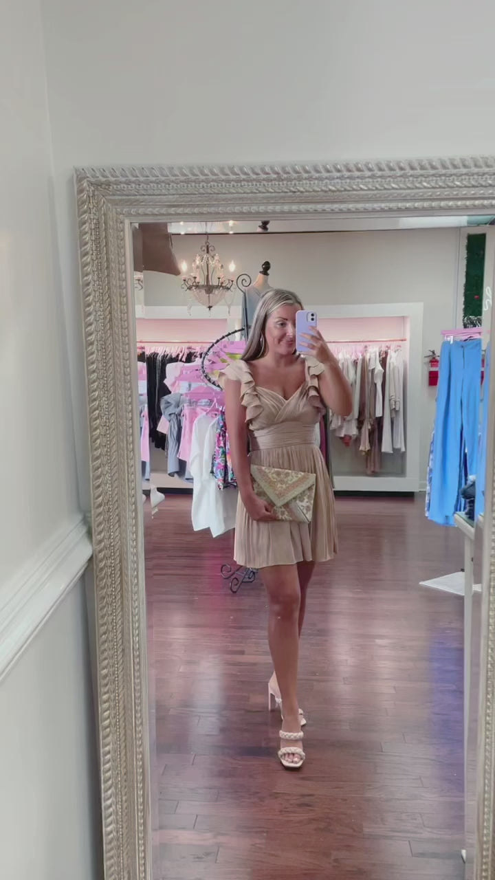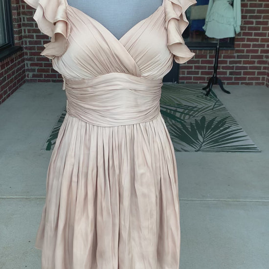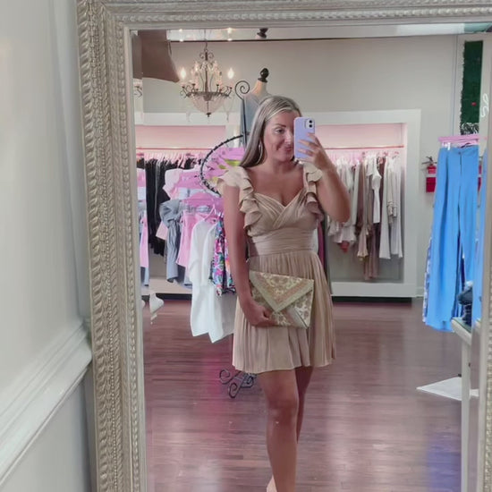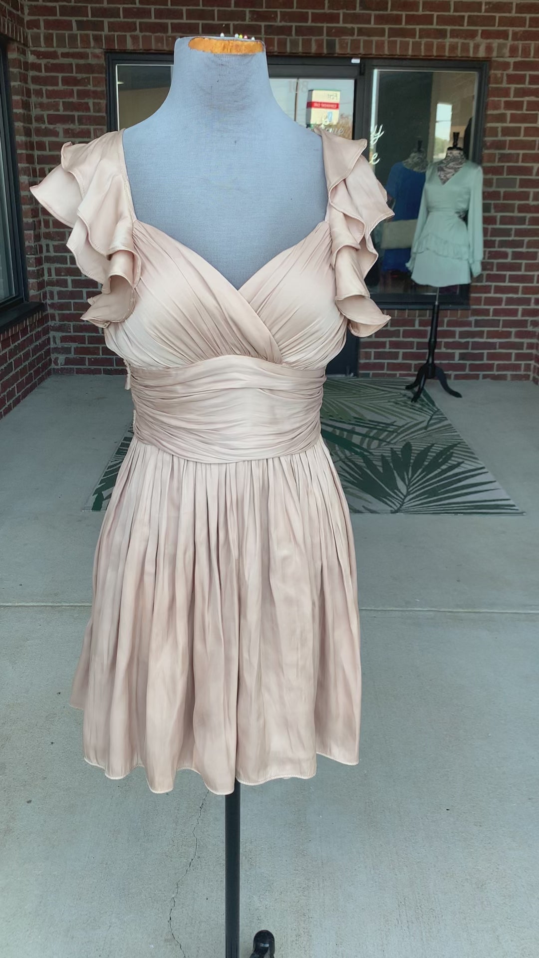 Make a night to remember in this Satin Ruffle Sleeve Mini Dress! This sleeveless stunner will bring the bling with its shiny taupe color, while the self tie detail and ruffled sleeves will have everyone's heads turning. Add a little flair with a back invisible zipper. Get ready to be the belle of the ball! (Or at least look like it!)