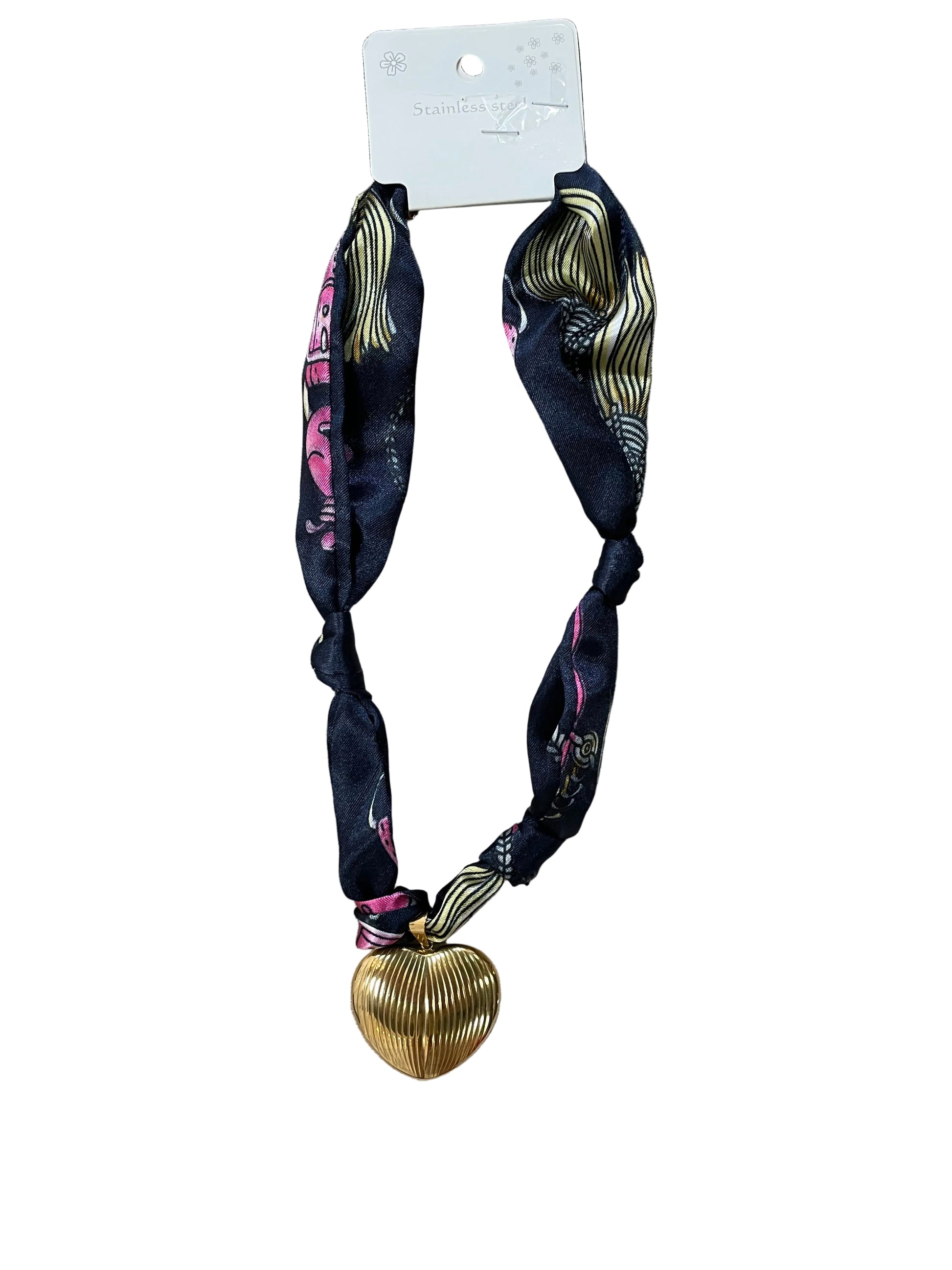 Add a touch of charm to your look with this playful gold heart necklace, featuring a soft scarf as its chain. It’s a fun twist on a classic accessory, perfect for brightening up any outfit with a pop of color and a hint of whimsy. Comfortable to wear and easy to style, it’s ideal for those who love mixing elegance with a little flair.