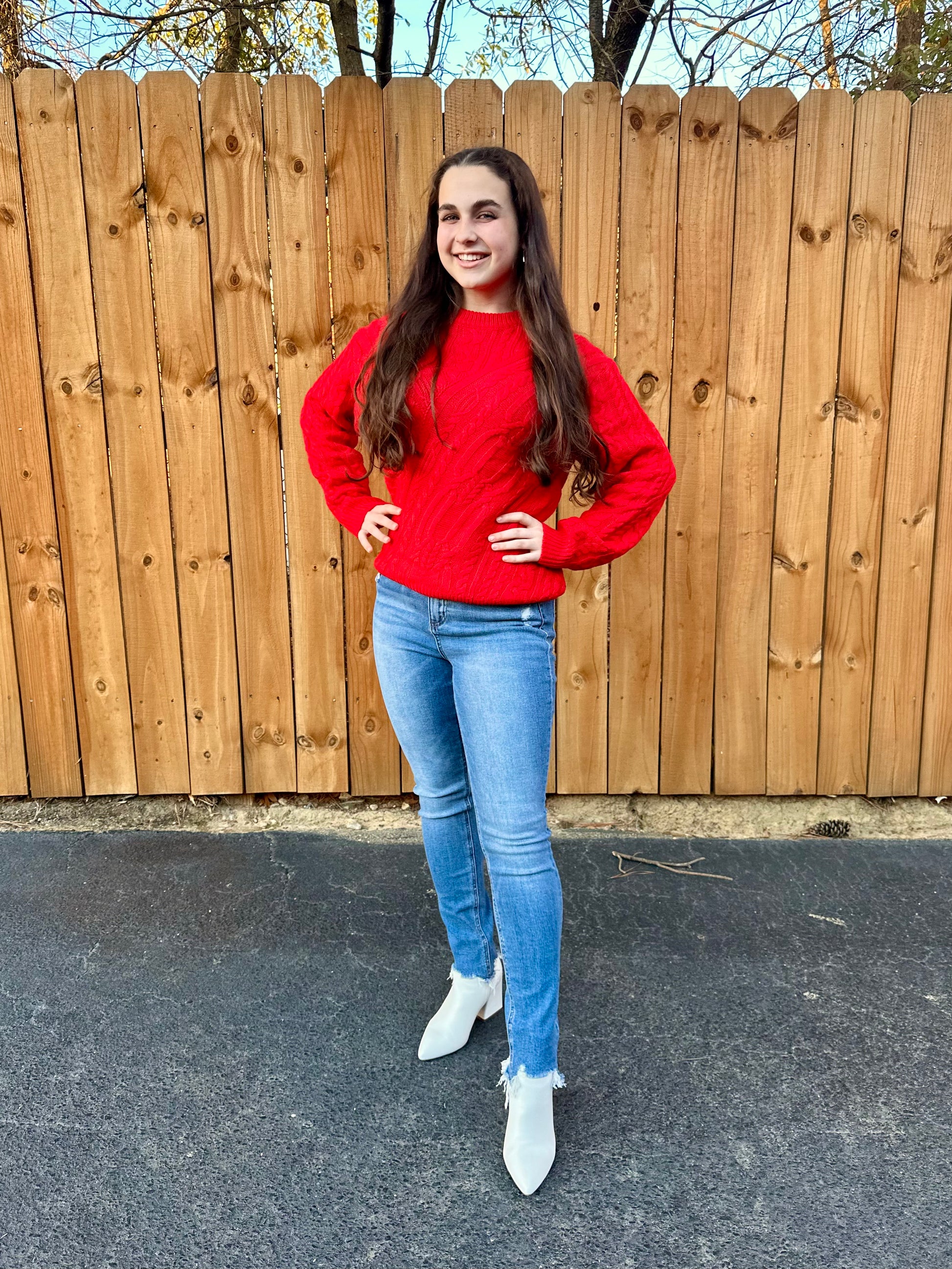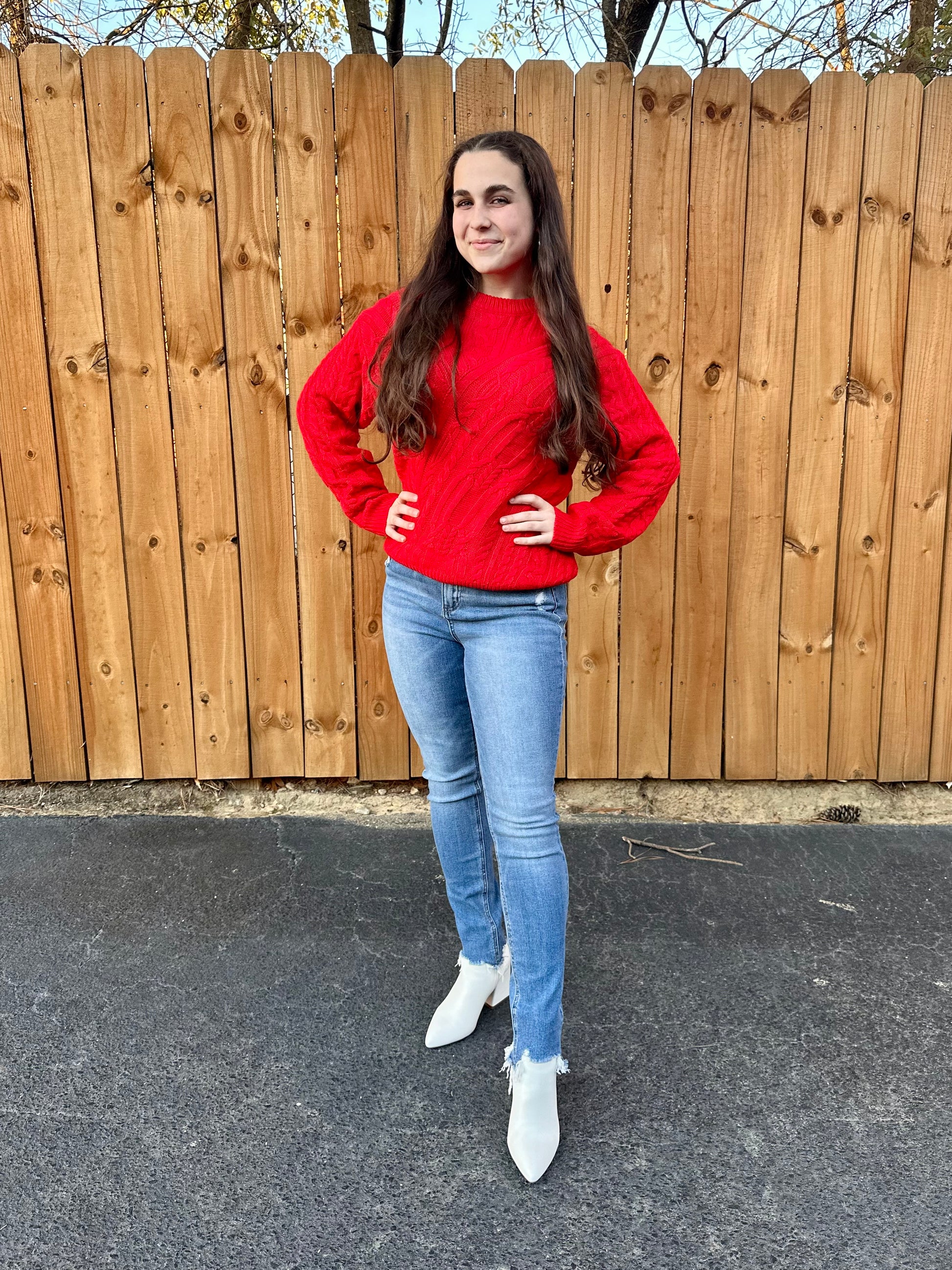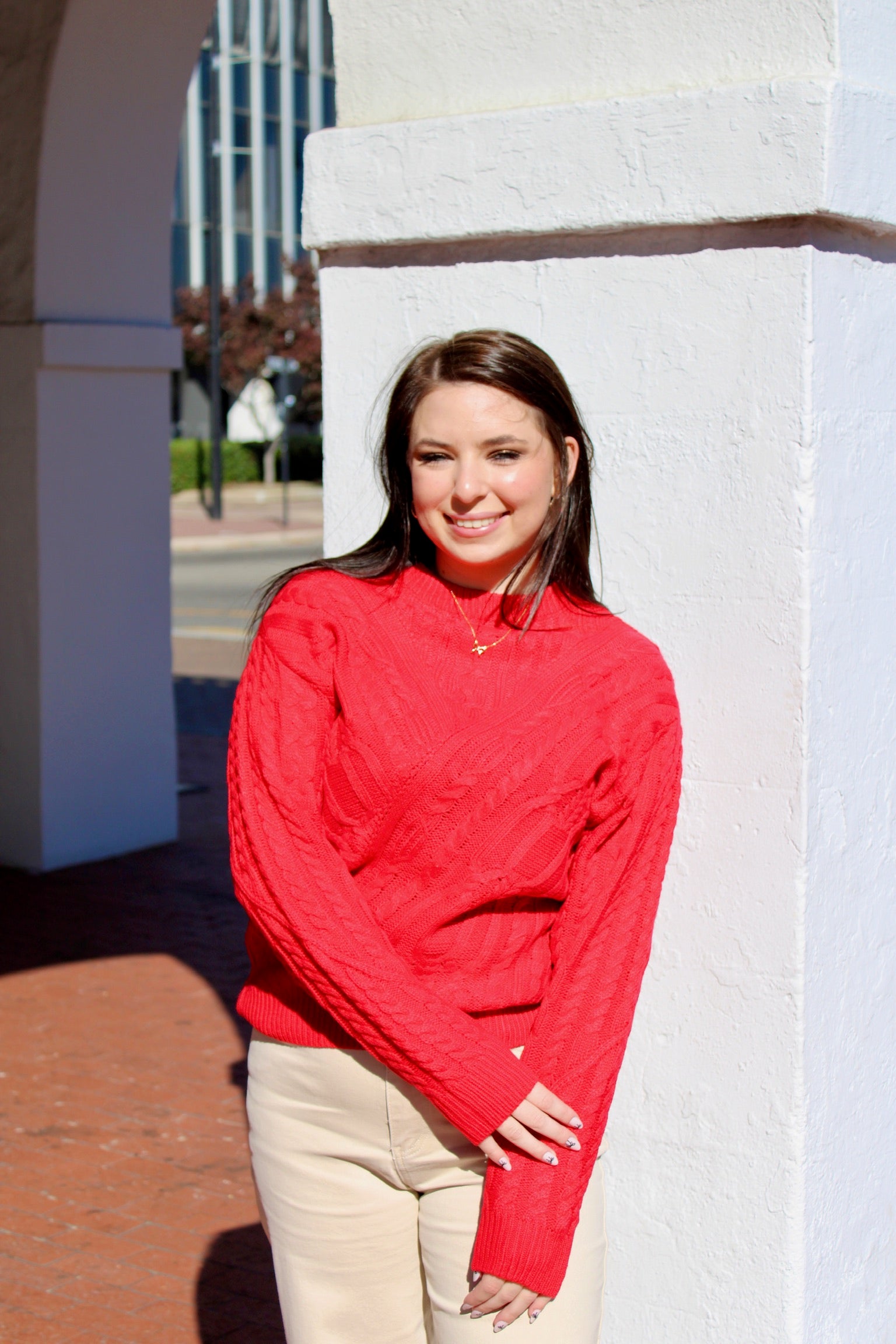 Stay cozy and stylish with the Aiden Sweater, featuring a crew neckline and diagonal chunky cable knit design. With long sleeves, drop shoulder, and a pullover style, this sweater is perfect for any occasion. The ribbed cuffs and hem add an extra touch of comfort and the french red color adds a pop of color to your wardrobe. Order now!