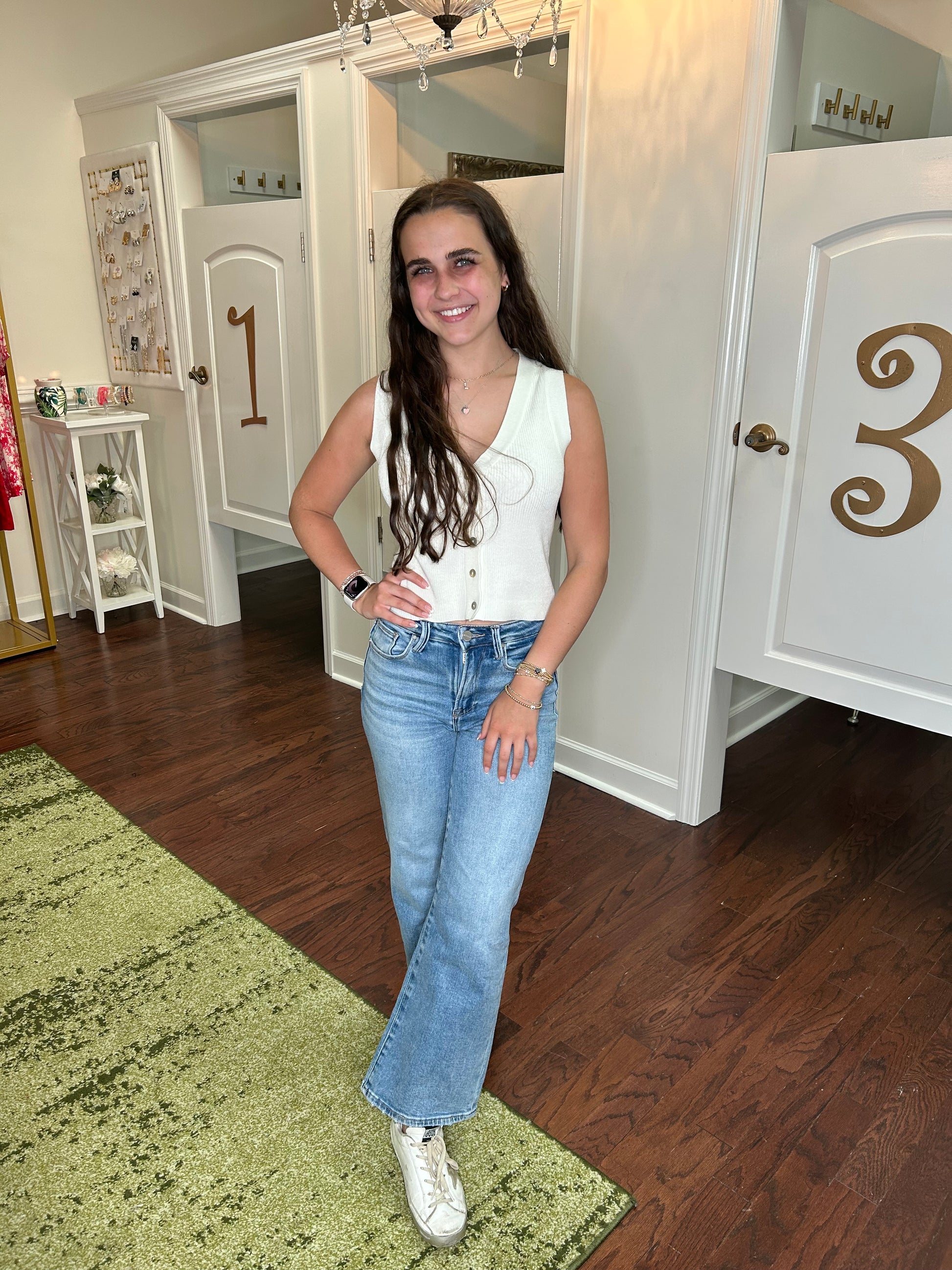 Be effortlessly chic in our Alexis Top! This solid tank top features a playful V-neckline and quirky button down front. Its ribbed texture adds an element of fun, while the cropped length keeps it on-trend. Made with 55% cotton and 45% acrylic for ultimate comfort. (Cotton-picking fabulous!)