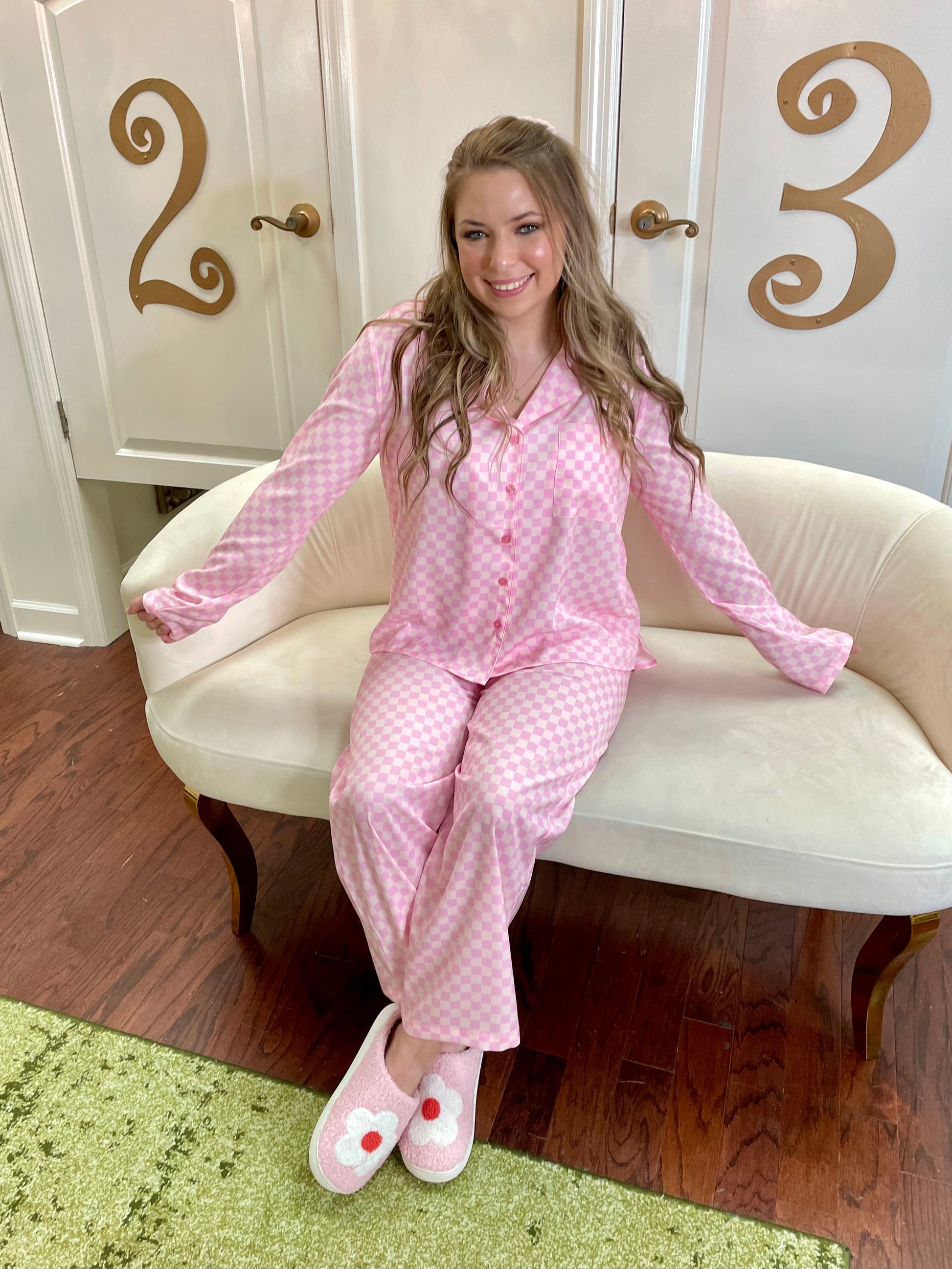 Get cozy with our All Things Cozy Set! The checker printed long sleeve blouse top has a button down front, collared neckline, and a front chest pocket. The high-low design adds a touch of style. The checker printed pants feature an elastic waistband for comfort, a straight leg style for versatility, and a flowy, lightweight fabrication for breezy wear. Made of 100% polyester in a charming baby pink color. So cute, you'll want to live in it!