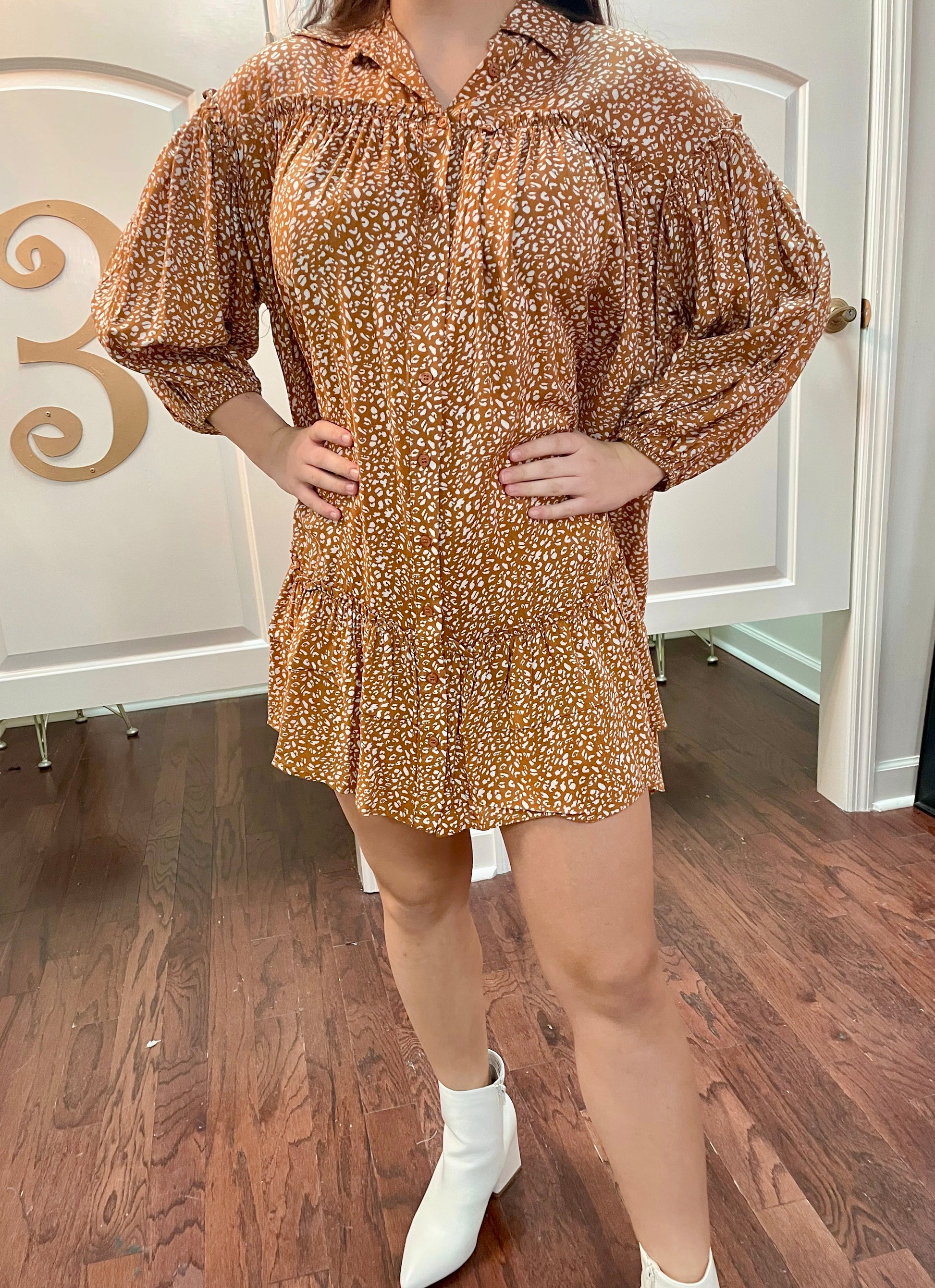 Be the wild one in the Alexis Shirt Dress! This comfy collared cutie has all the animal print and ruffles you could dream of – plus statement bubble sleeves to make a serious style impact. Take your pick from two color options and make it your own!