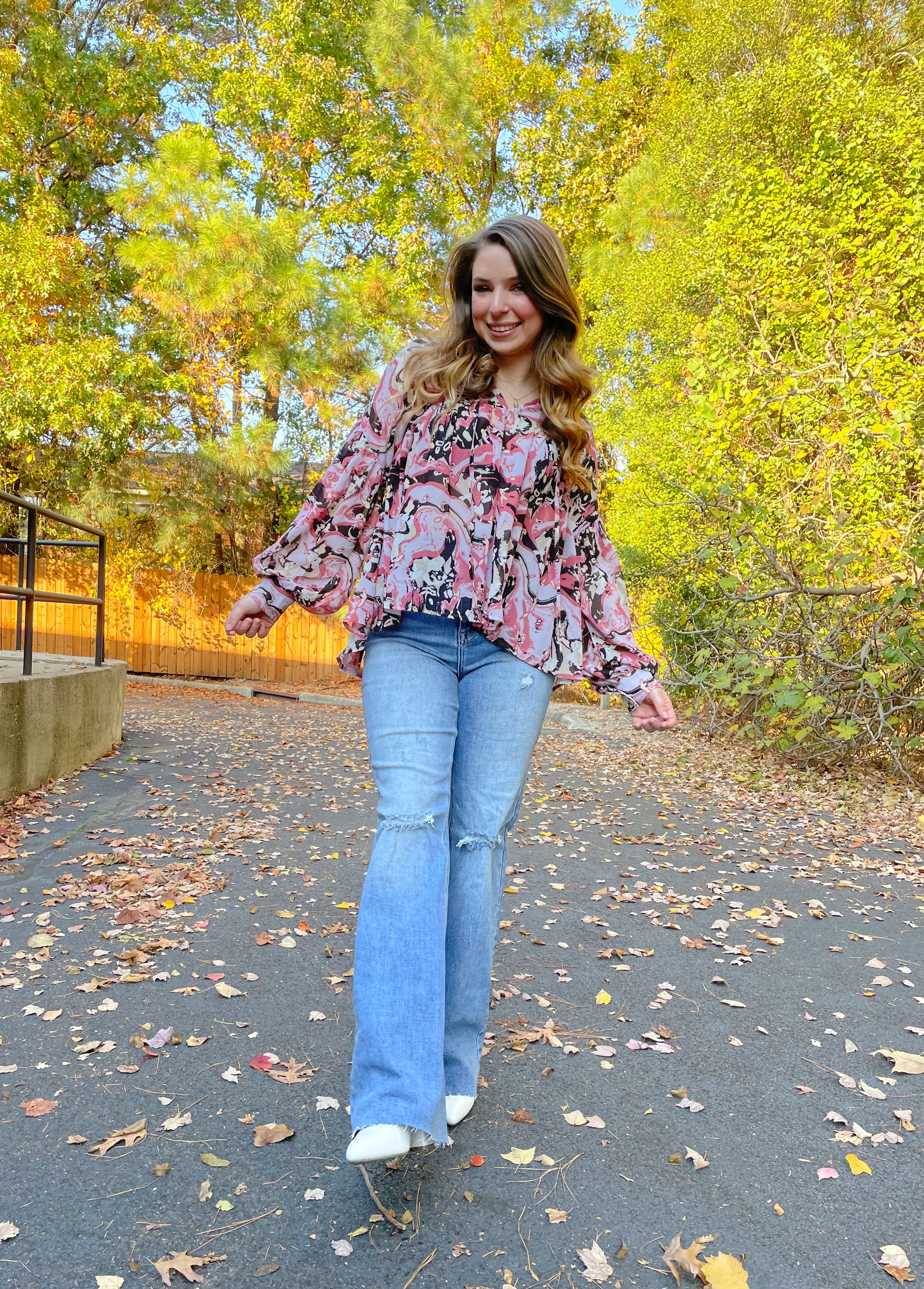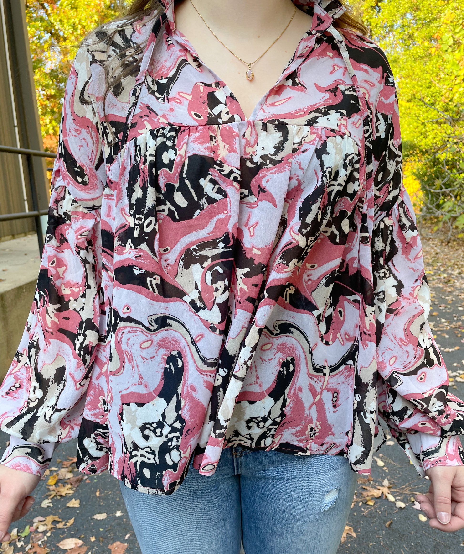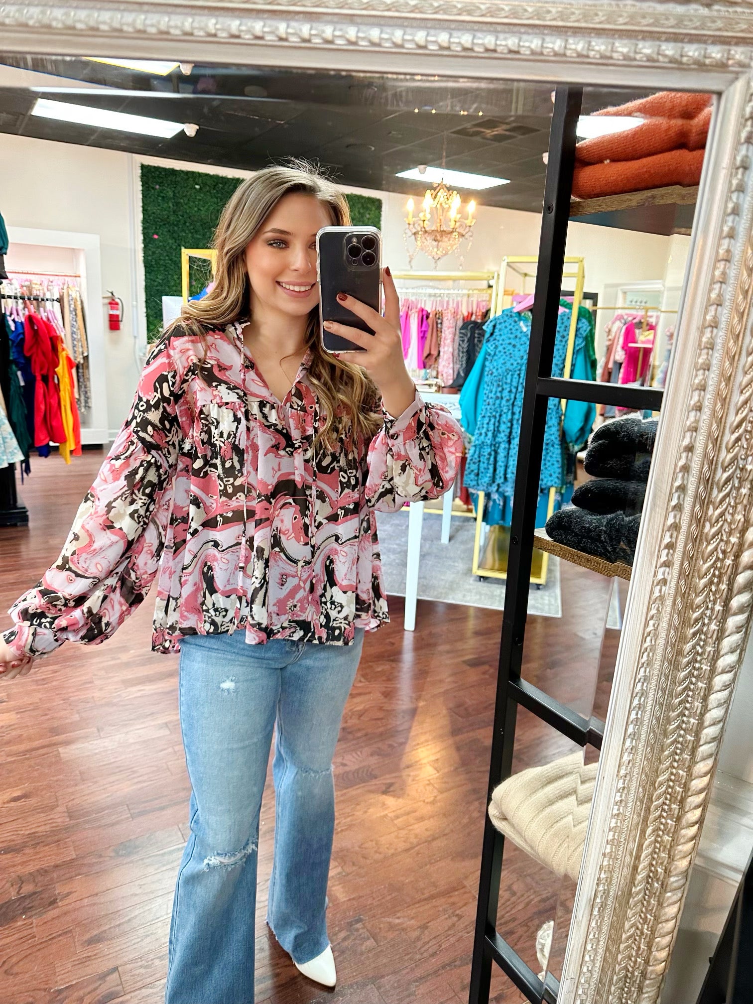 Take your look to the next level with the Arlington Top! This delightfully marbled, 100% polyester blouse is the perfect amount of flowy. Show off your style with the ruffled v-neckline and buttoned cuffs, and let the tie closure pinch your look in the right places. Show off your sass and class with the Arlington Top!