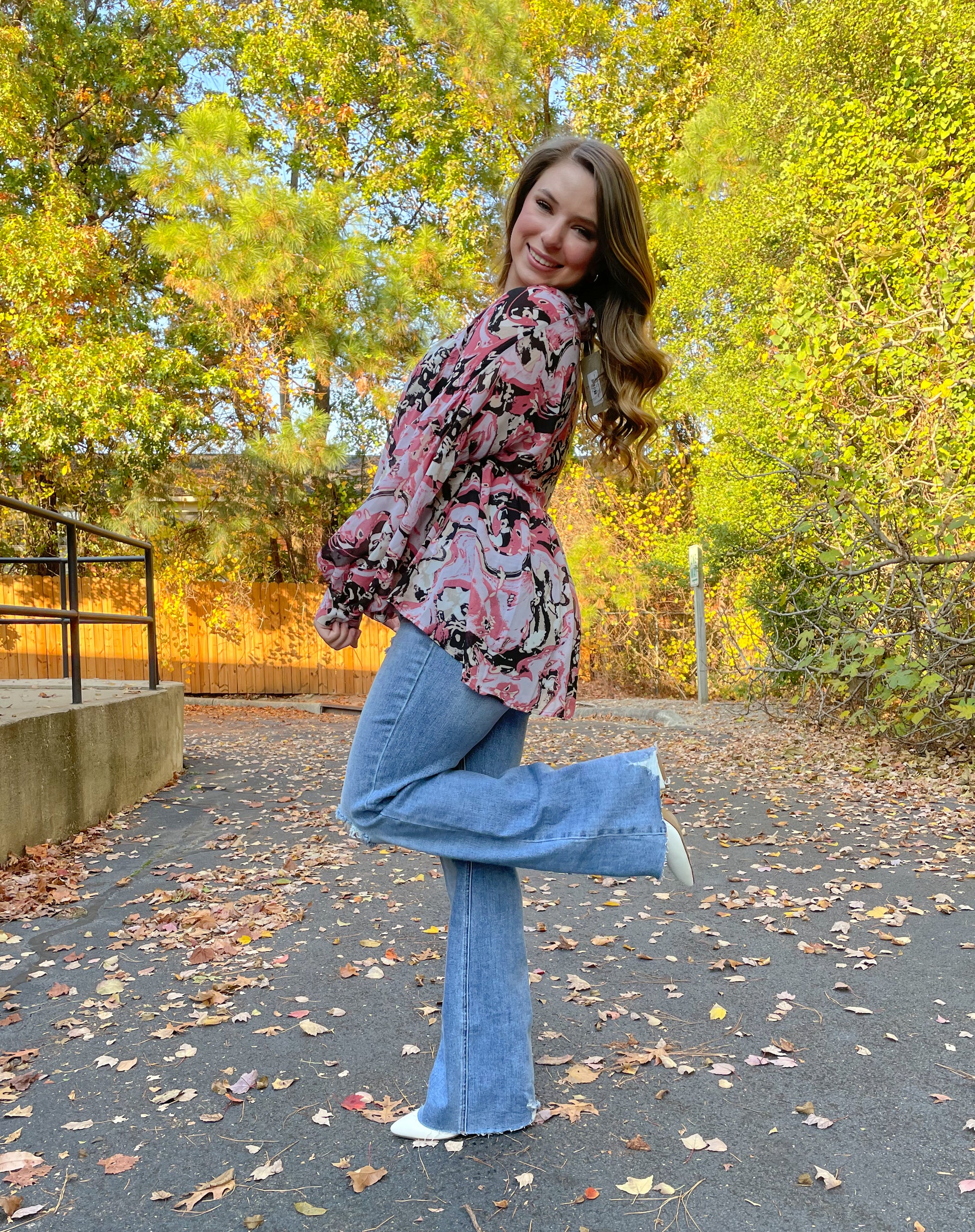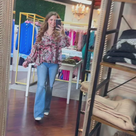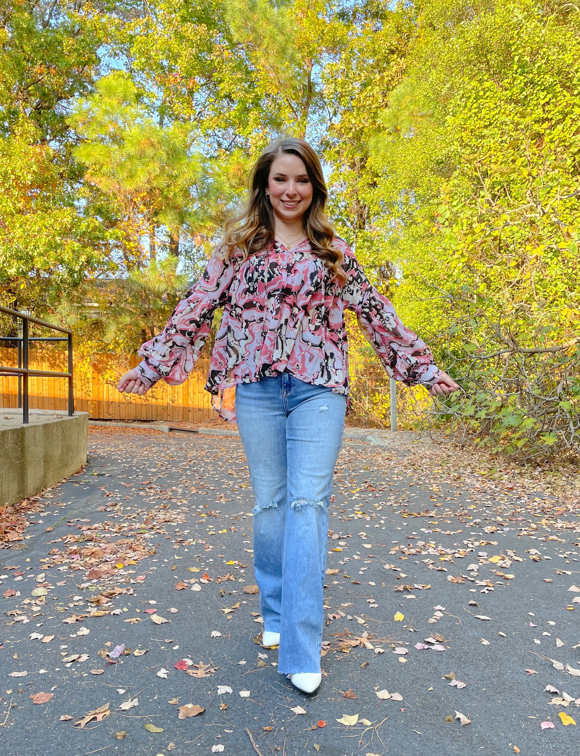 Take your look to the next level with the Arlington Top! This delightfully marbled, 100% polyester blouse is the perfect amount of flowy. Show off your style with the ruffled v-neckline and buttoned cuffs, and let the tie closure pinch your look in the right places. Show off your sass and class with the Arlington Top!