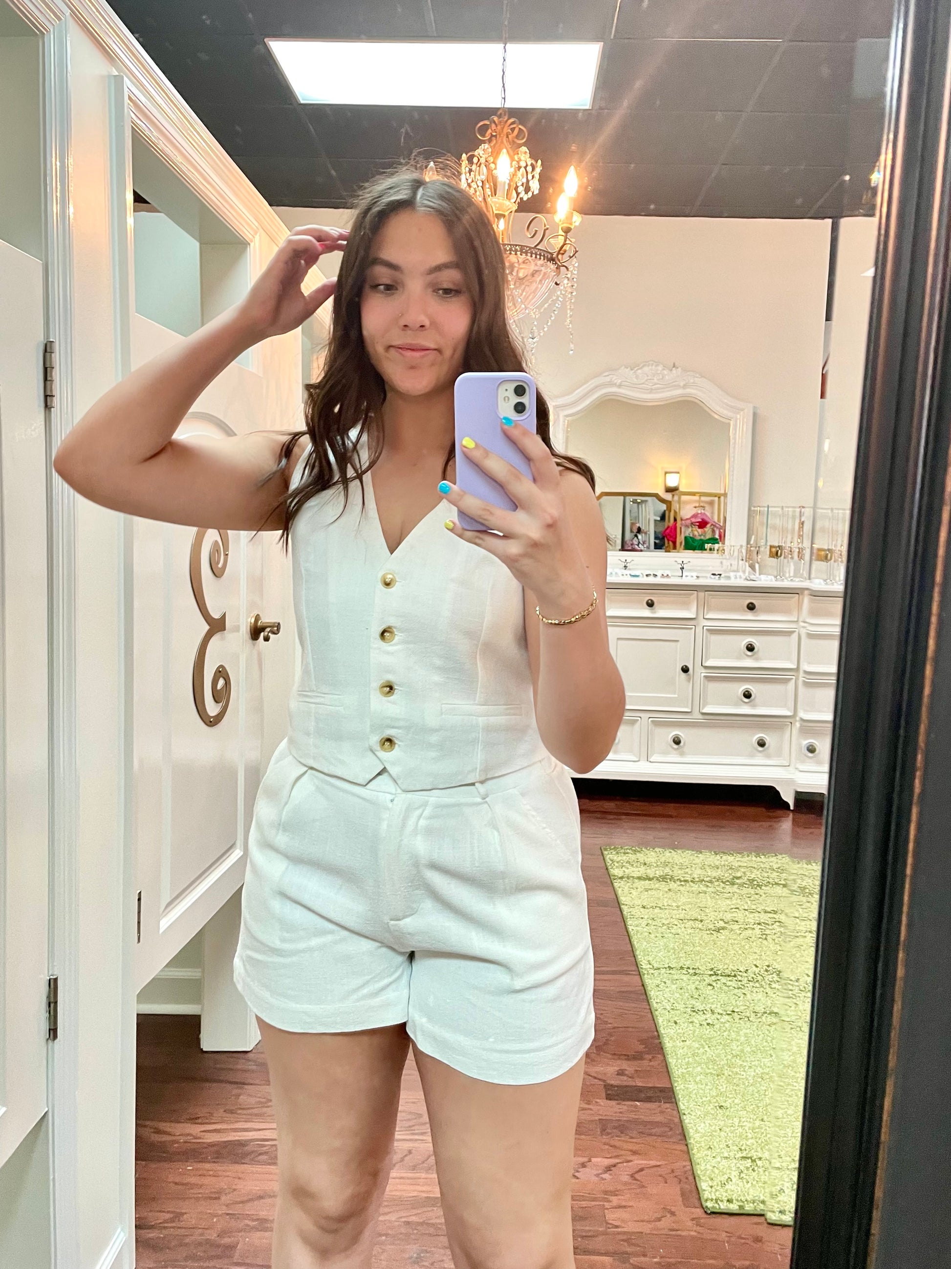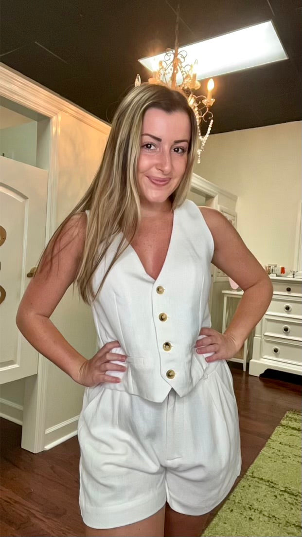 Be both stylish and playful in the August Vest! Made from a luxurious mix of 70% rayon and 30% linen, this button down vest comes in a chic off-white neutral color. Match it with the August Shorts for a fun and quirky ensemble.