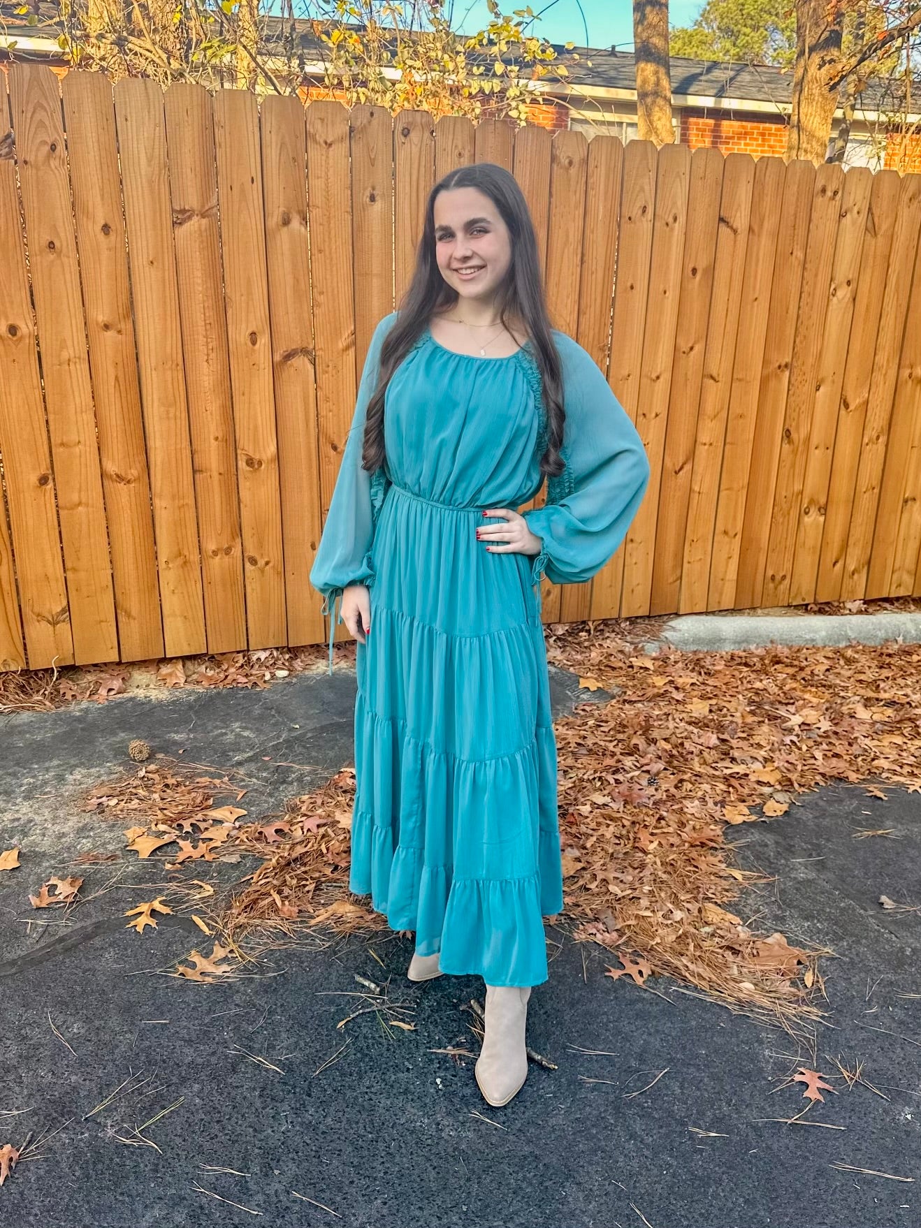 Add some play to your wardrobe with our Belmont Dress! Its cute tiered ruffle sleeves and Myrtle green color will bring a fun twist to any outfit. With a comfy elastic waist and raglan long sleeves with an elastic cuff and tying detail, you'll feel both cute and comfortable. Top it off with the flattering round neckline, back keyhole with button closure, and ruffle trim on the sleeves, this dress is a no brainer. 100% polyester for easy care!
