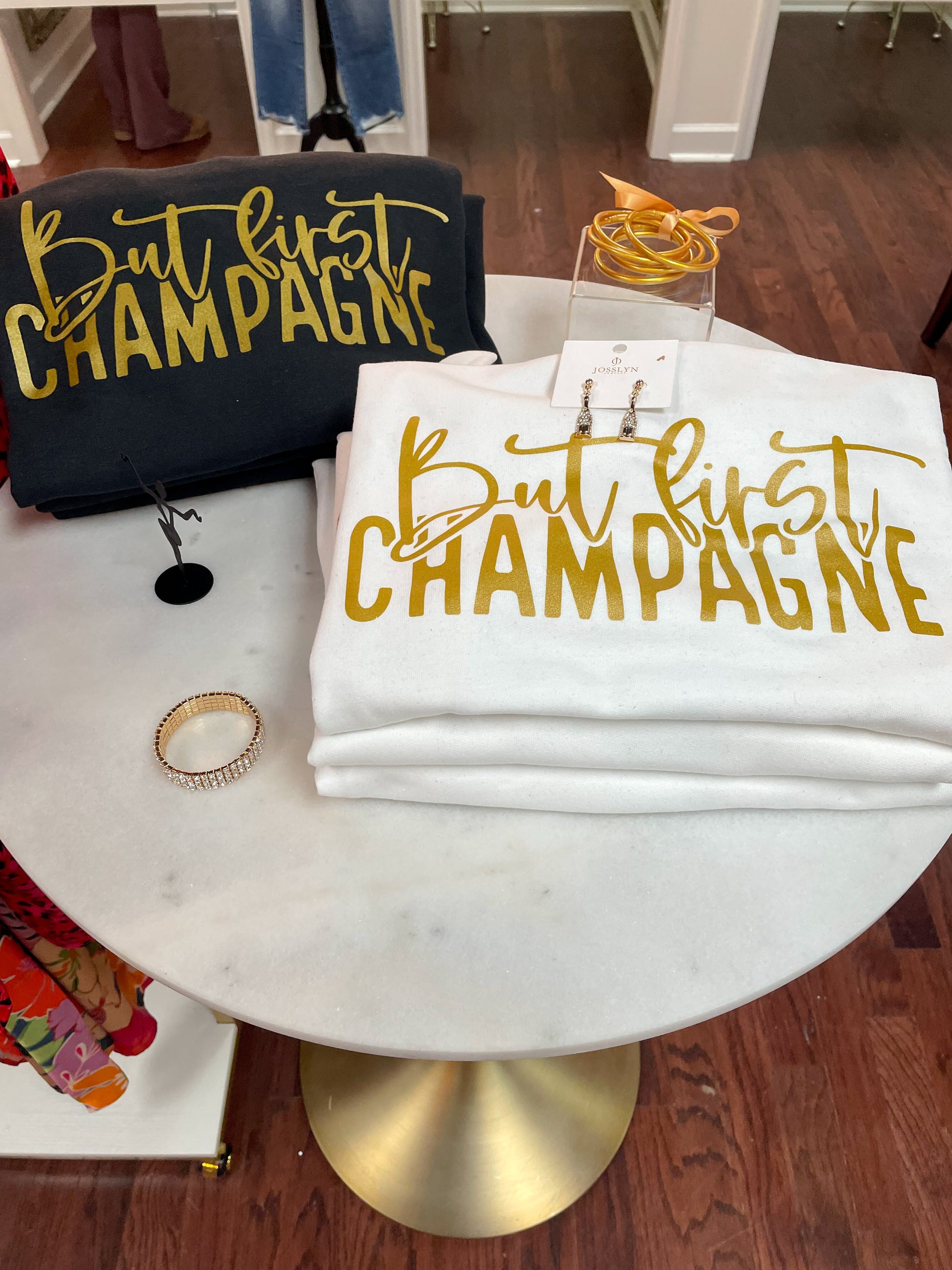 This But First Champagne Sweatshirt is the perfect mid-layer for any occasion! Whether you're curling up on the couch for a movie night or heading out for a night on the town, you'll stay comfy and cozy with its classic crew neckline and two color options. So go ahead, with its sleek metallic gold lettering, let everyone know that champagne comes first!