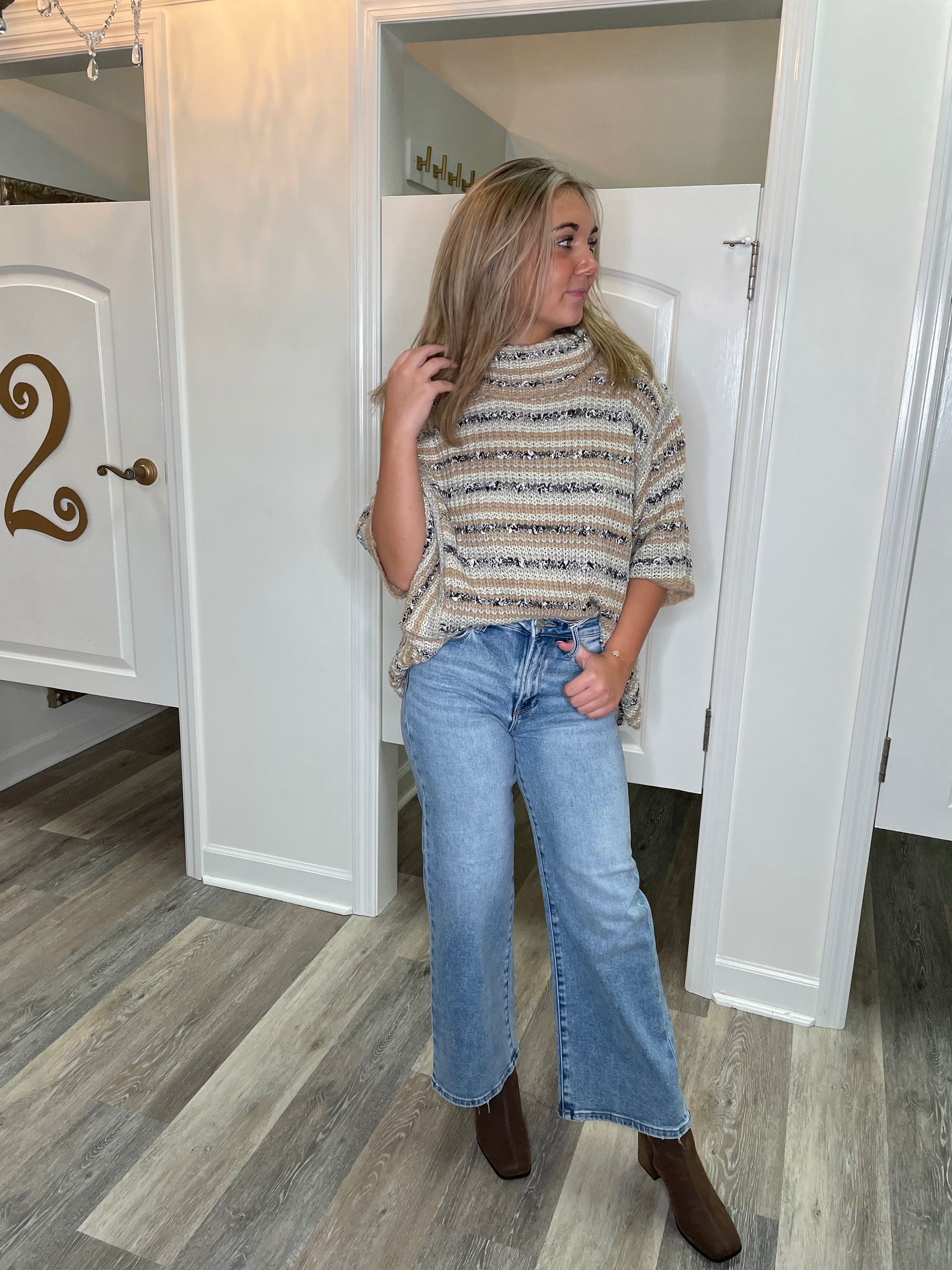 Cozy meets chic in the Cathlena Sweater! This striped boucle beauty features a soft ribbed turtleneck and short dolman sleeves, creating a relaxed, boxy fit that’s perfect for layering. The unique directional seaming brings out the textured knit, making every outfit pop with warmth and style. Crafted from a comfy blend of polyester, acrylic, nylon, and a touch of wool, it’s your new go-to for playful, elevated cool days.
