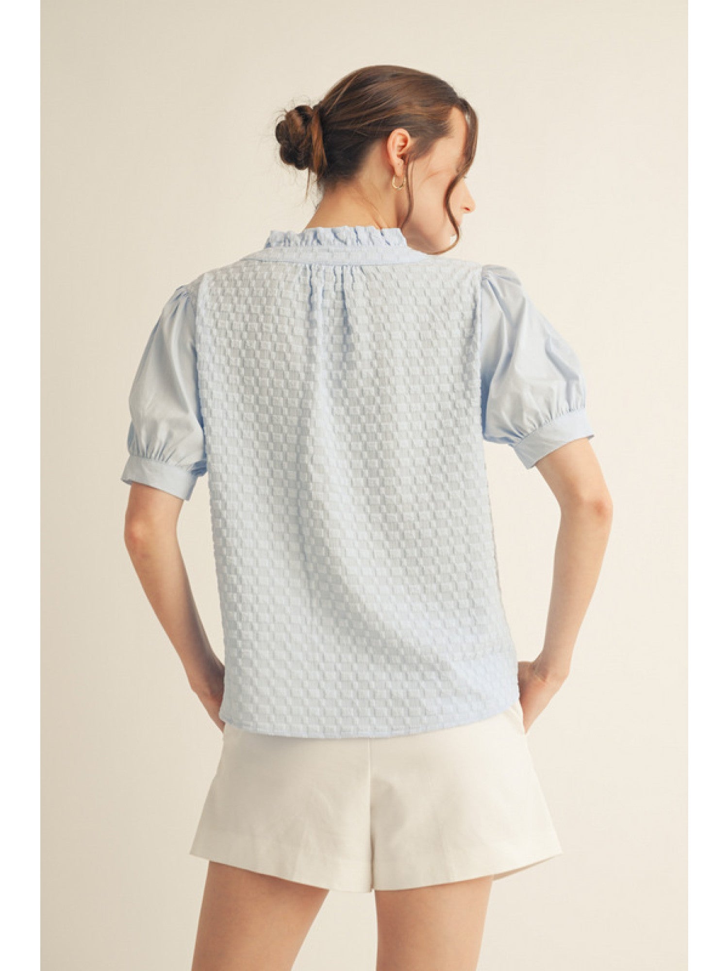 Get ready to rock your style with our Short Puff Sleeves Top! Featuring a textured fabric, buttoned v-neckline, and ruffled neck detail, this top is perfect for any occasion. Plus, its non-sheer and lightweight material makes it a must-have for your wardrobe. Feel confident and chic with this top!