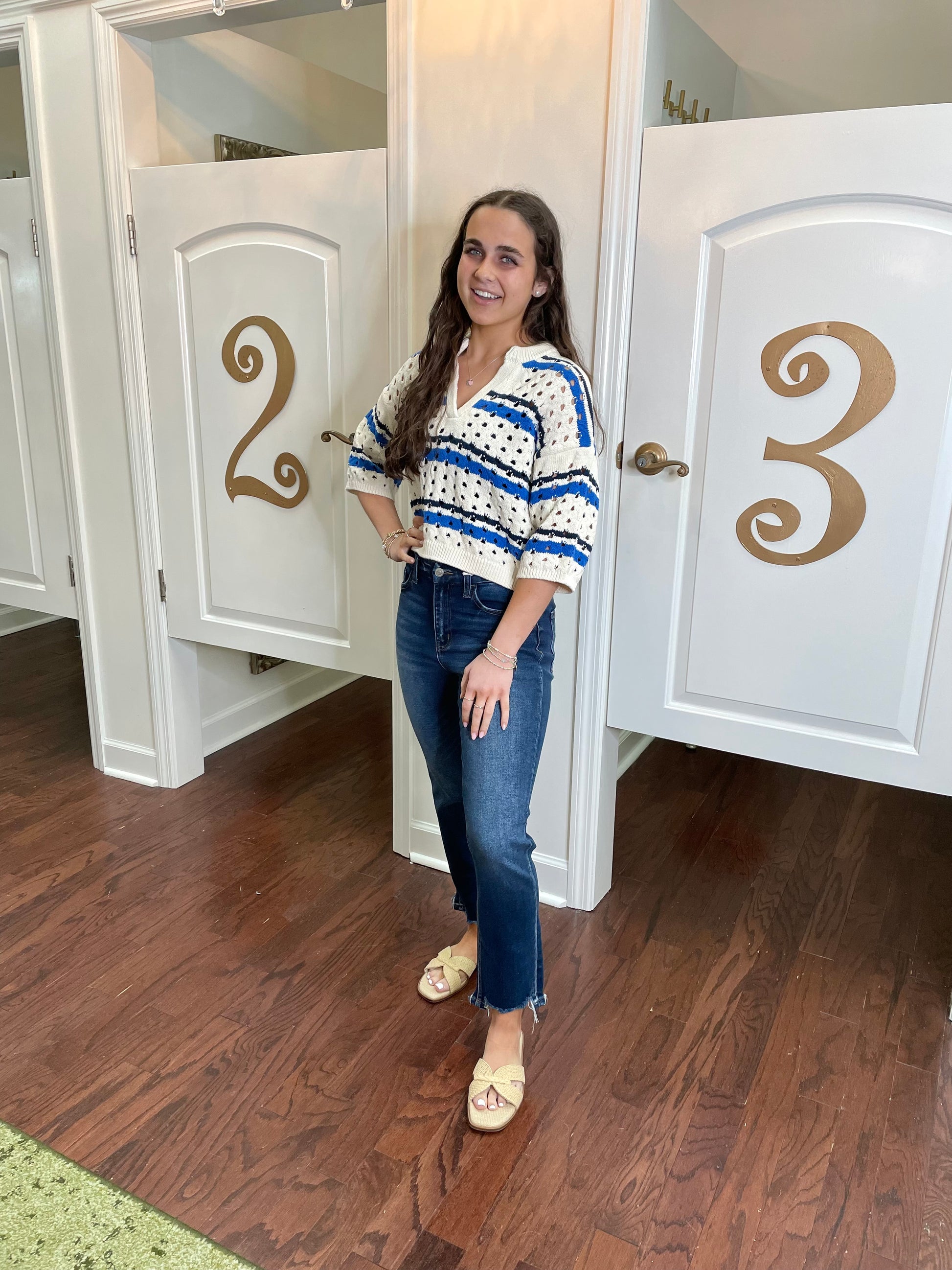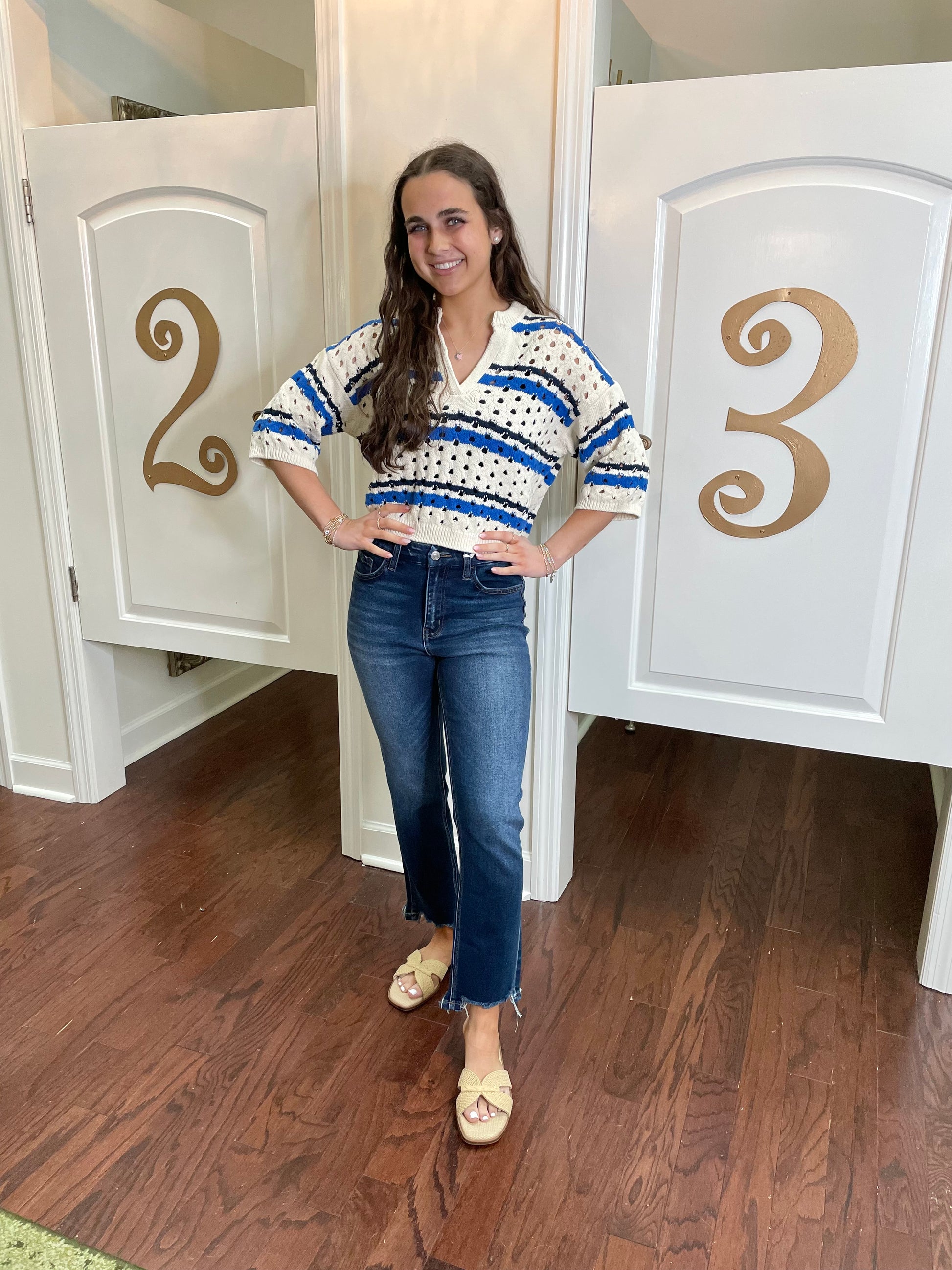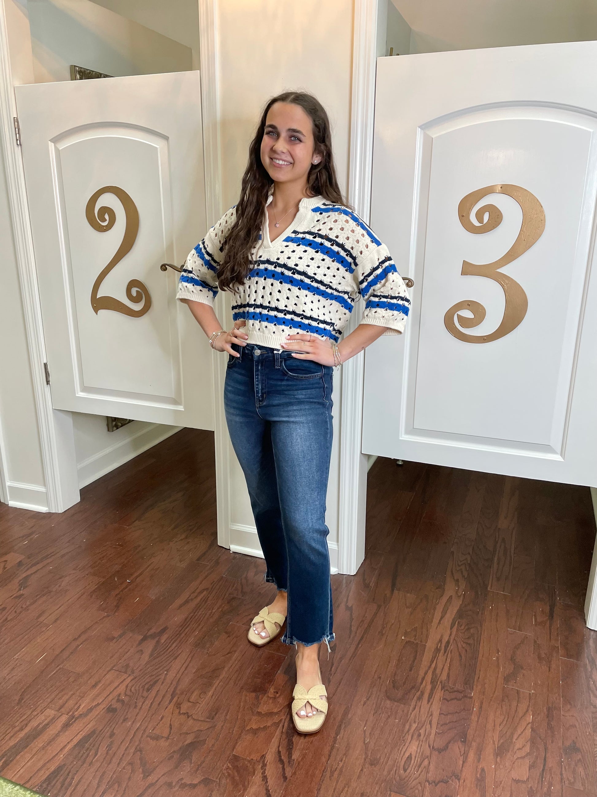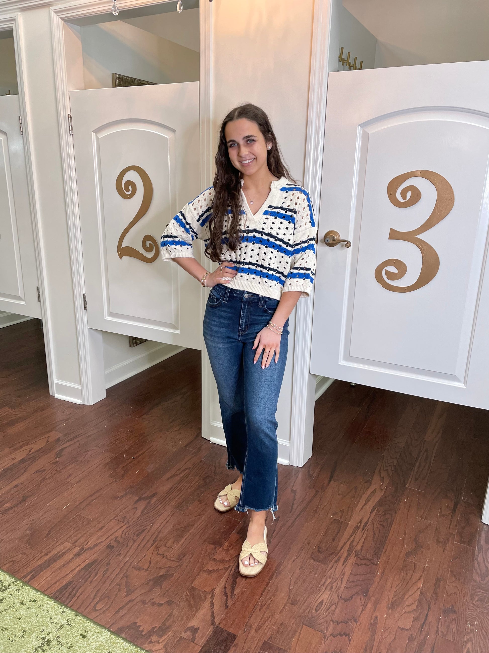 Stay stylish in our Ciao Bella Sweater! Featuring a striped crochet design and half sleeves, this top will elevate your look. With a shoulder crochet split neck and dropped shoulder details, it's the perfect combination of cozy and chic. Made with 100% cotton for ultimate comfort.