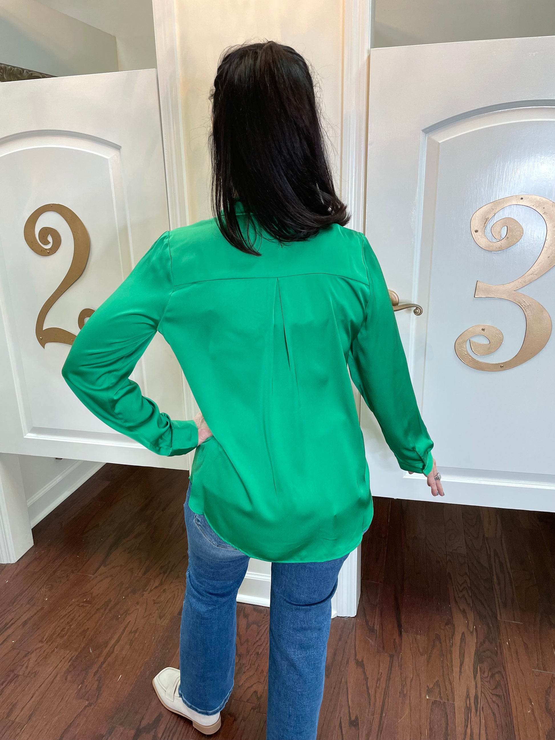This Classic Button Down Top is the ultimate versatile piece. Made from certified recycled materials, it features a pointed collar, button placket, and relaxed fit. The pleated back adds a touch of elegance and enhances the easy drape. Perfect for any season, this stylish and sustainable top will elevate your wardrobe!