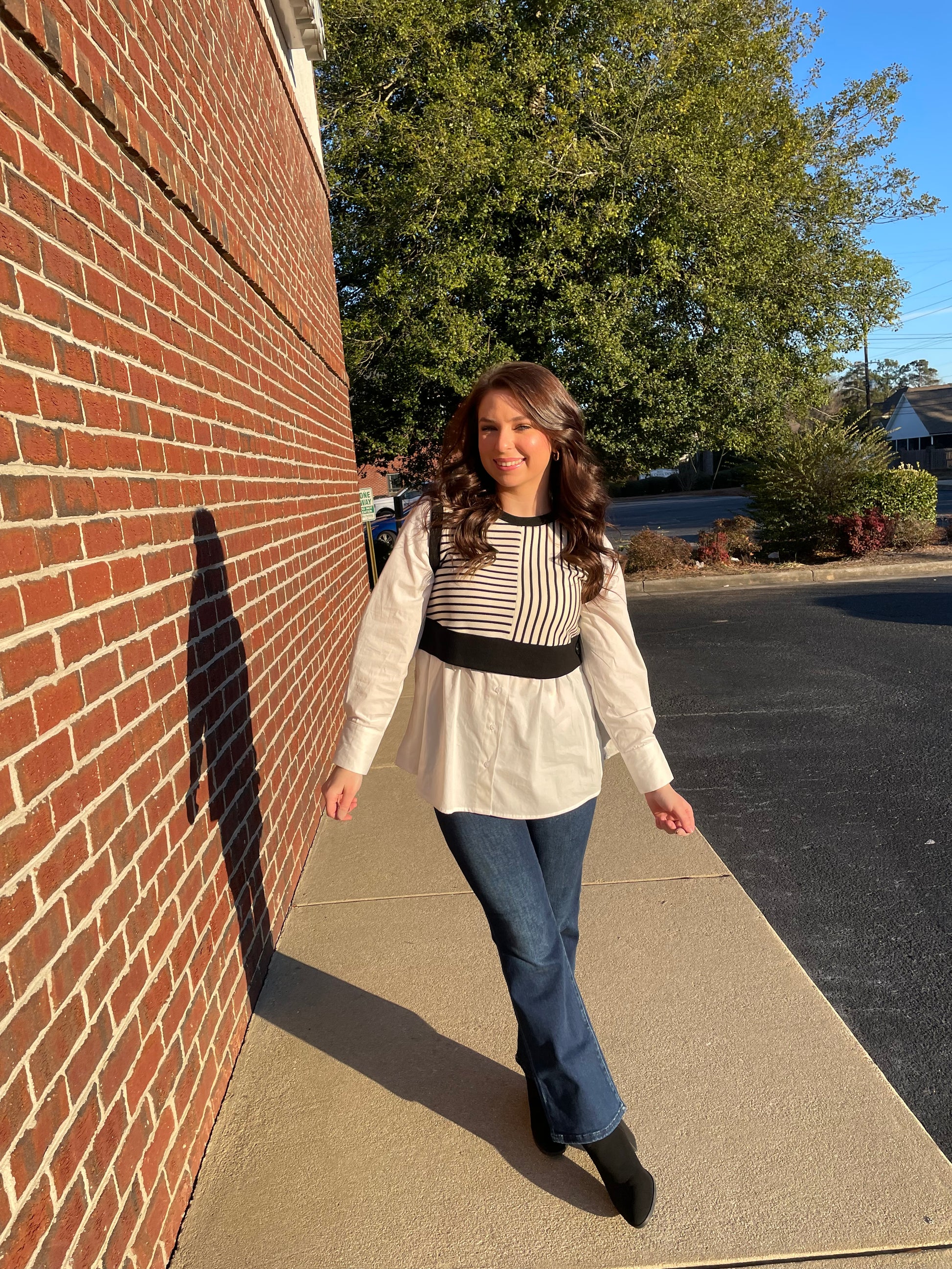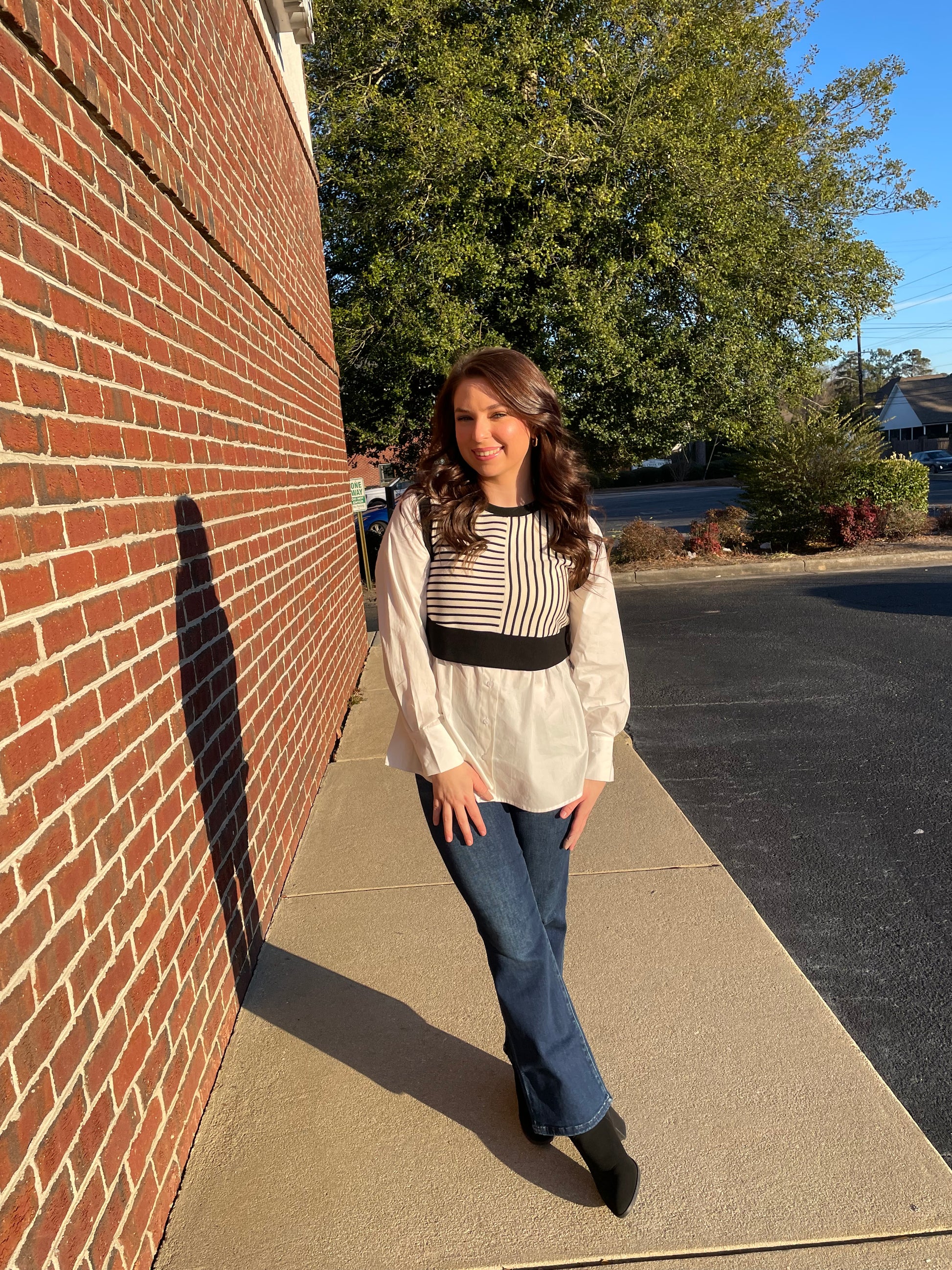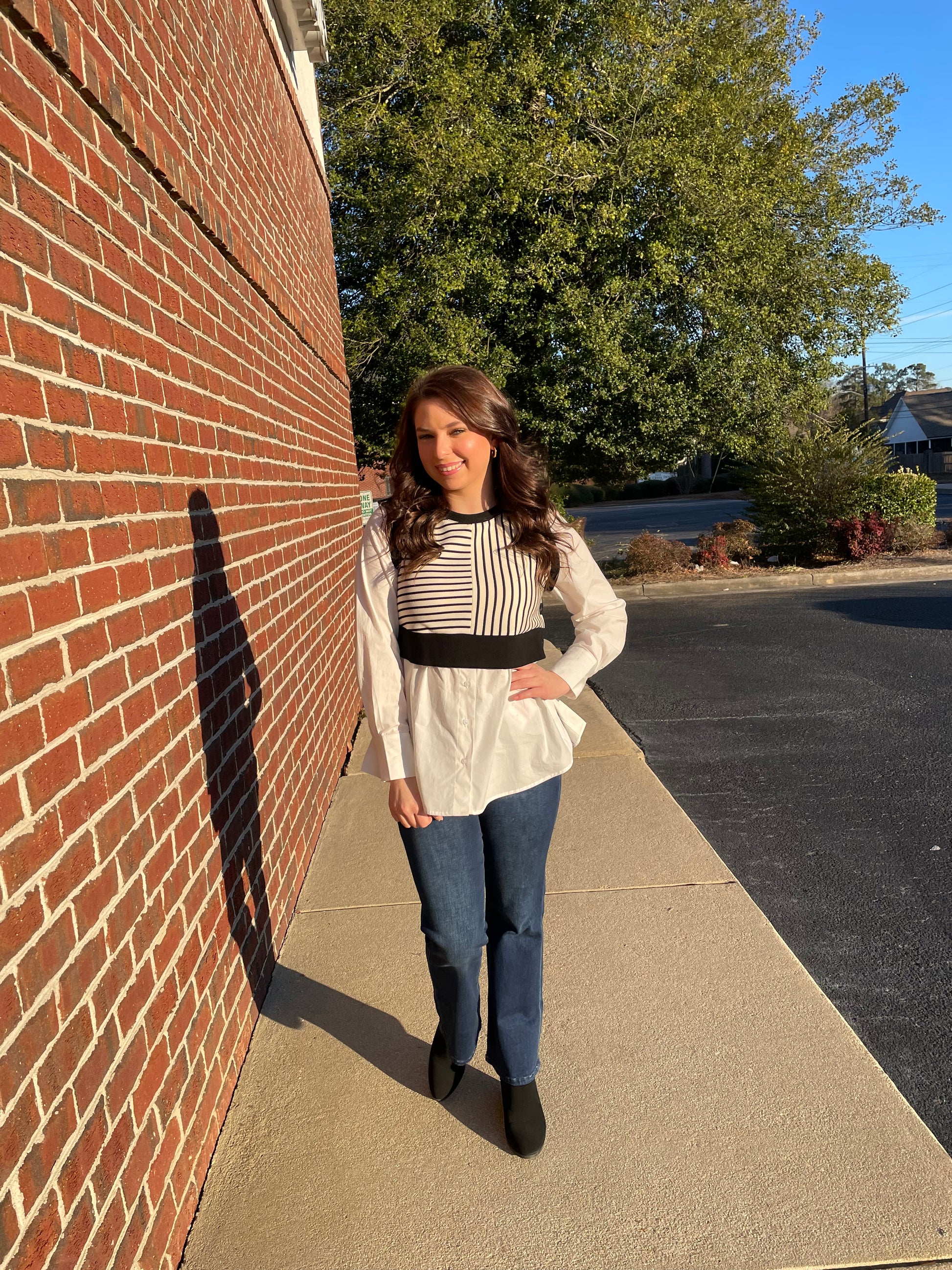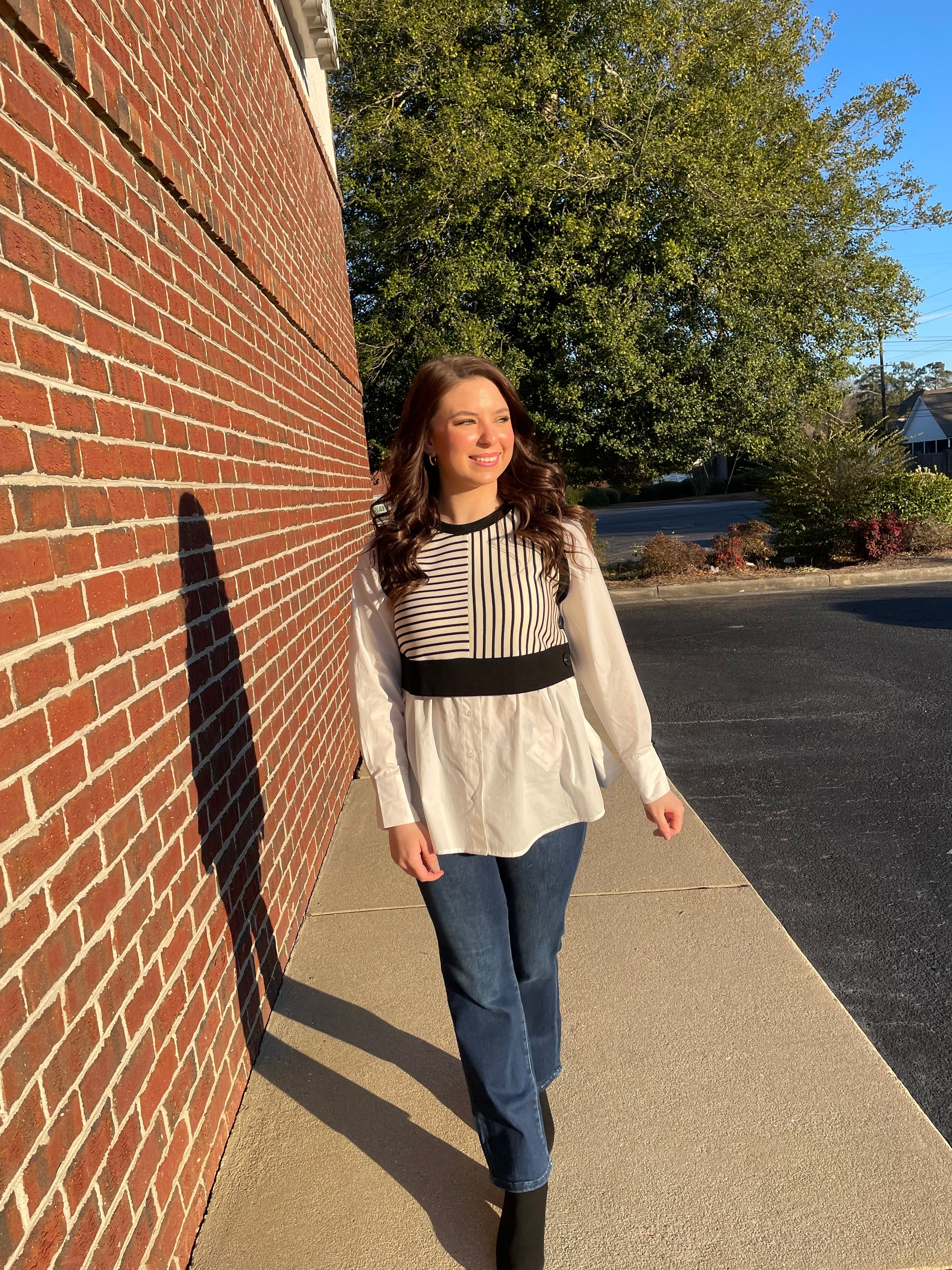 Get the best of both worlds with the Daniella Top. This unique piece combines a classic white button-up shirt with a playful black and white striped vest overlay. The deep side slits and side button accents add a touch of modern flair, while the polyester and cotton blend guarantees all-day comfort.