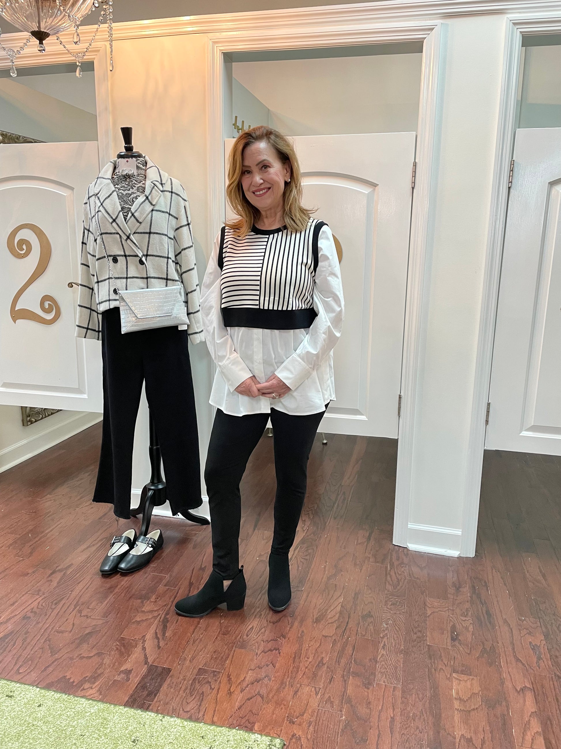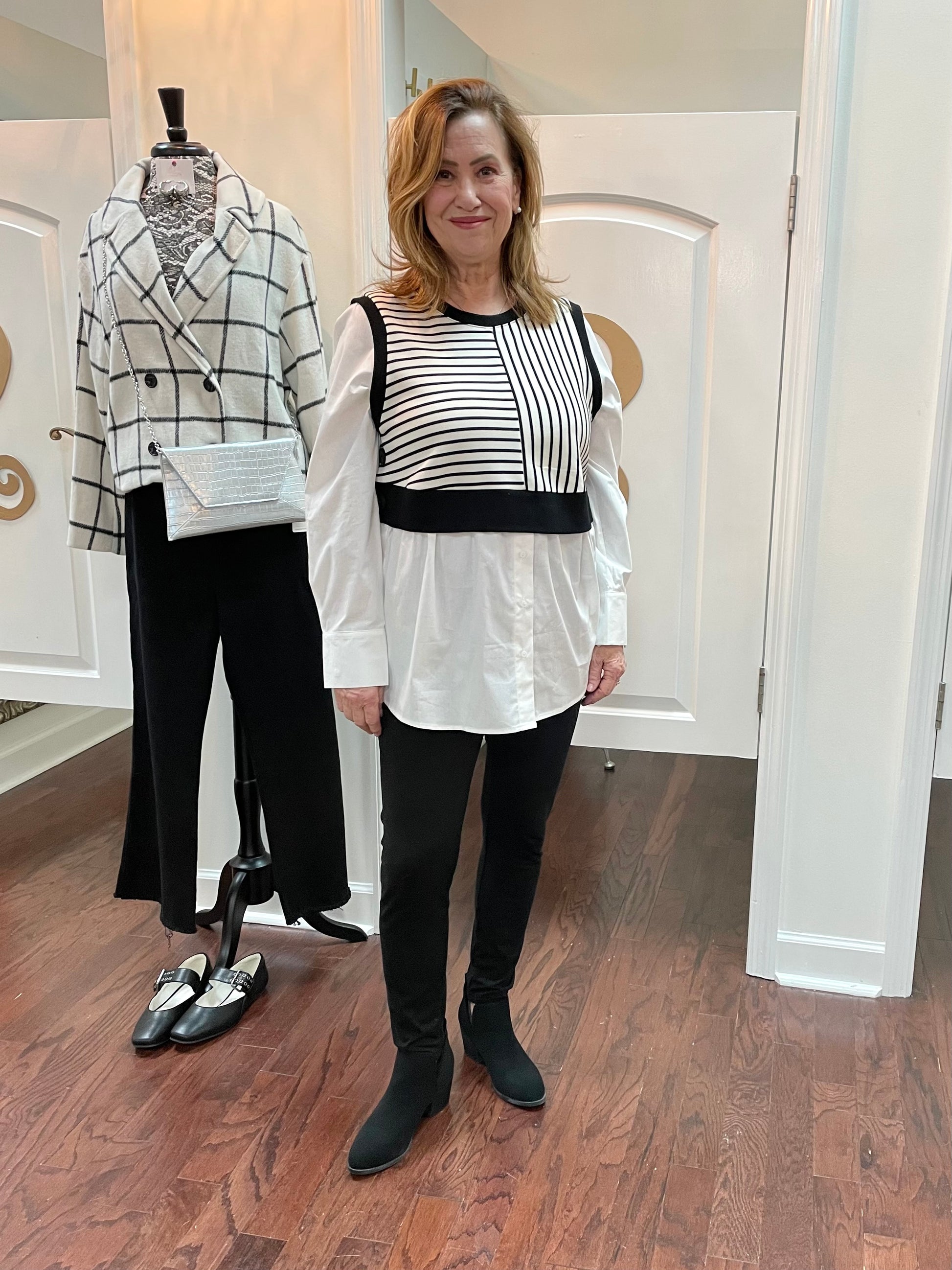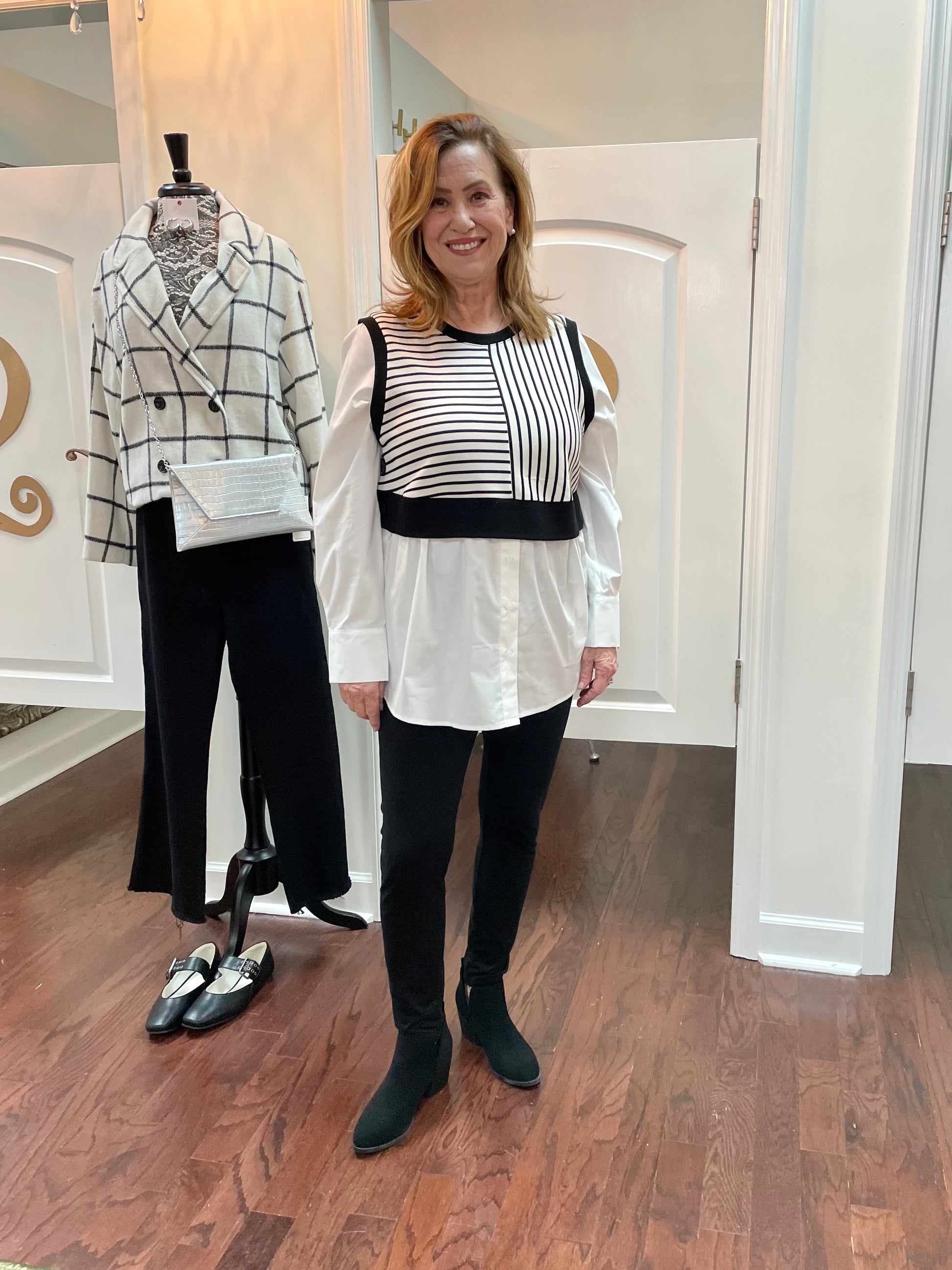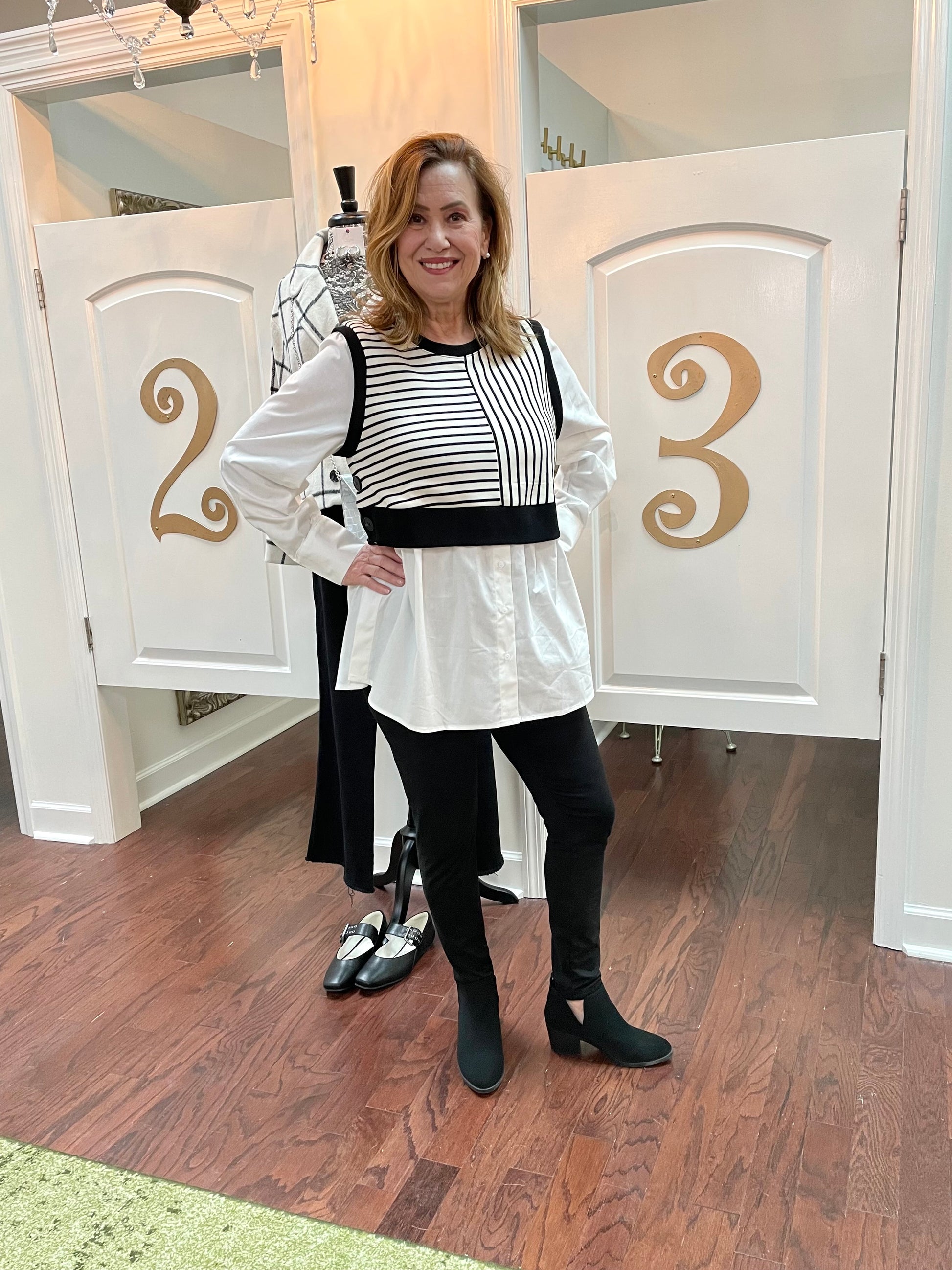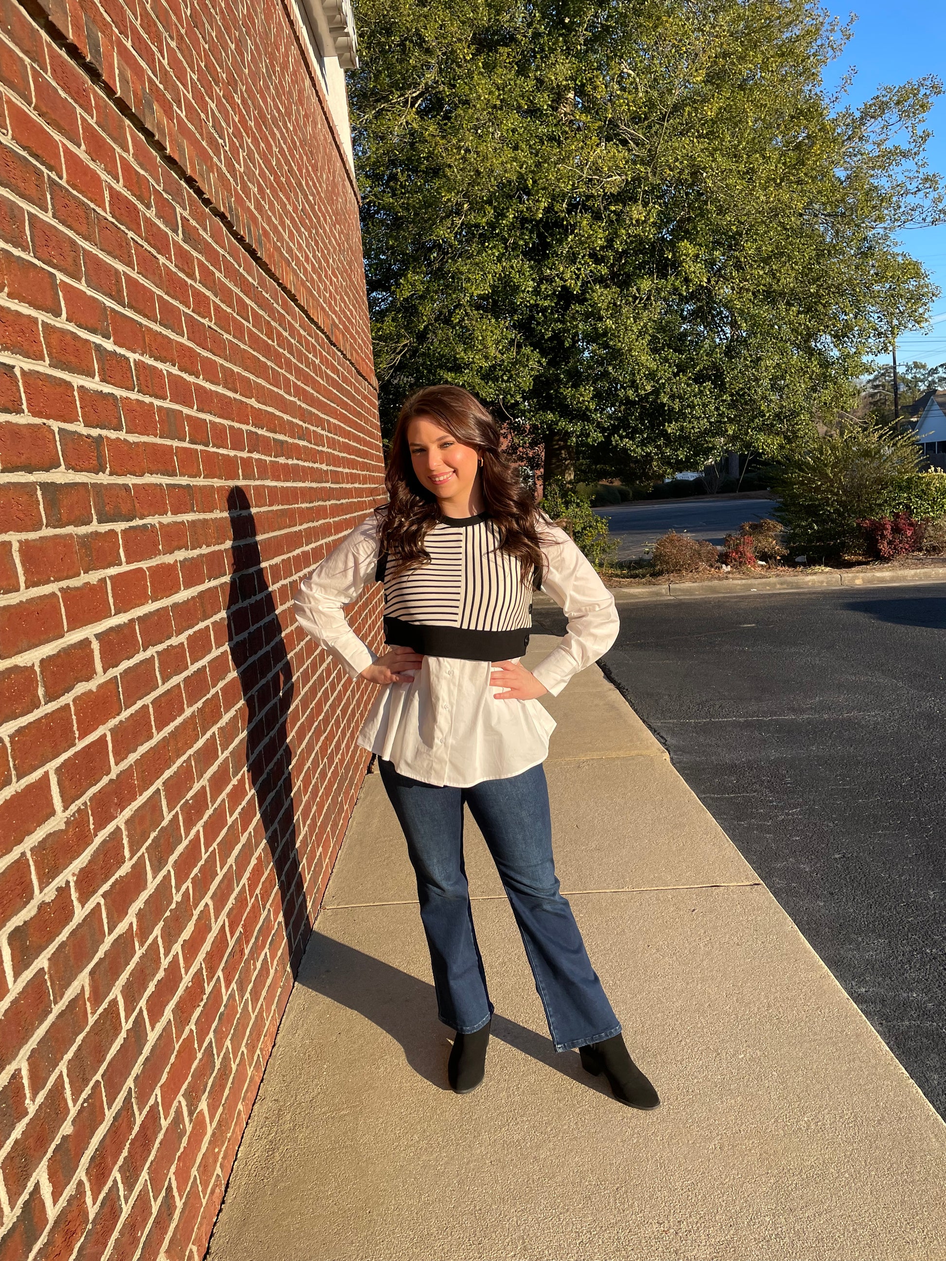 Get the best of both worlds with the Daniella Top. This unique piece combines a classic white button-up shirt with a playful black and white striped vest overlay. The deep side slits and side button accents add a touch of modern flair, while the polyester and cotton blend guarantees all-day comfort.