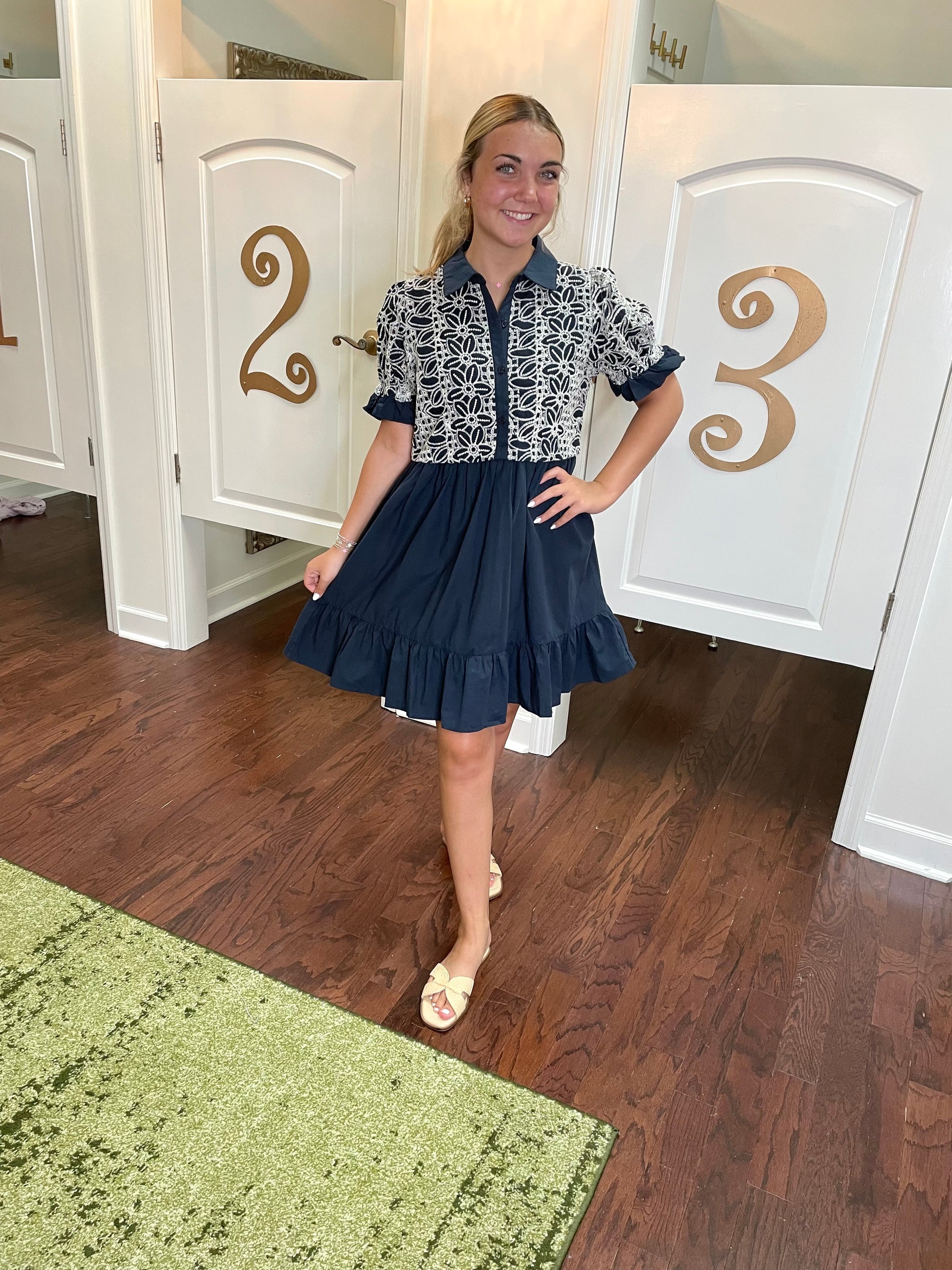 The Danielle Dress combines a charming floral lace bodice with playful short puffed sleeves and ruffled hems for a flirty touch. Its button-down collar adds a sweet vintage vibe, while the lightweight, non-sheer cotton skirt flows freely with tiered detailing near the hem. Perfect for sunny days, this dress offers comfort and style in one breezy, fun package.