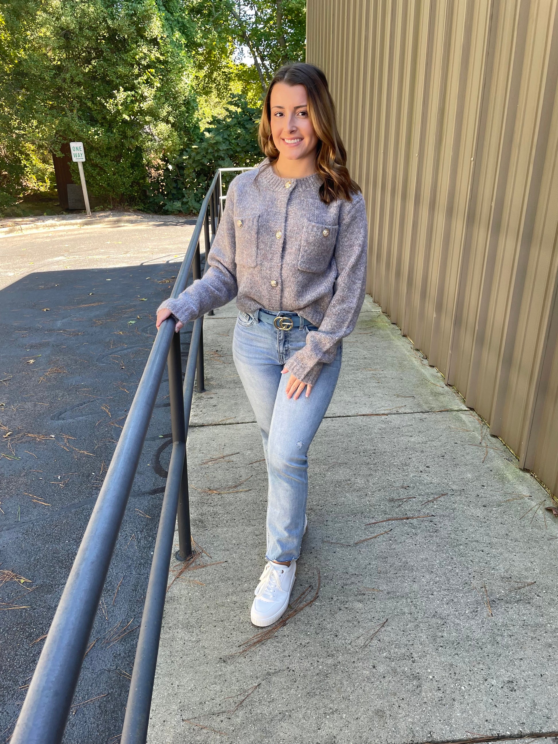 Introducing the quirky and cozy Eleanor Cardigan! This cardigan sweater offers a soft and plush texture, perfect for cooler weather. Its muted lavender-gray color and classic crew neckline add a touch of elegance, while the shiny metallic buttons and two large front pockets bring a fun and playful element. The slightly cropped and tailored fit make it the perfect layering piece for any outfit.