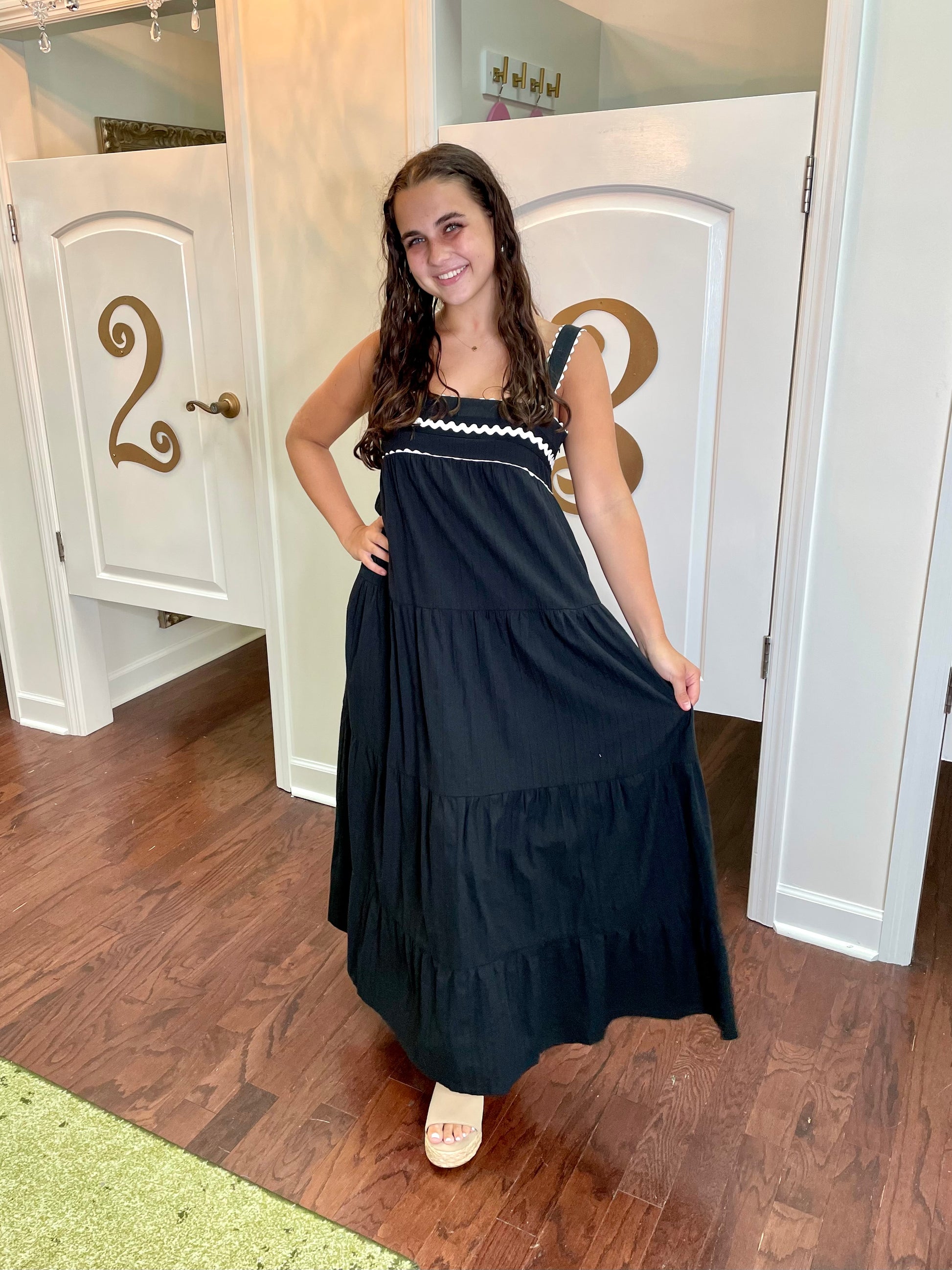 Looking for a fun and stylish dress? Check out our Eloise Dress! Made with soft 100% cotton, this tiered maxi dress features a strappy design and scallop trim detail for a unique touch. It also comes with a practical side zip closure for easy wear. Perfect for any occasion!