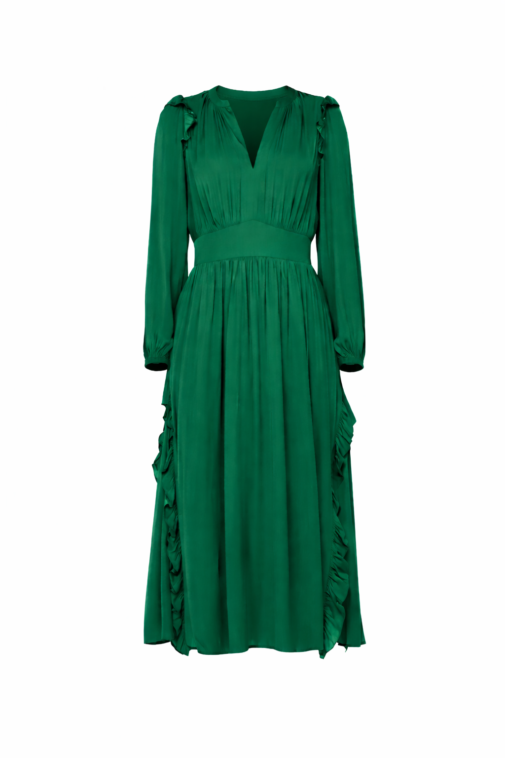 Introducing the Emmy Midi Dress—your new go-to for effortless elegance with a playful twist! This charming piece features a flattering split neckline and long sleeves that keep things sophisticated, while the smocked back detail adds just the right amount of texture and visual interest. The ruffled hem brings a flirty, feminine touch that dances with every step. Perfect for everything from casual brunches to evening outings, this midi-length dress strikes that sweet spot between comfortable and chic. Slip it on and let your style do the talking!