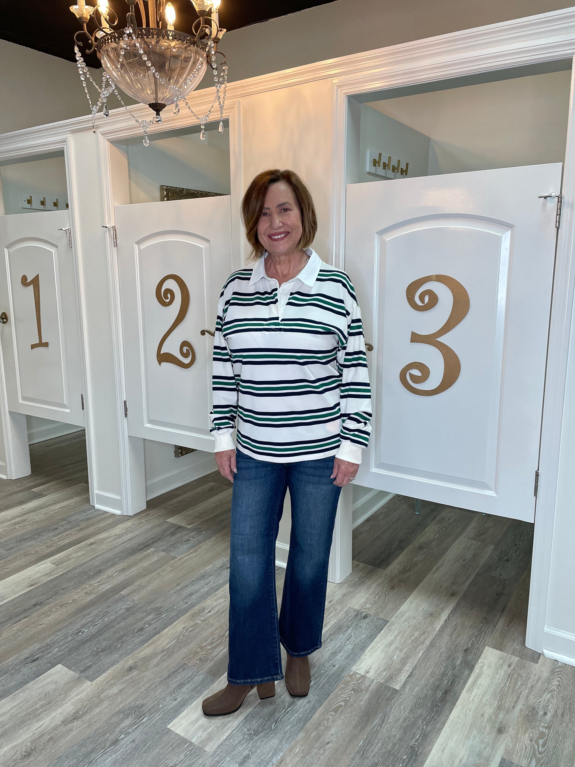 The Evermore Top brings playful charm with its long sleeves and bold horizontal stripes. The sharp collar adds a touch of refinement, making it perfect for a casual day out or a stylish office look. Easy to pair and effortlessly chic!