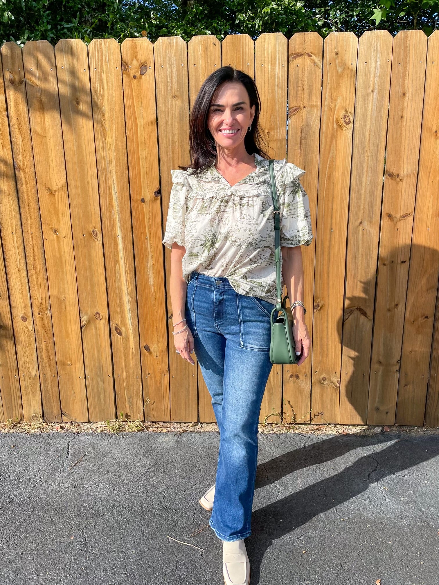 Get ready to turn heads with the Gillie Blouse. This playful blouse features a unique olive green landscape print and ruffle trim for a touch of whimsy. The boxy fit and balloon sleeves add to its quirky charm. Made with 100% cotton for ultimate comfort, this two tone split neck top is perfect for any fun-filled occasion.