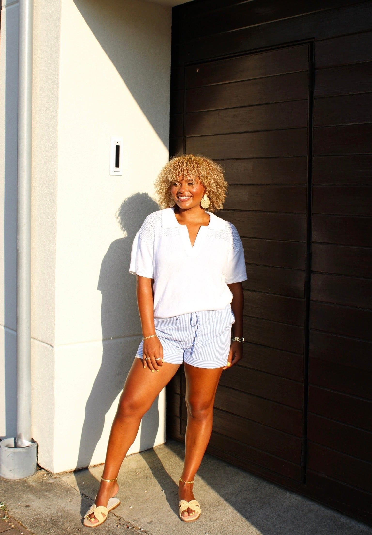 Up your preppy game with the Harrison Polo Top. This classic piece features a short sleeve knit design with a playful pointelle yoke and polo collar. The ribbing along the sleeves and bottom hem add texture to the slightly oversized, slouchy fit. Perfect for a fun and casual look! 55% Acrylic, 45% Cotton.