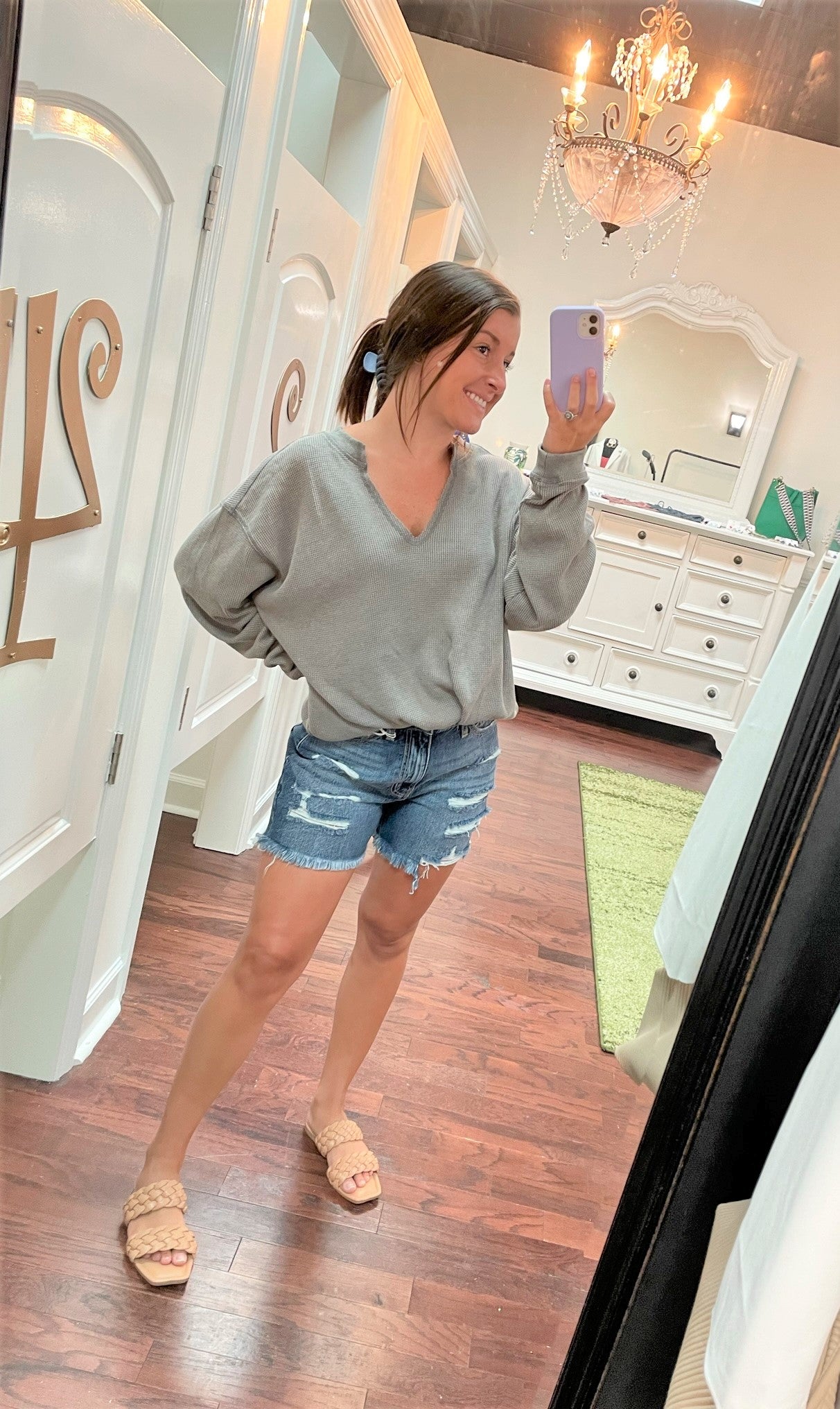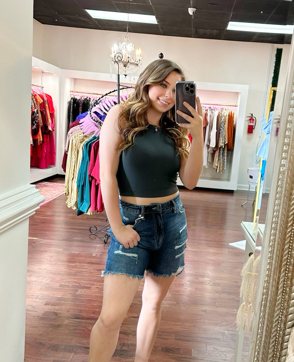 Check out these high-rise, girlfriend shorts that are sure to rock your world! 100% cotton for maximum comfort and totally trendy, they provide just the right amount of coverage without being too long and won't leave you feeling exposed. Plus, the light distressing throughout, and raw hem add an extra 'oomph' - perfect for women of all ages!!