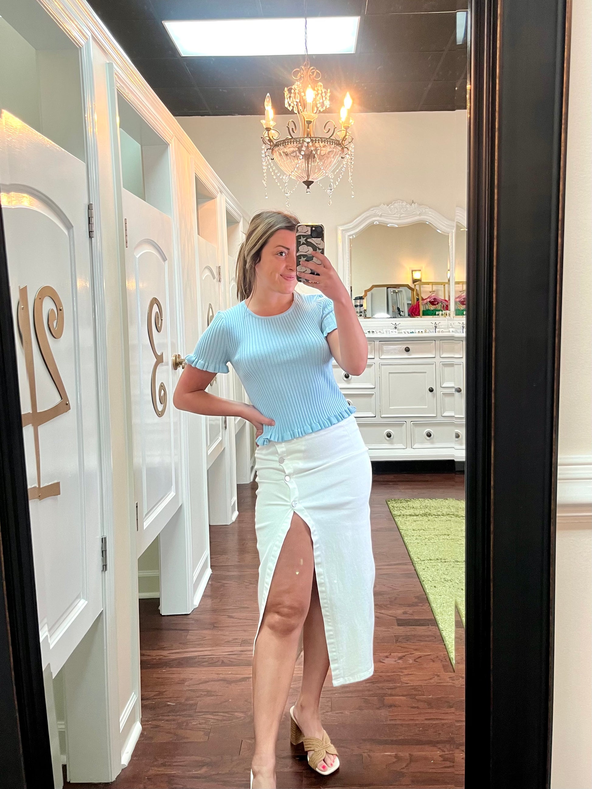Turn heads with the Julia Top! Made with 80% cotton and 20% nylon, this knit top boasts a light blue hue and short sleeves. The ruffle hem detailing adds a playful touch to this stylish piece.