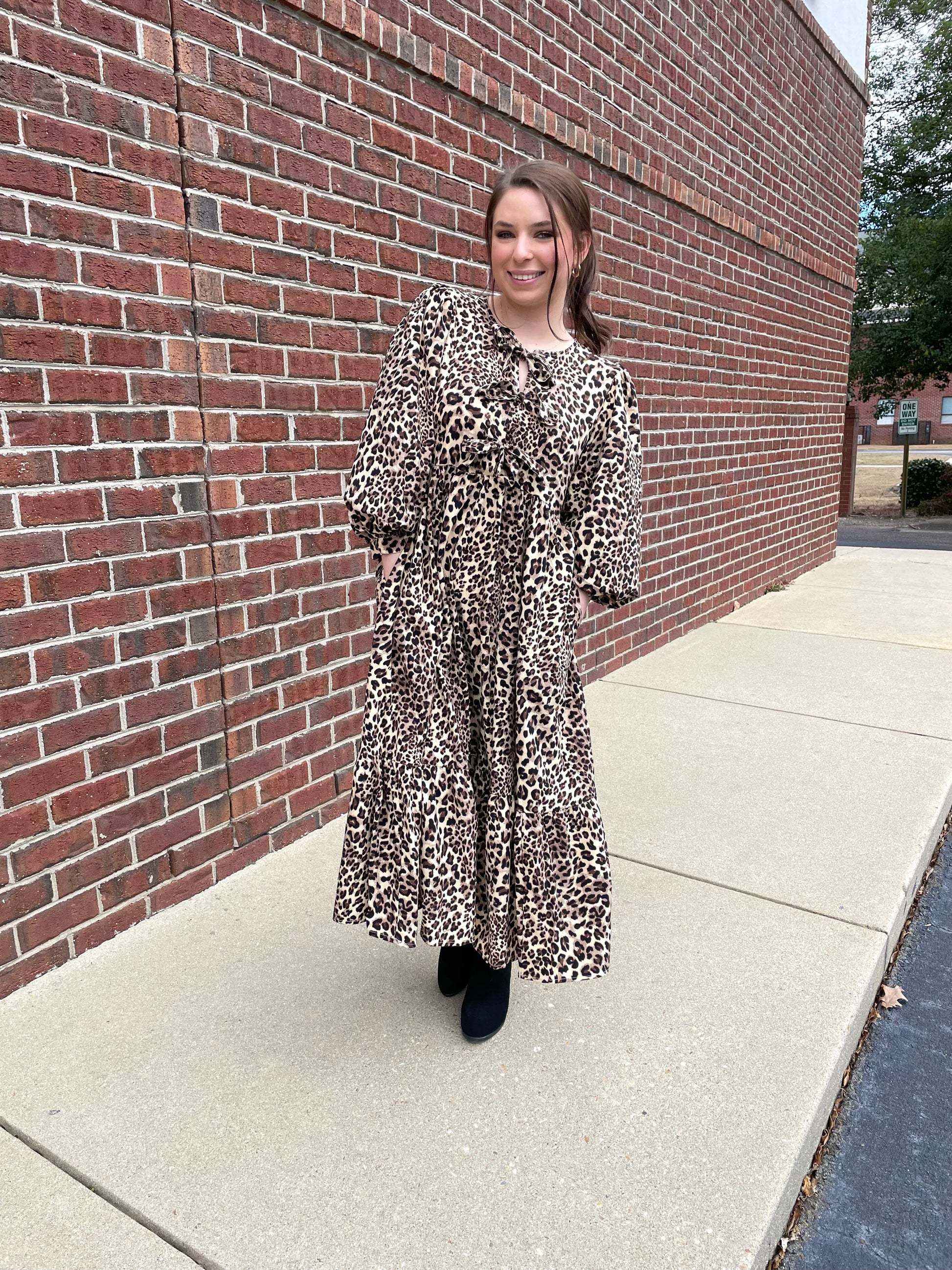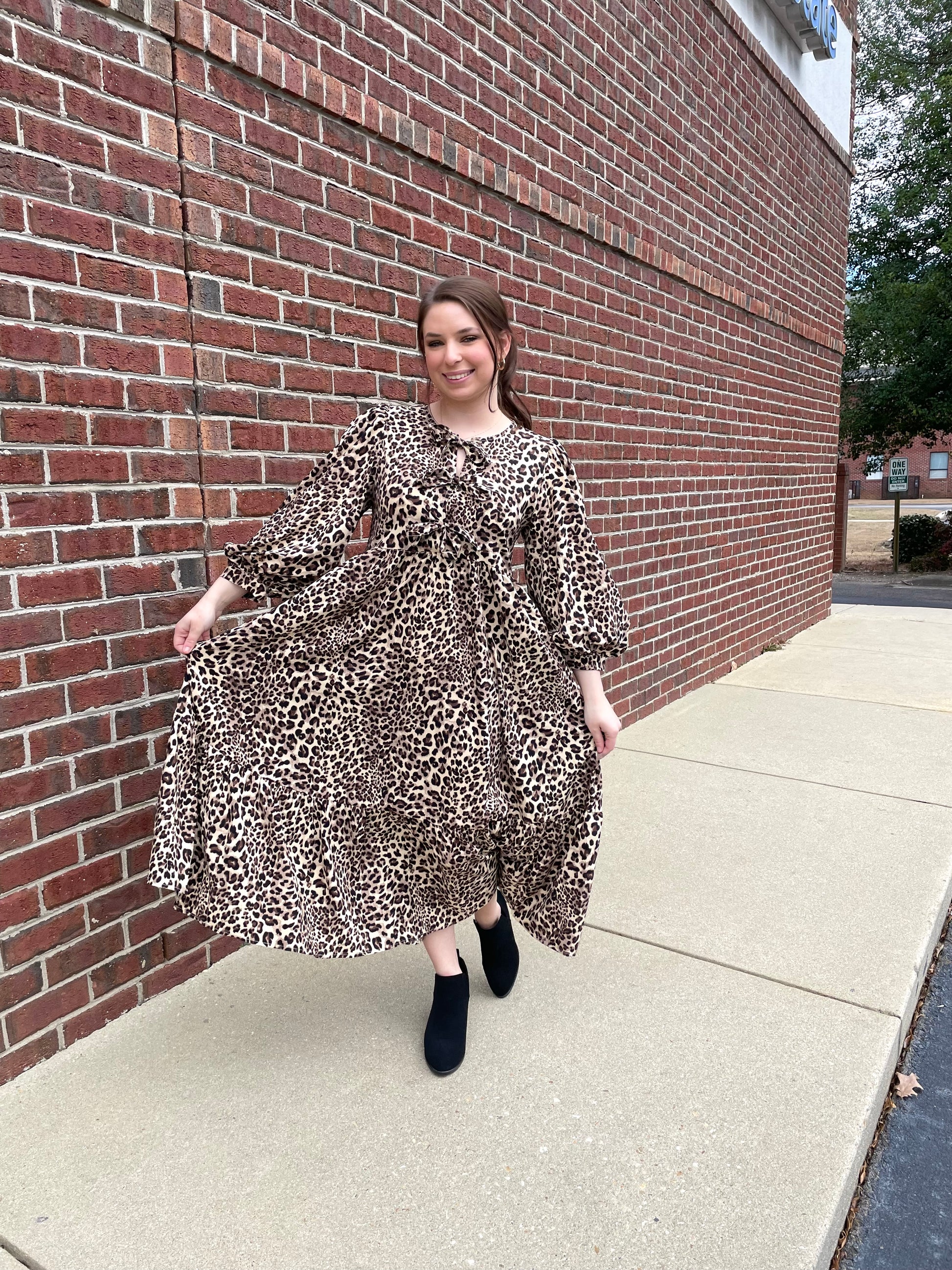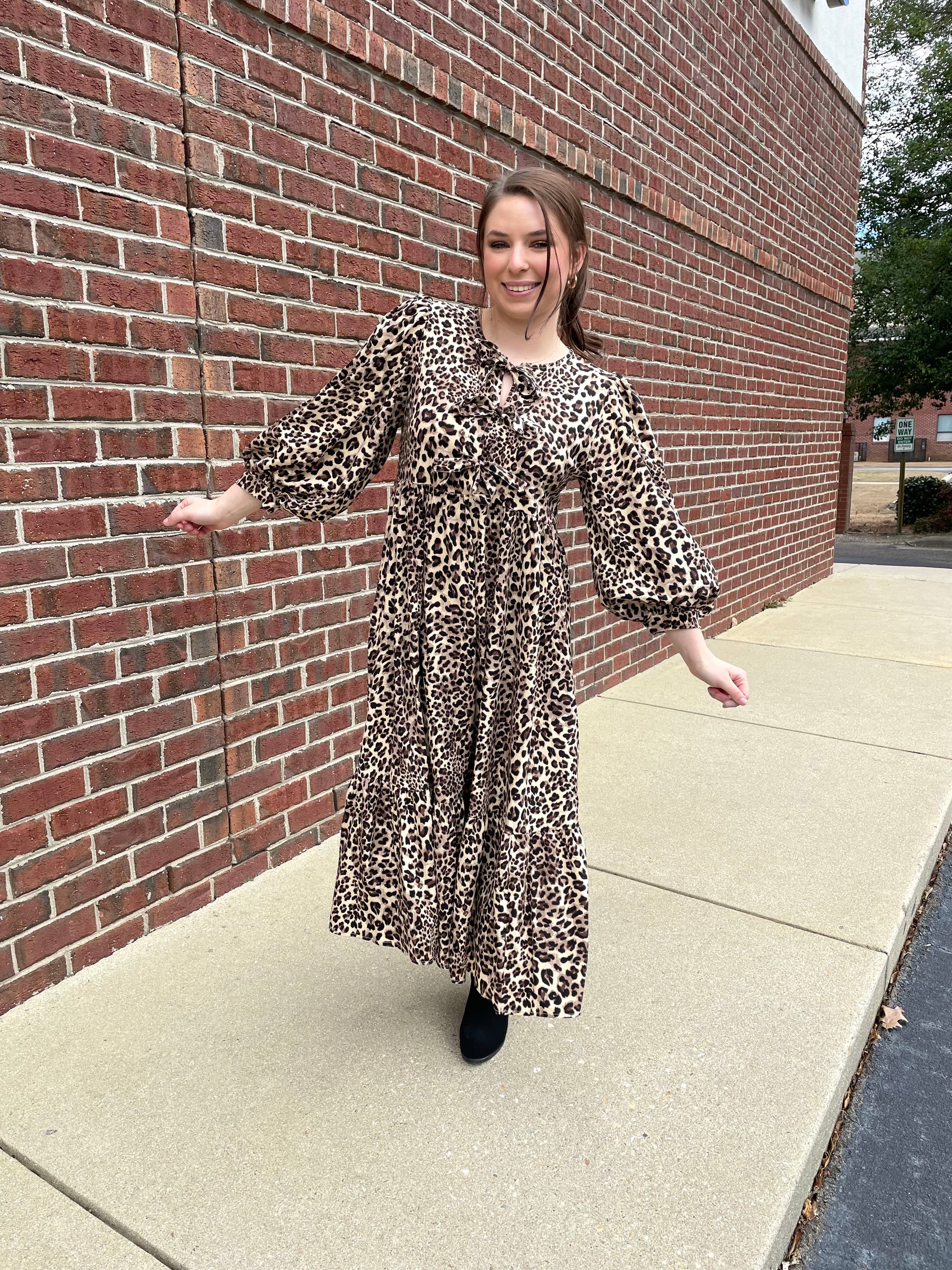 Unleash your fierce and playful side with the Kayn Dress! This leopard print midi dress features three tie bands at the front, adding a unique twist to the classic round neckline. The three quarter voluminous sleeves and ruffly hemline give a flirty touch, while the lightweight and non-sheer fabric ensures comfort. Made with 100% polyester, this dress is perfect for any occasion!