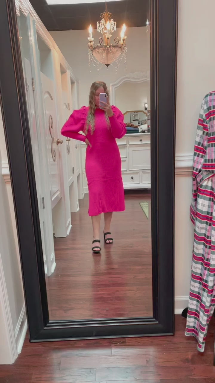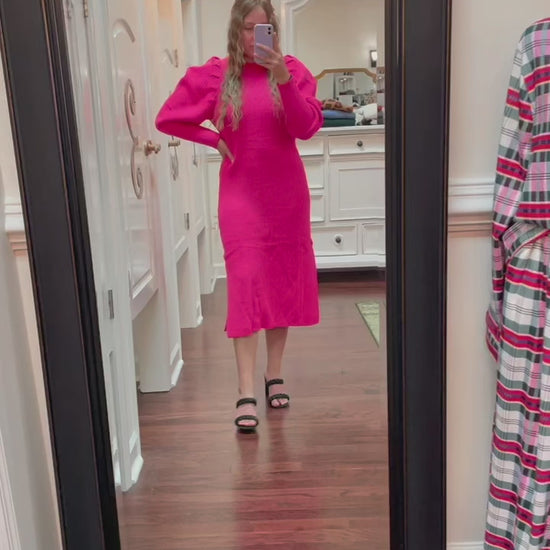 Capture the essence of the cooler seasons in this chic midi dress. Made from a soft knit, our dress features a classic round neckline and a relaxed body that's framed by long, mutton sleeves to make a statement. Style it with a belt for a more shapely figure or wear it as is for a relaxed look.