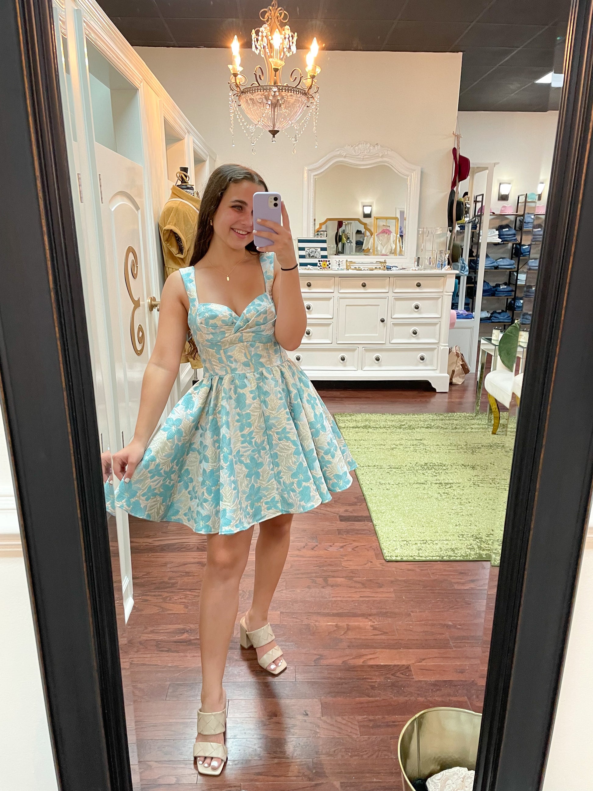 Show off your flirty side in this lovely Laguna Babydoll Mini Dress. Its jacquard fabric, floral print, and corset-inspired fit make it the perfect piece for your wardrobe. Plus, the zipper in the back and seagreen hue make it easy and stylish to slip on -- no sweat! 100% polyester.