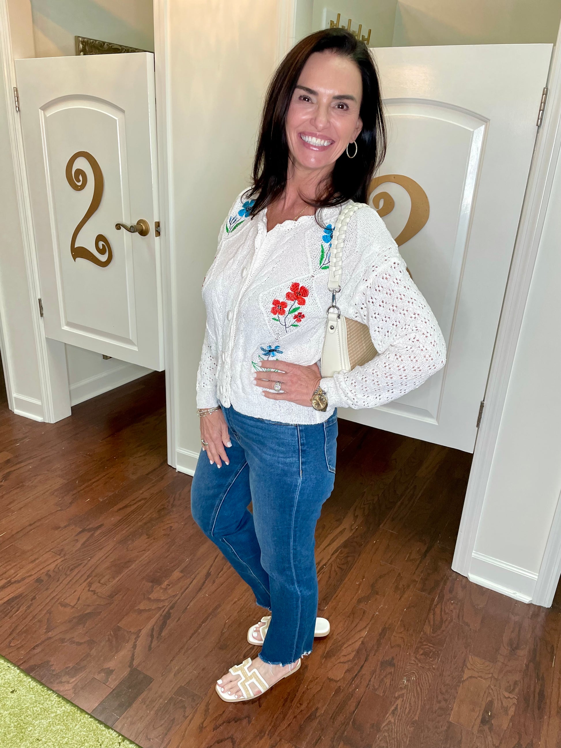 Add some delight to your wardrobe with our Lila Sweater Cardigan! Featuring charming embroidery, multi-texture design, and a flattering loose fit, this button-down cardigan will elevate any outfit. Stay stylish and cozy with this waist-length, pointelle sweater.