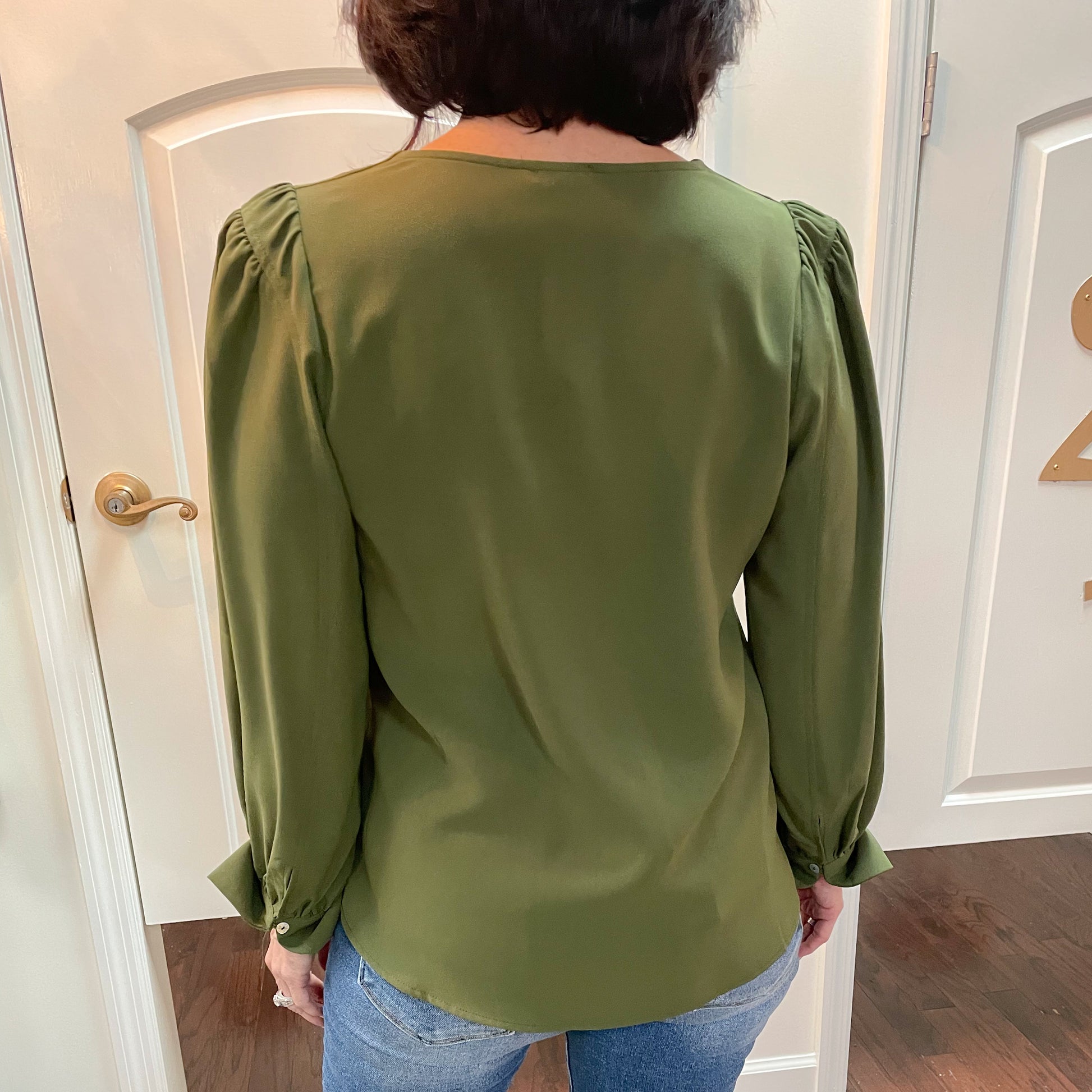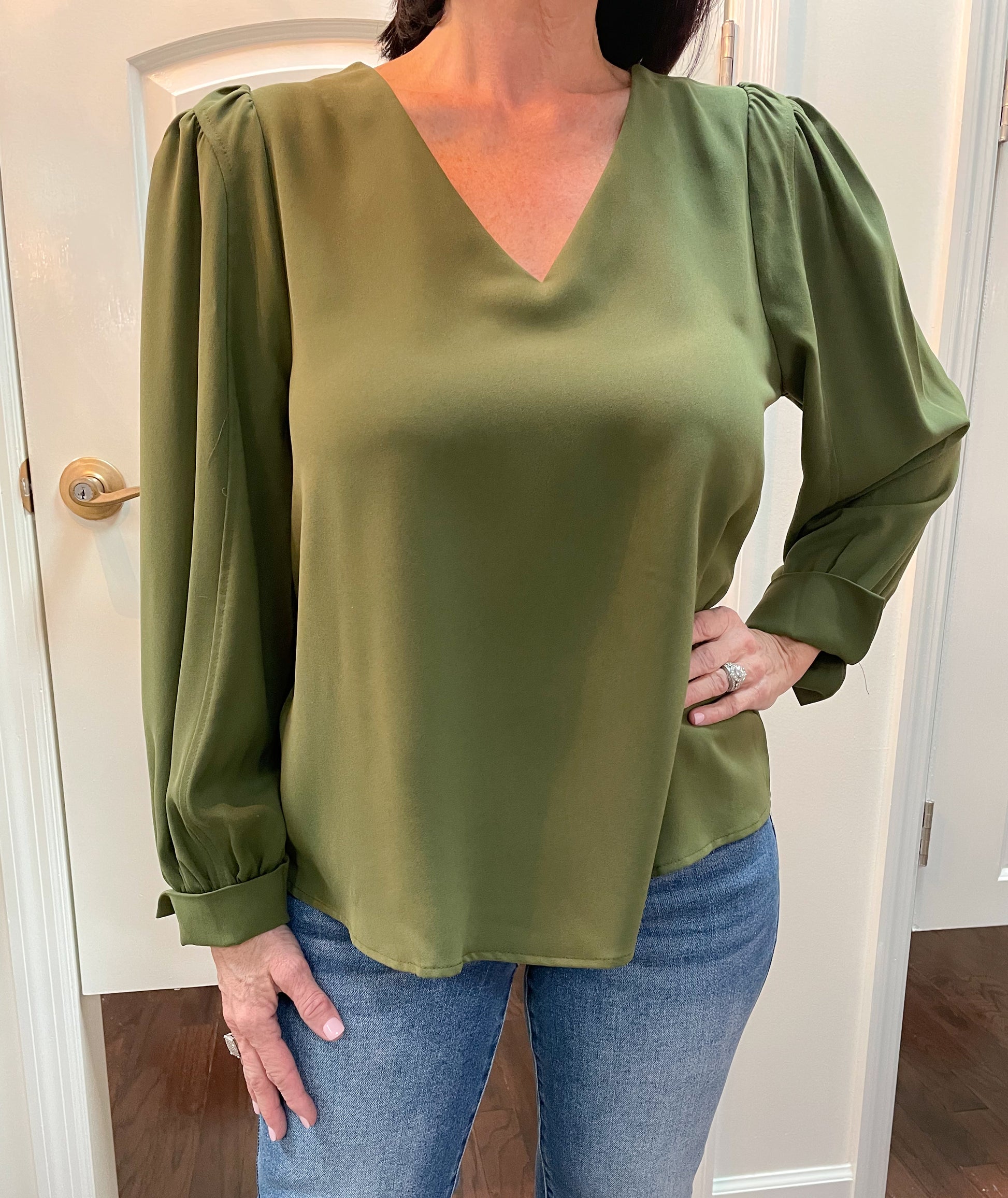 Long Live Top! Look your best and feel comfortable in this chic olive top with a v-neckline, peasant sleeves, and buttoned wide band cuffs. Made with lightweight, 100% polyester, it's sure to become a wardrobe staple! Score yourself some serious style points.