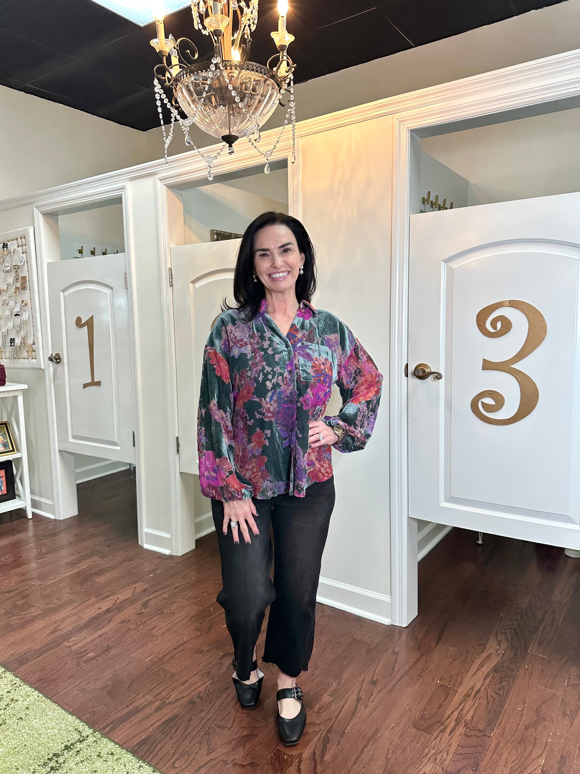 Dress up and have fun in our Lorelei Blouse! This velvet flower print top features an open collared neck and front pocket detail for a touch of elegance. The back shirring and long peasant sleeves add a playful touch, while the curved hemline and lightweight fabric make it perfect for any occasion.