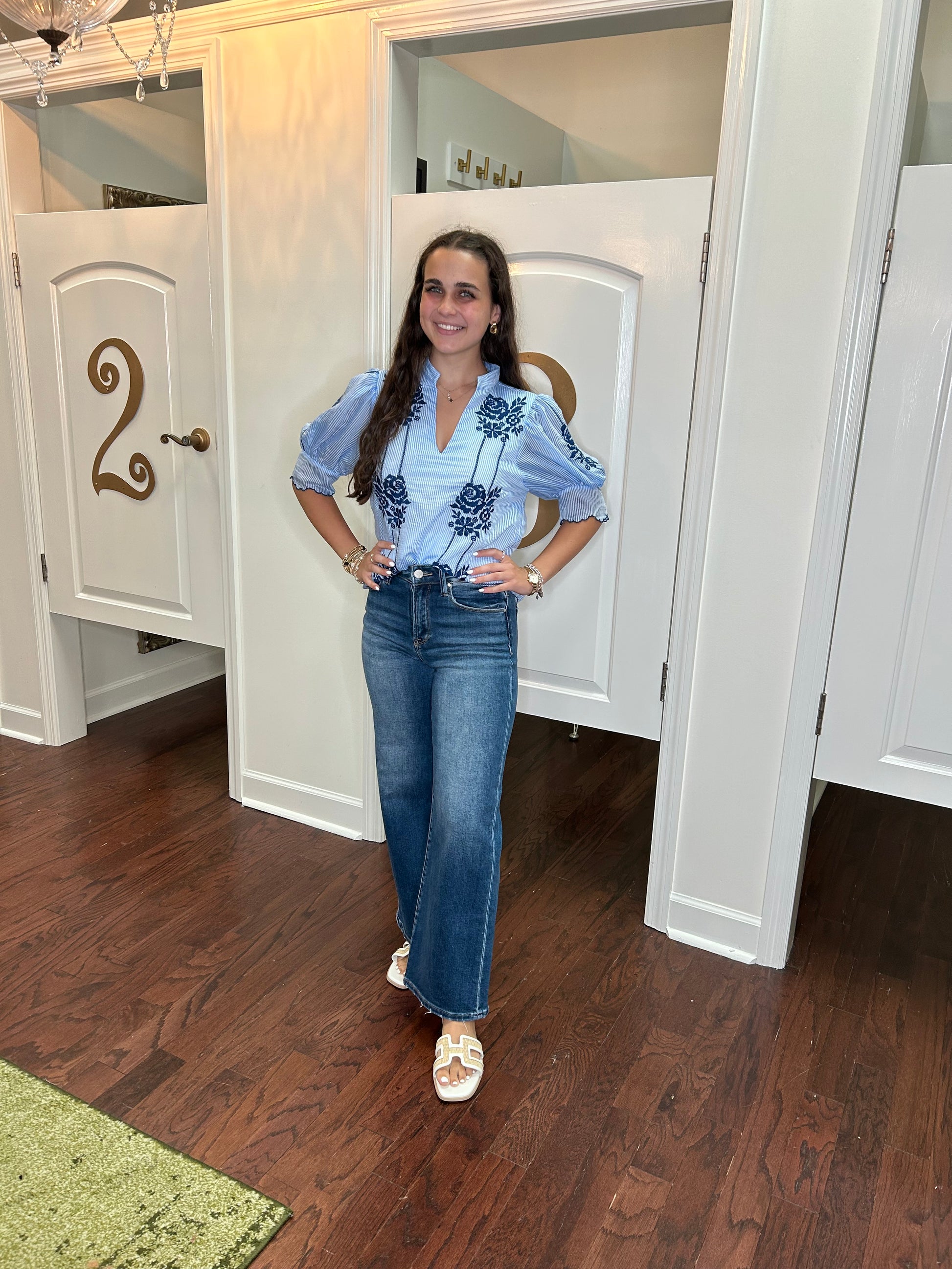 The Maggie Blouse brings a playful twist to your wardrobe with its embroidered puff sleeves and classic stripe pattern. Crafted from a soft woven blend of 50% rayon and 50% nylon, it offers comfortable wear and a flattering fit. Designed in the USA, this top features a 23 1/2-inch body length and 13 1/4-inch sleeves, perfect for adding a fun, feminine touch to any outfit. Whether dressed up or down, the Maggie Blouse is your go-to for effortless style with a hint of charm.