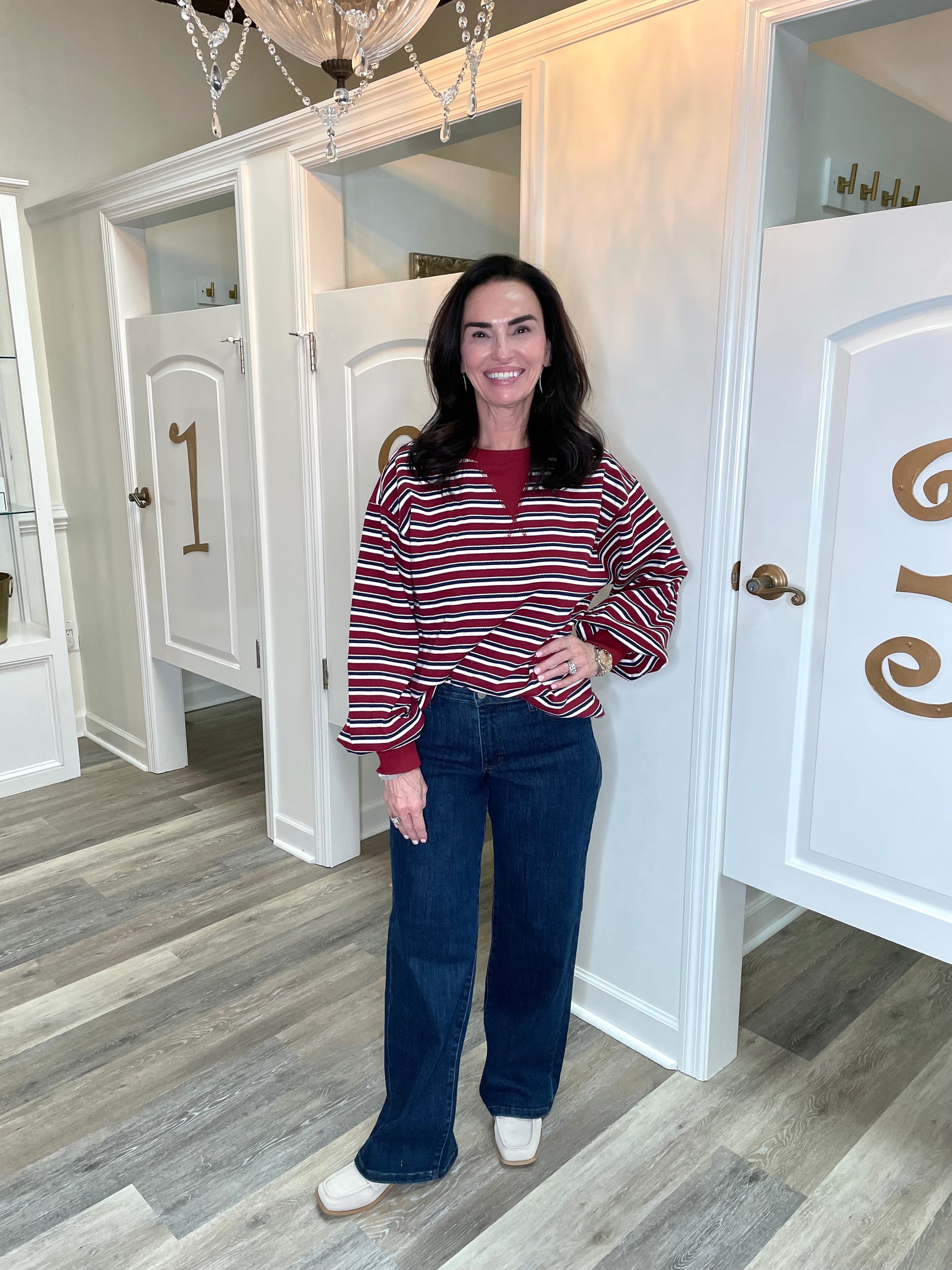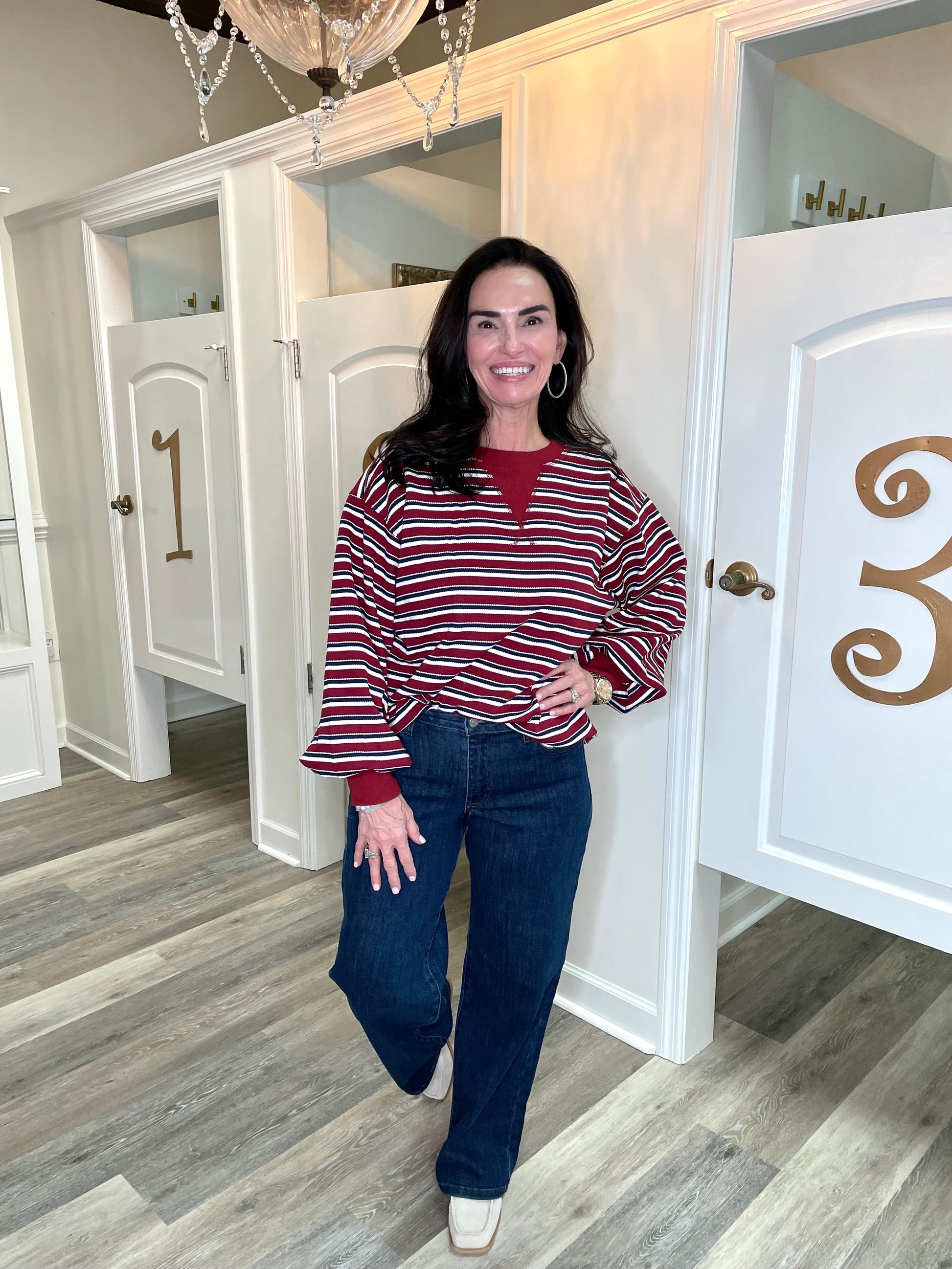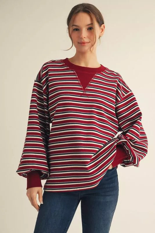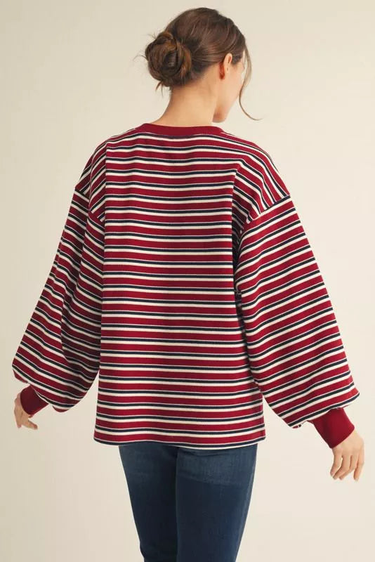 The Maren Top is your new go-to for effortless style with a playful twist. Featuring dramatic puff sleeves that command attention and a flattering v-notched neckline, this striped beauty strikes the perfect balance between bold and wearable. Intricate stitch detailing adds dimension and charm, making it ideal for dressing up casual looks or layering over your favorite basics. Whether you're heading to brunch or a night out, the Maren Top brings personality and polish to any outfit.