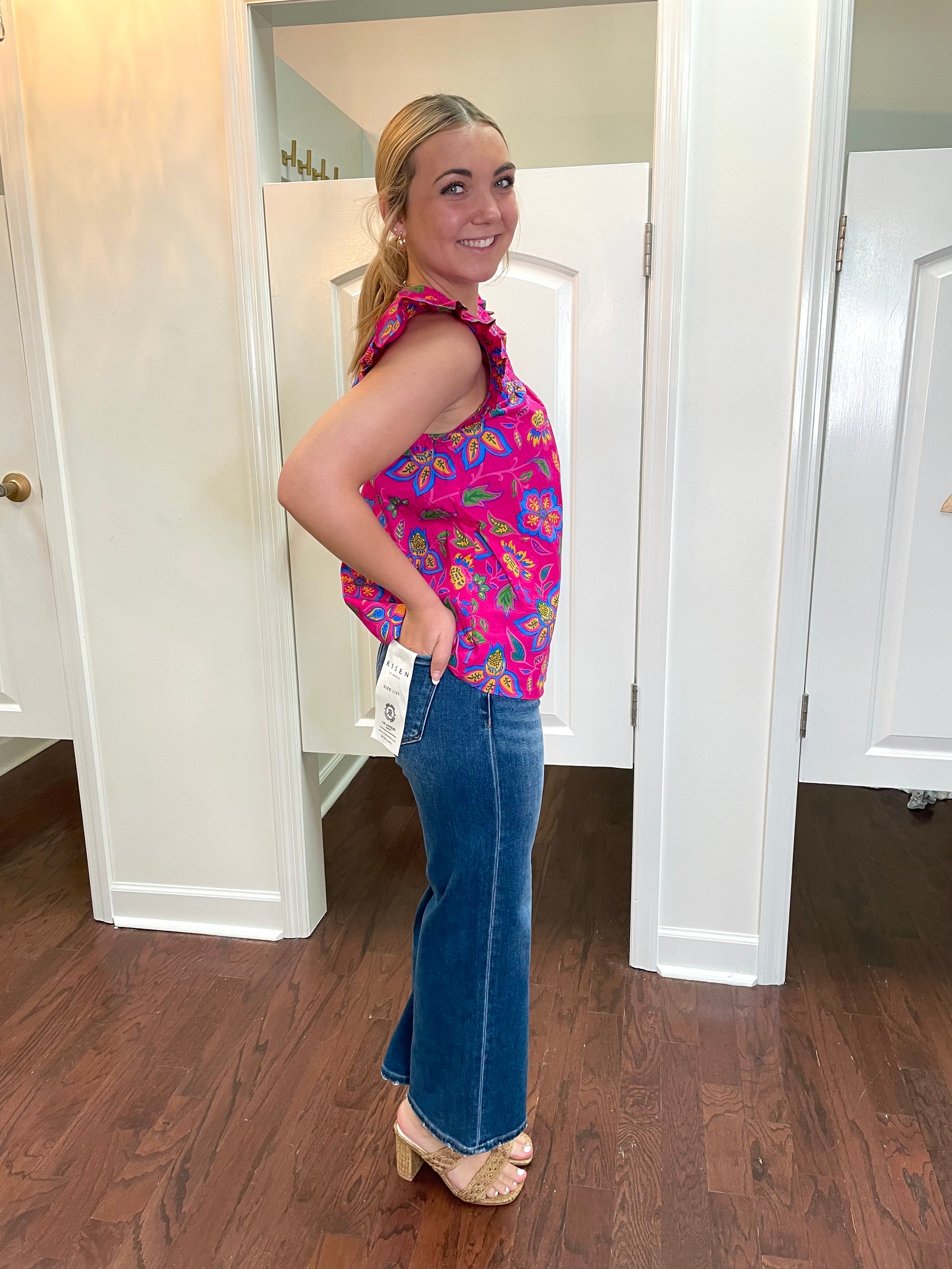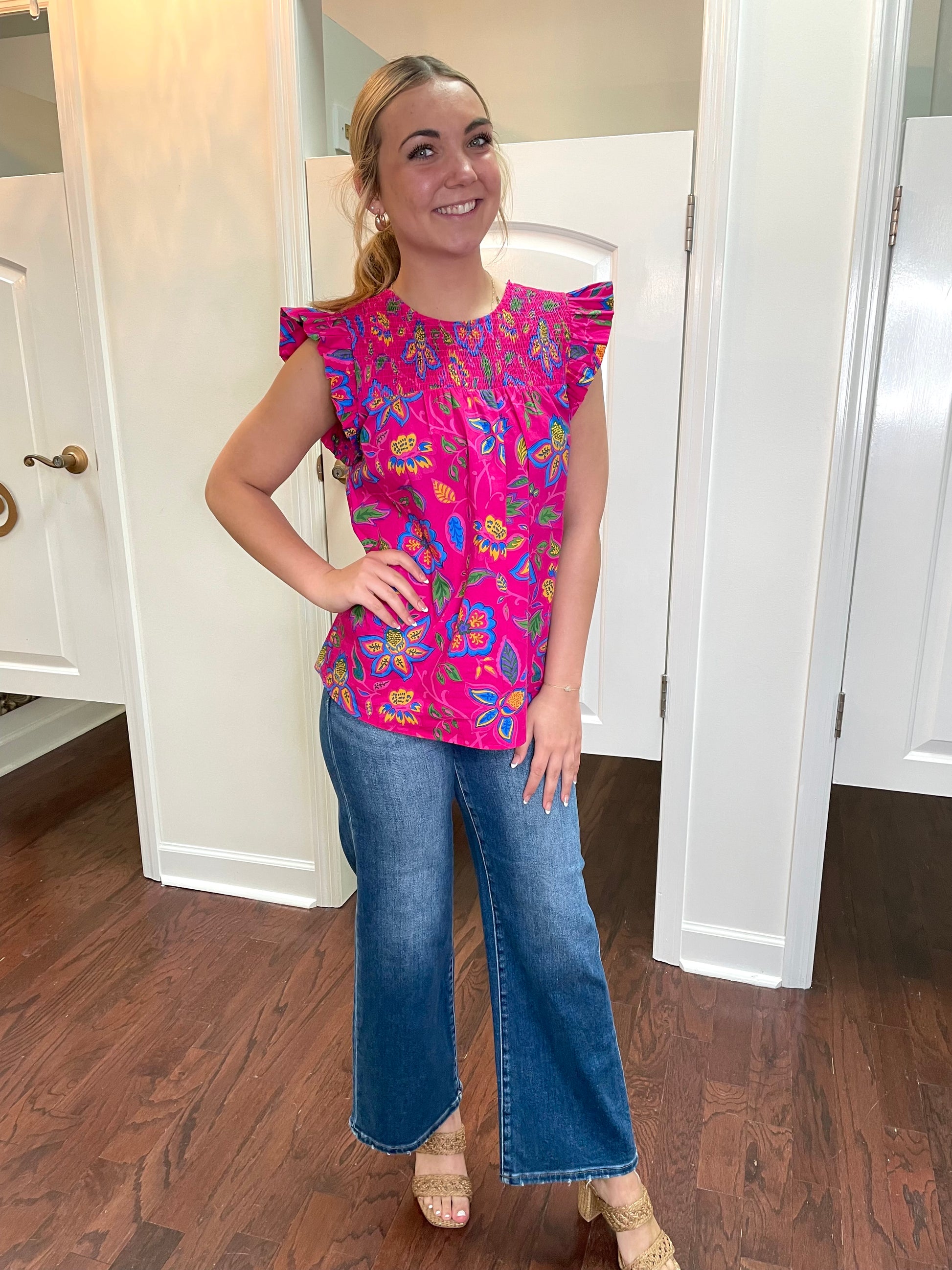 Get ready to bloom in style with the Marie Blouse! This playful floral top features a smocked ruffle design in a vibrant magenta color. Perfect for adding a touch of fun to any outfit, this blouse will have you feeling confident and carefree. (Flower power never looked so good!)