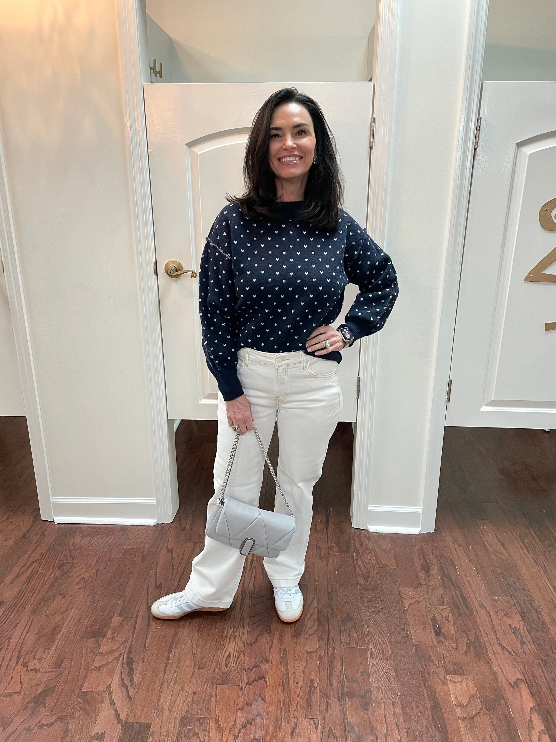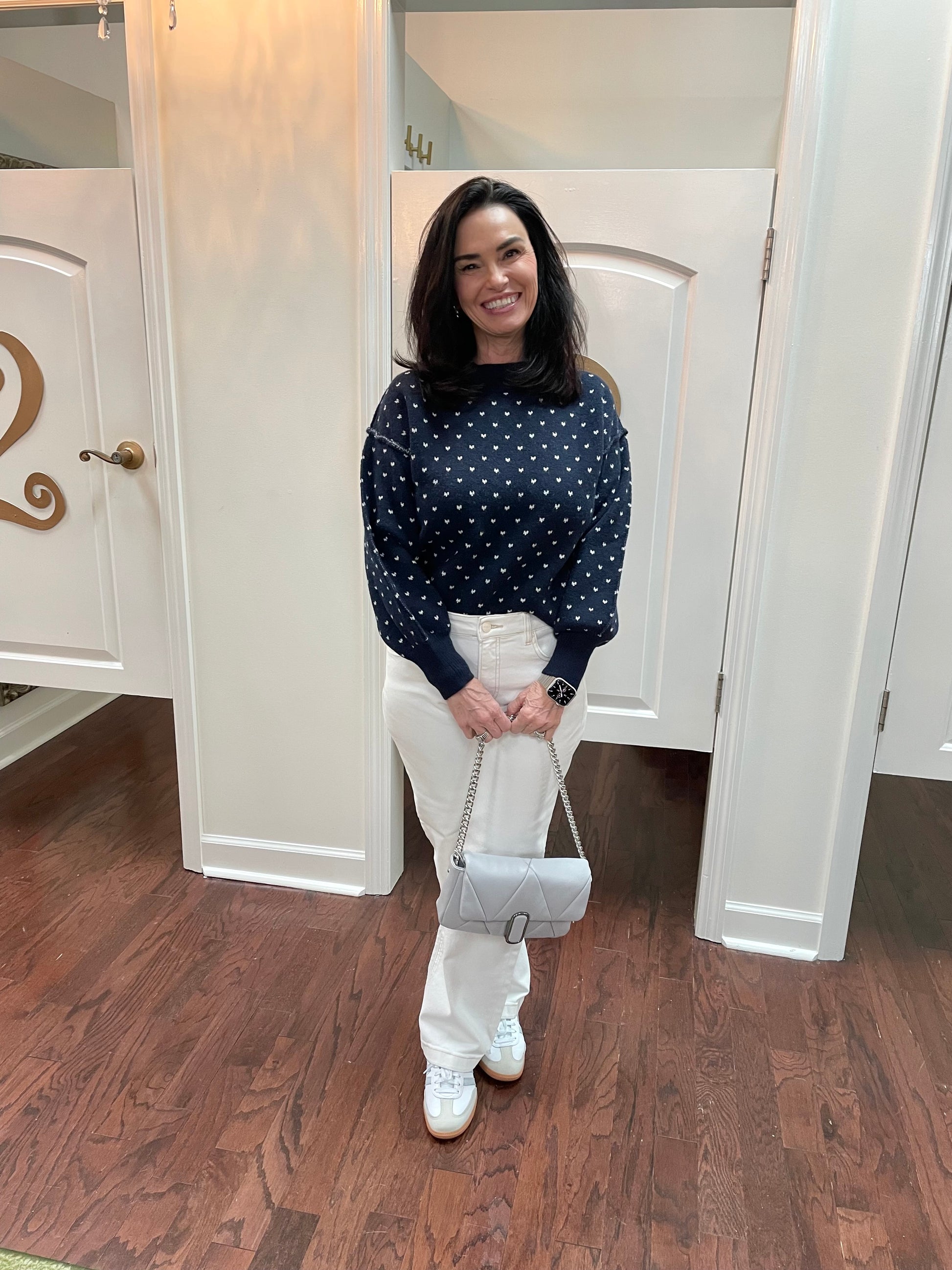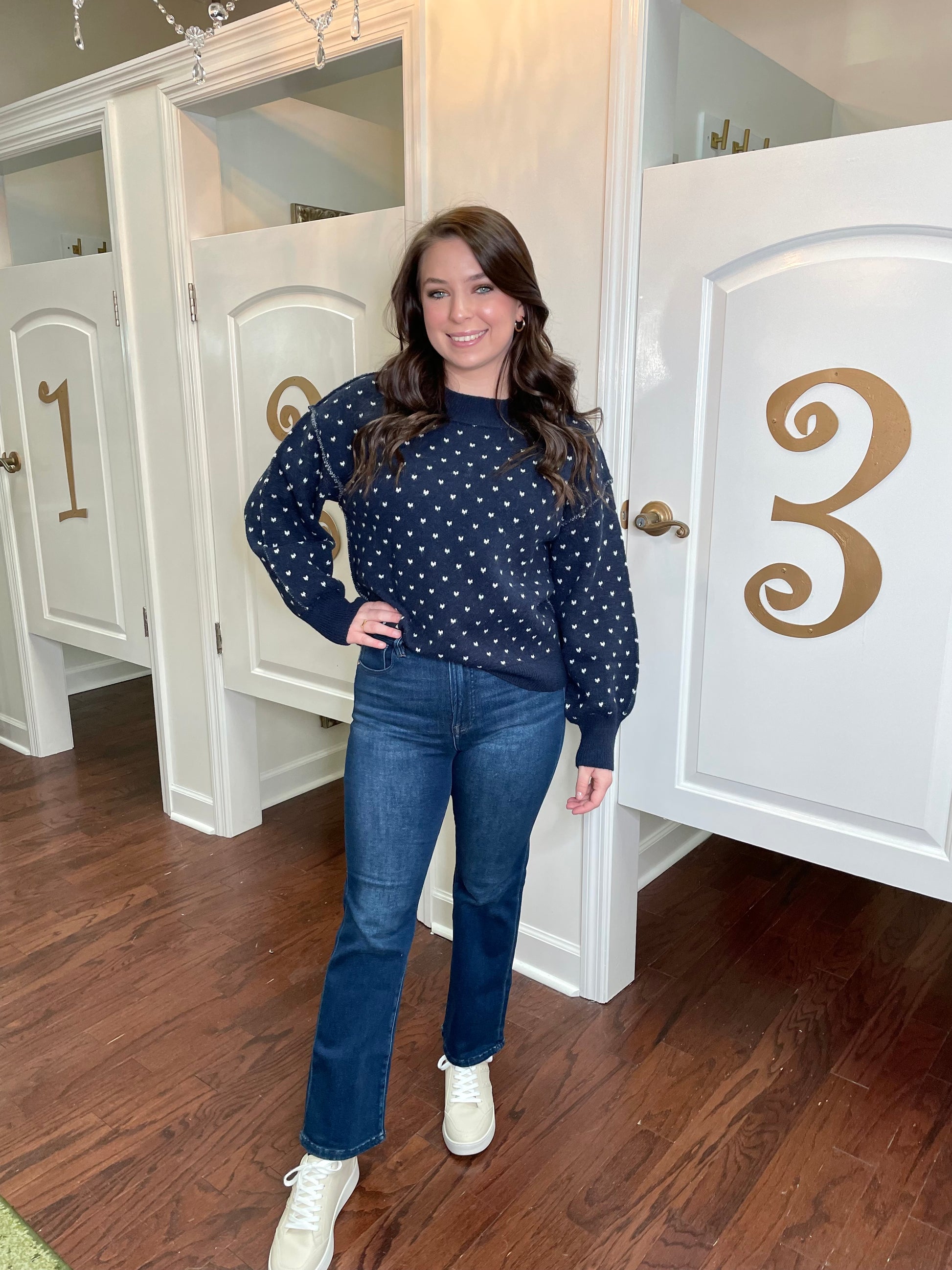 Fall in love with the playful heart outseam detailed crop sweater top! Featuring a heart pattern and outseam detail, this cozy sweater adds a touch of quirkiness to your wardrobe. The crop length and relaxed fit make it perfect for any occasion. (And did we mention the hearts?)