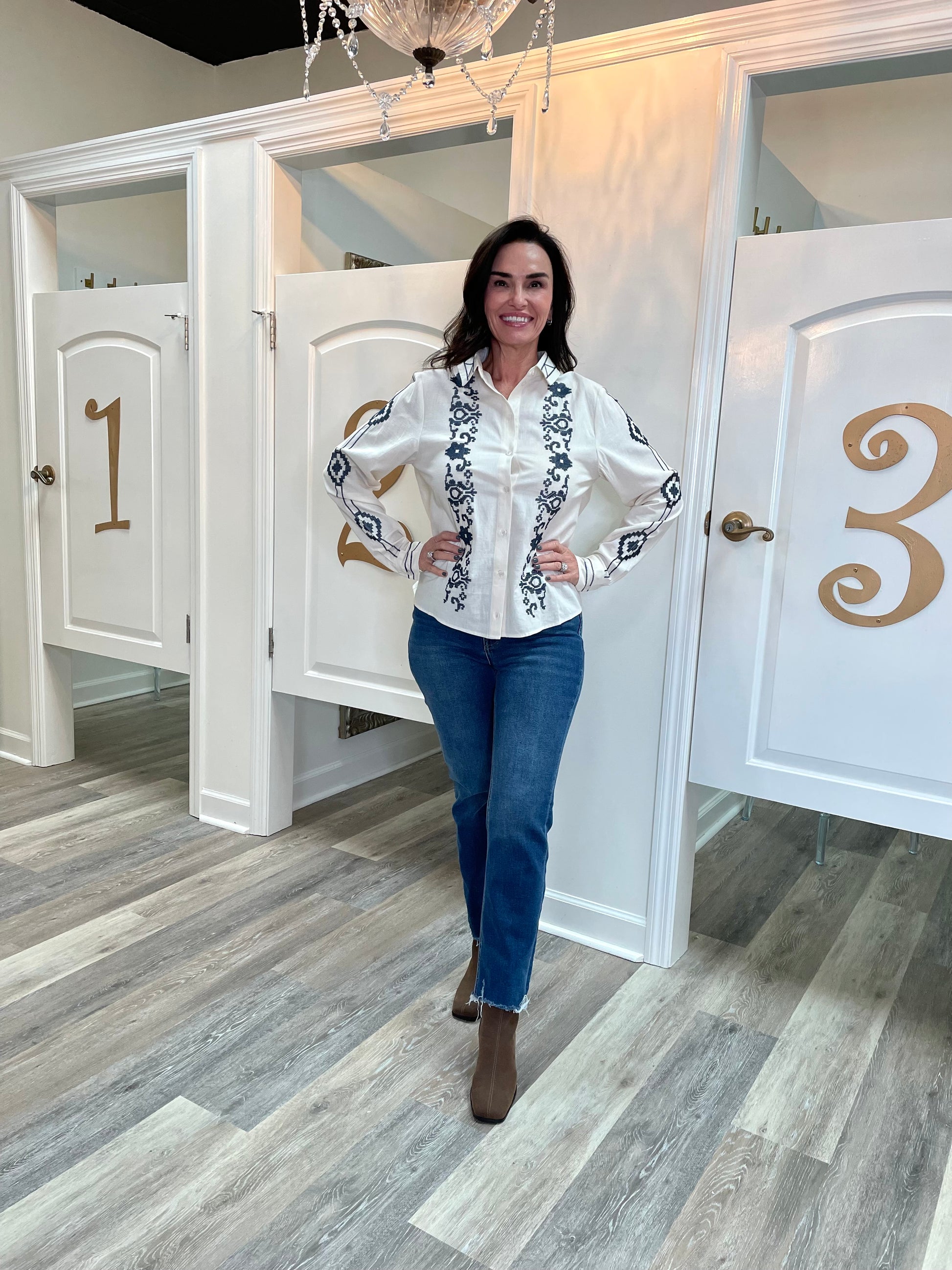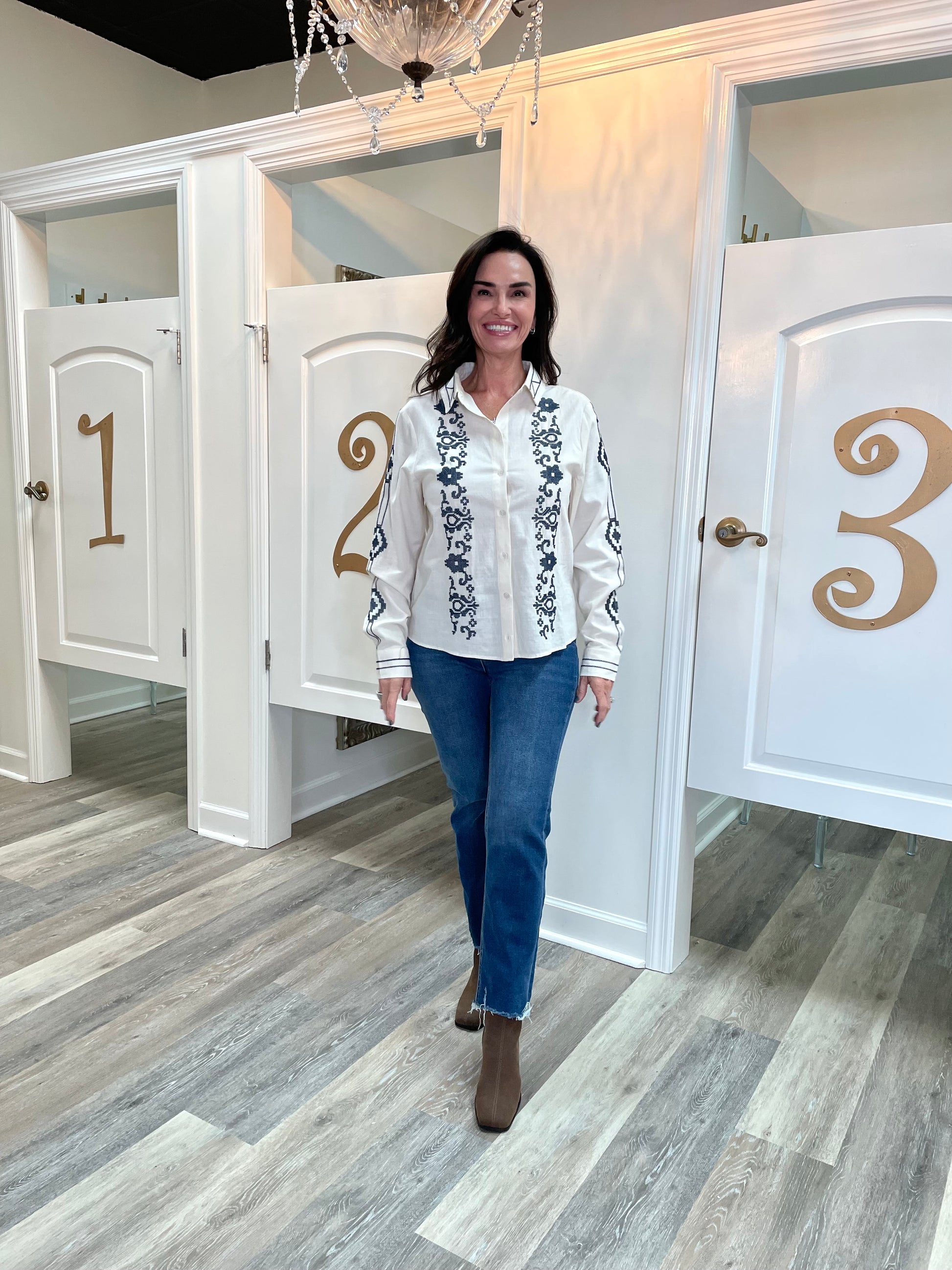 Bring a touch of charm to your wardrobe with the Montana Top. This playful button-up features delicate embroidery across the front, sleeves, and collar, adding eye-catching detail wherever you go. Its relaxed fit, long sleeves with buttoned cuffs, and classic collared neckline make it a comfy and stylish choice for any casual day. Button down the placket and let your look bloom with unique, embroidered flair.
