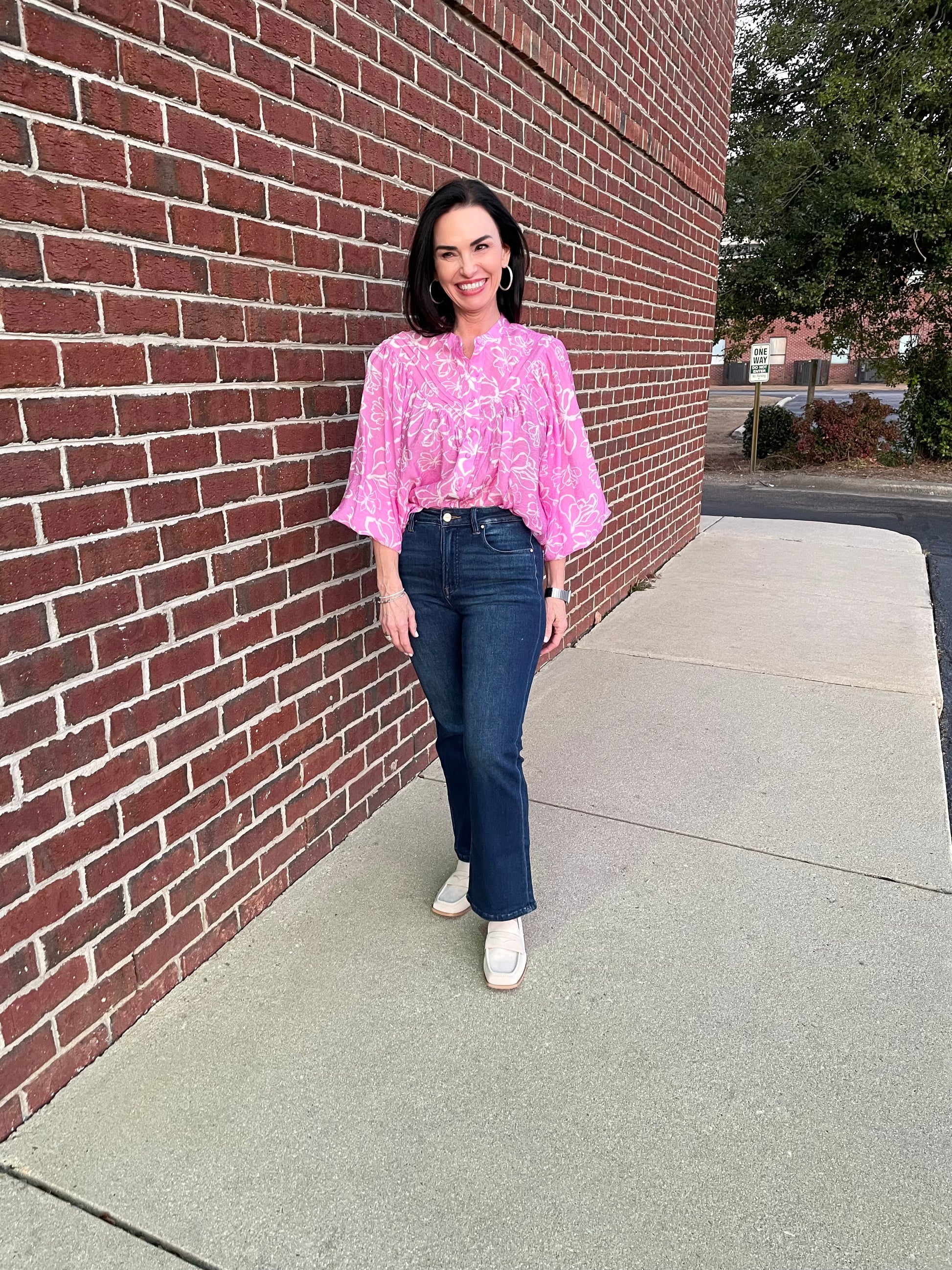 Introducing the playful Nadia Blouse! This button down floral print shirt is perfect for adding a pop of color to any outfit. Featuring a rounded neckline, buttoned cuffs for a bubble sleeve effect, and added pleats for detail. Made with a lightweight, relaxed fabric of 85% rayon and 15% nylon. (Lighten up your wardrobe with this fun, flowery top!)