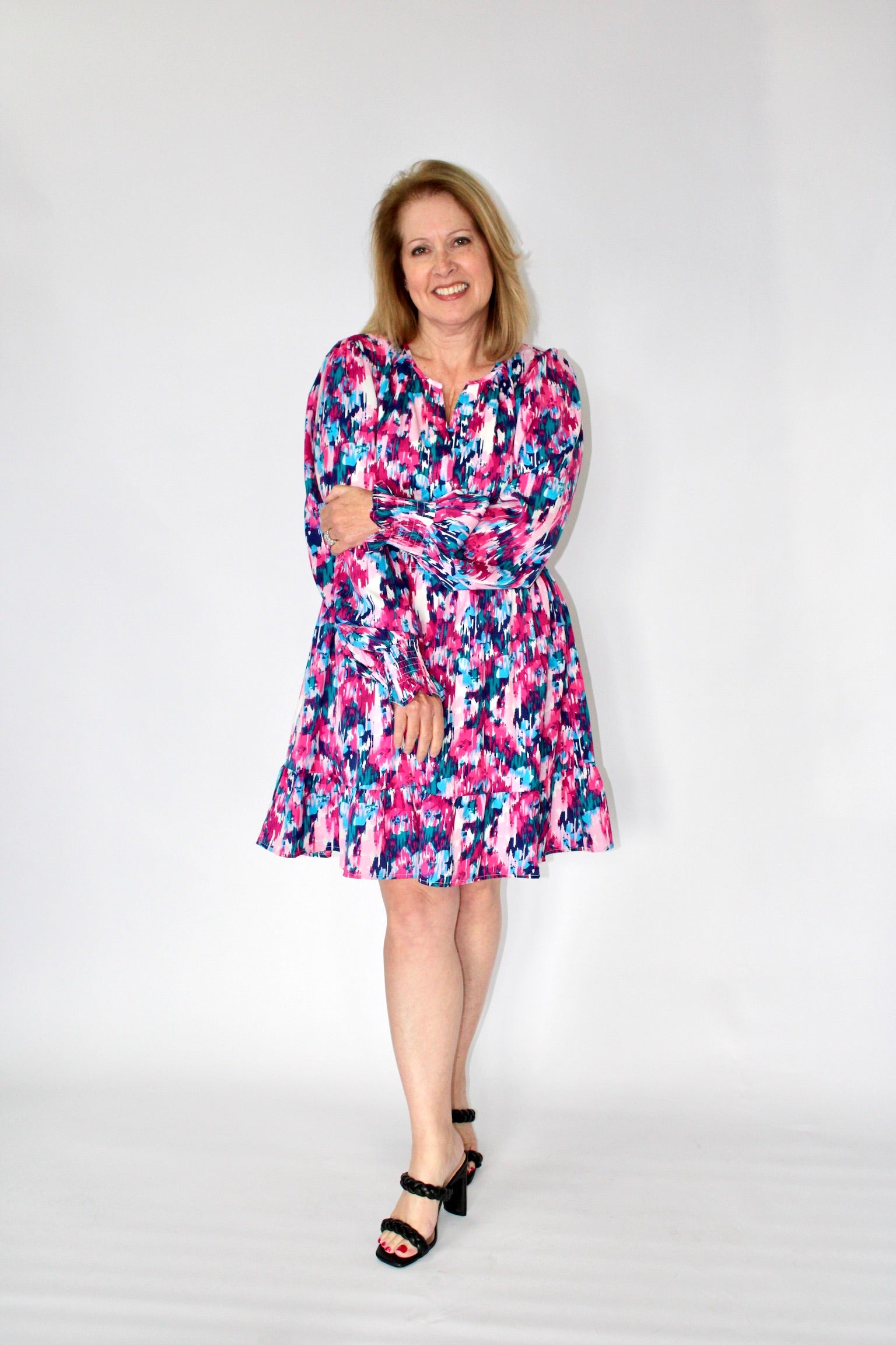 Unleash your inner artiste with the Parker Dress. This abstract print dress boasts a split neck, smocked waistline, side pockets, and long poet sleeves. The ruffled hemline adds a touch of whimsy. Made from 100% polyester, dress it down with sneakers or up with heels for a truly unique look.
