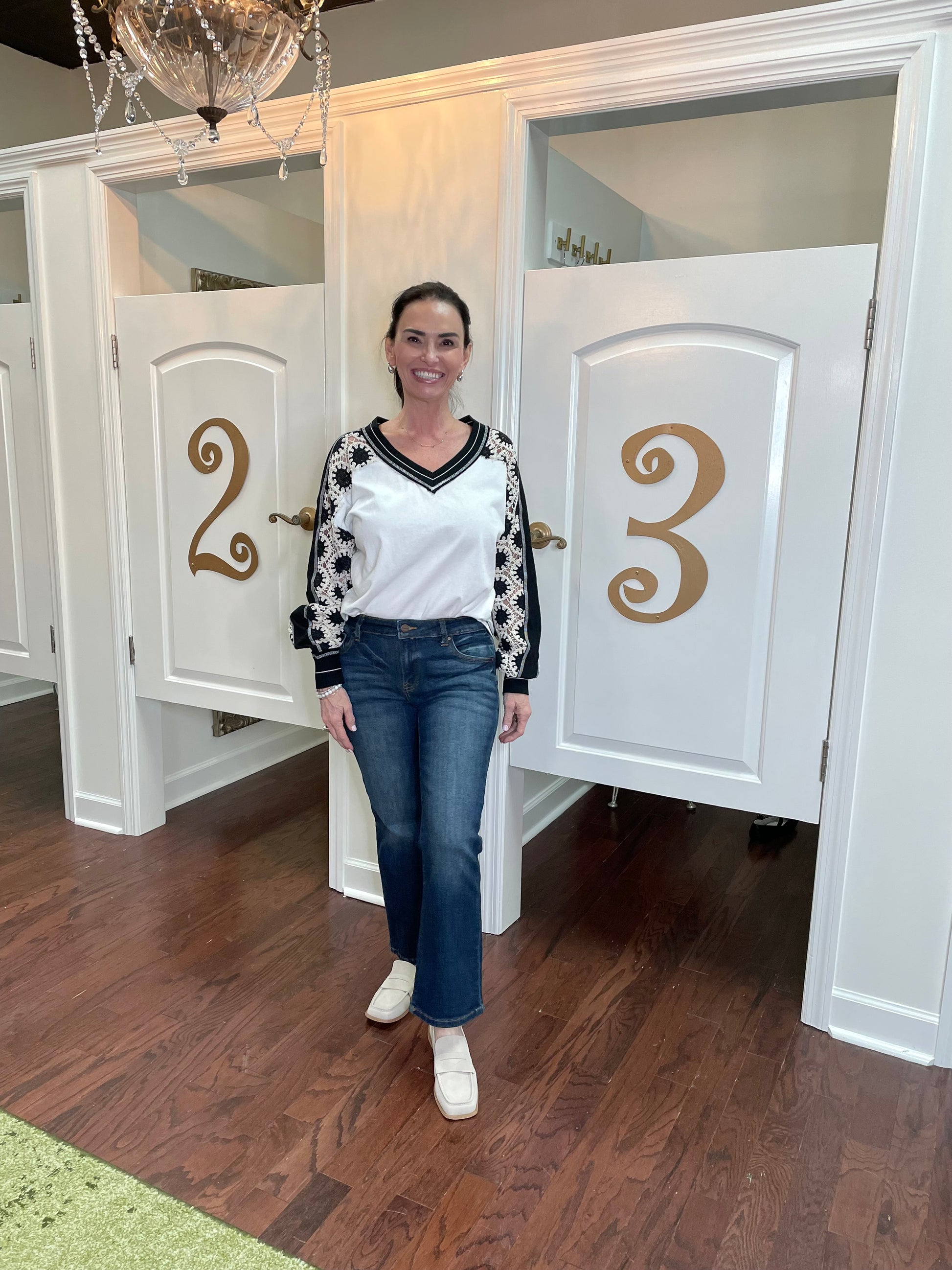 Spice up your wardrobe with this playful Embroidered Raglan Sleeve Top! The V-neckline and contrasting seaming add a unique touch, while the embroidered sleeves and banded cuffs elevate the look. Made with a relaxed fit and soft cotton blend, this top is perfect for any occasion.