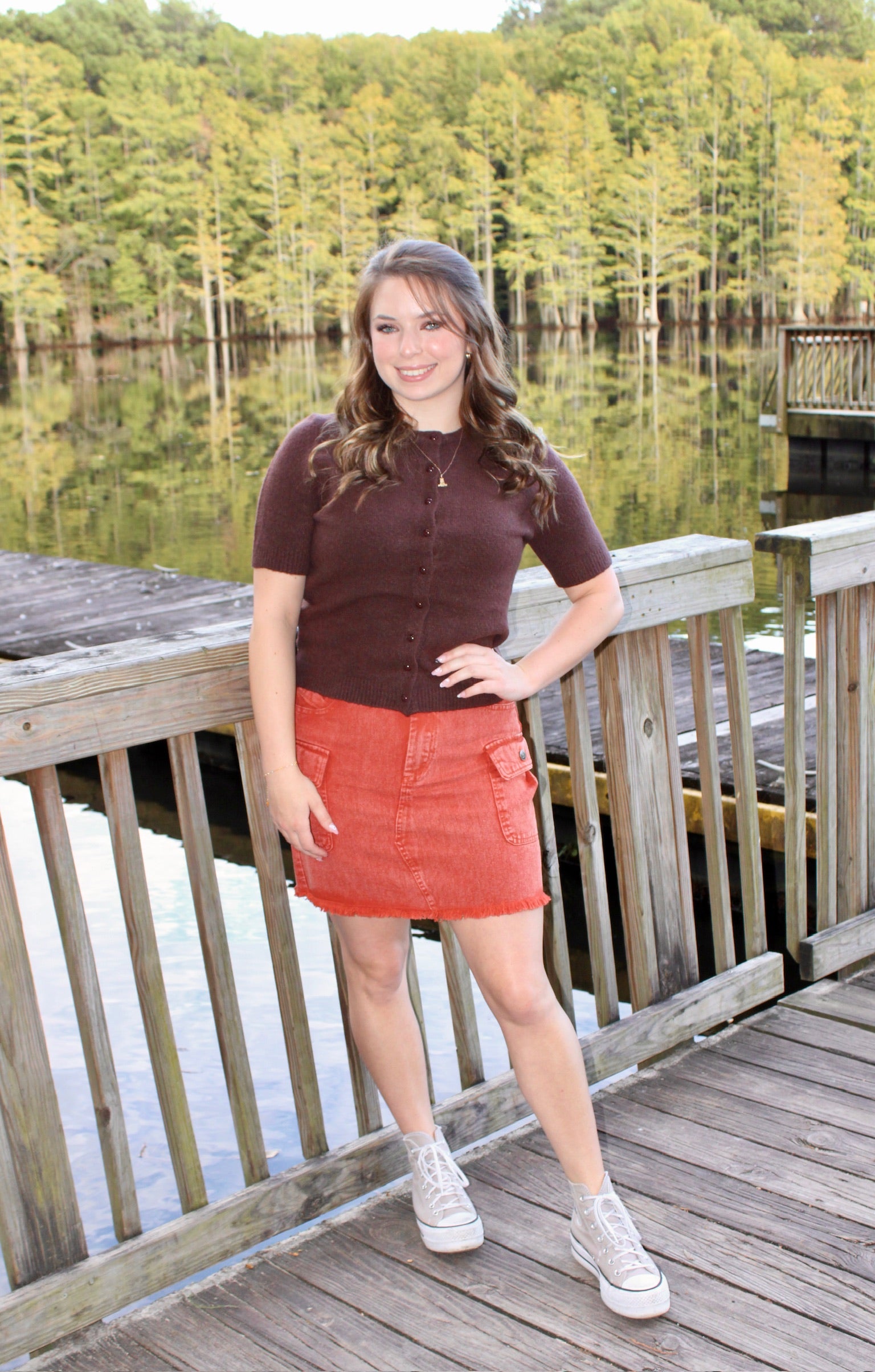 Looking for a stylish, playful addition to your fall wardrobe? Look no further than this Rust Orange Pumpkin Patch Mini Skirt. Its washed denim cargo style, high waist, and 100% cotton material are perfect for adding a hint of sophistication to your look, while its raw edge finish, belt loops, zip fly, and button closure will ensure you feel all the autumn vibes! Plus, the cargo flap pockets on the side and the back pockets make it perfect for storing all your essentials! So what are you waiting for? Put your best foot forward and jump into the pumpkin patch!