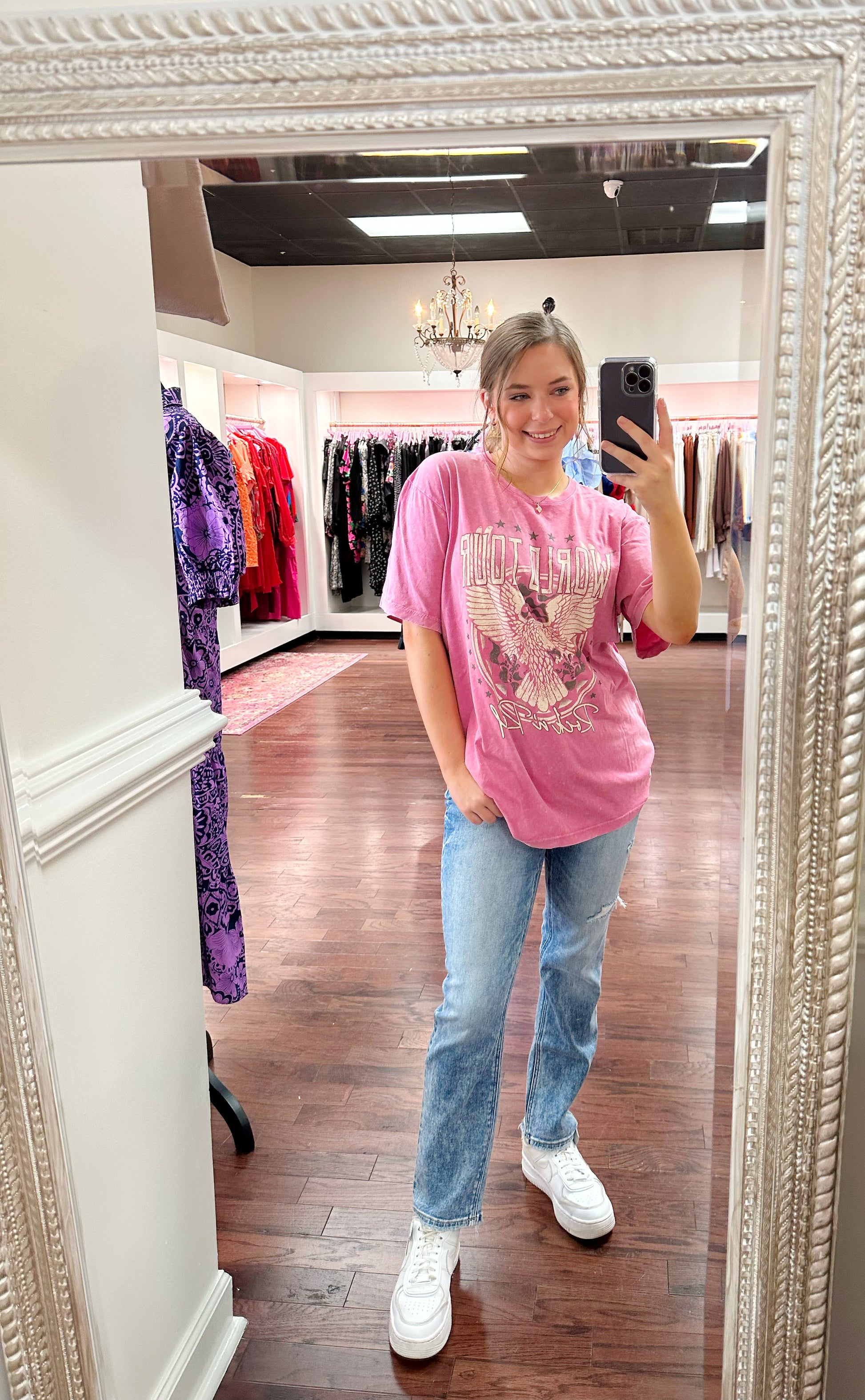 Introducing our Rock n' Roll Tee - your passport to an unforgettable concert experience, wherever you go! Featuring a vintage mineral-washed 100% cotton boyfriend fit for the effortlessly cool look, plus a stylish World Tour Rock n Roll Eagle graphic for a bit of added swagger. Get ready to show off your rock star style! Let's rock 🎸