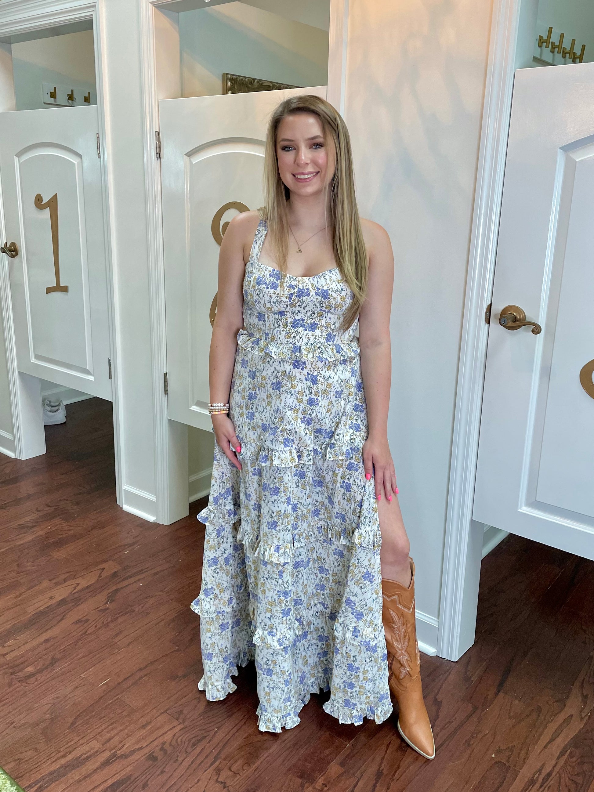 Effortlessly chic, the Samantha Dress is a playful blend of floral prints and bustier style. This maxi dress features a feminine lace up back and a flirty ruffle tiers, complete with a front slit. The lining ensures a comfortable fit while you turn heads in this 100% polyester dress.