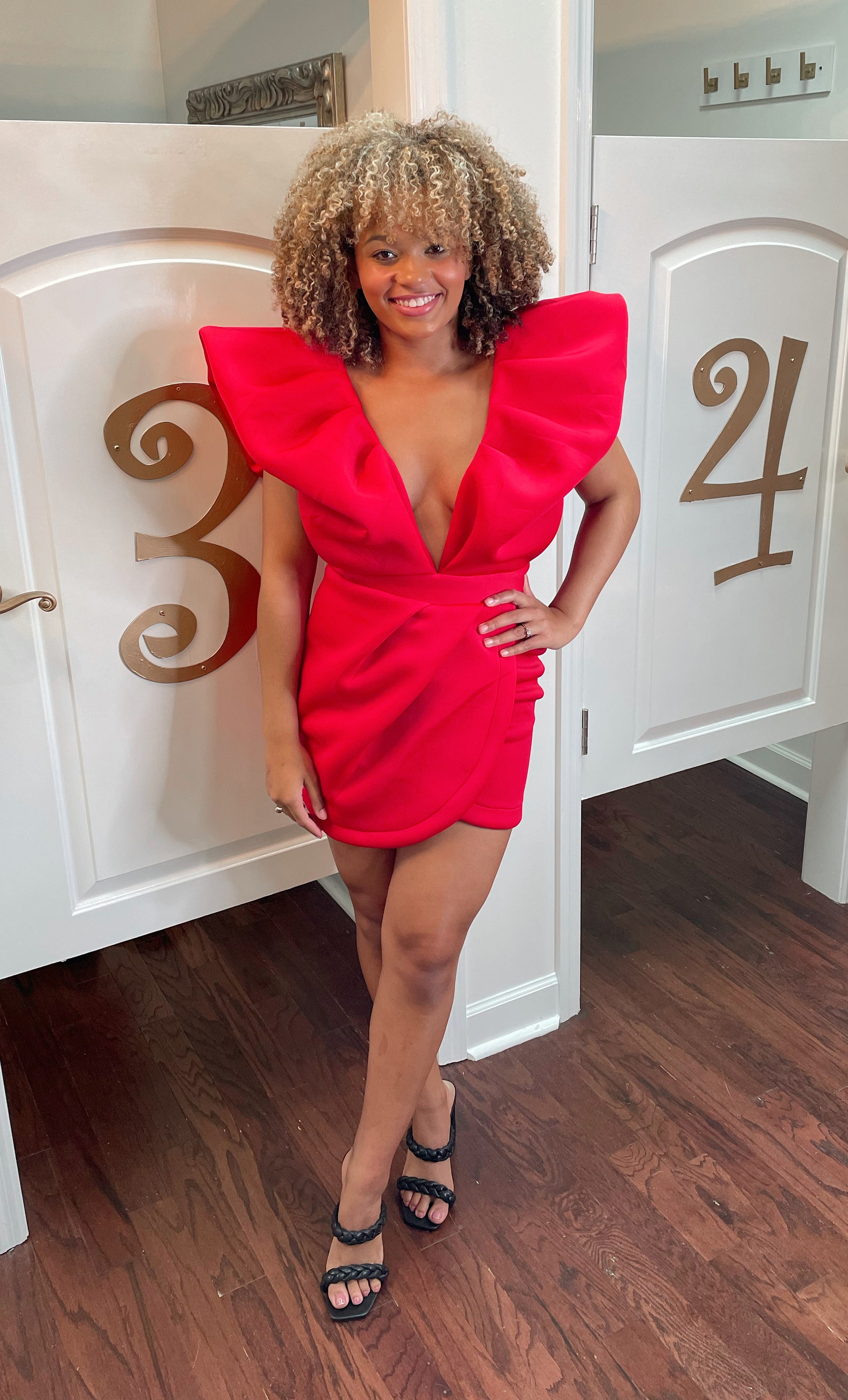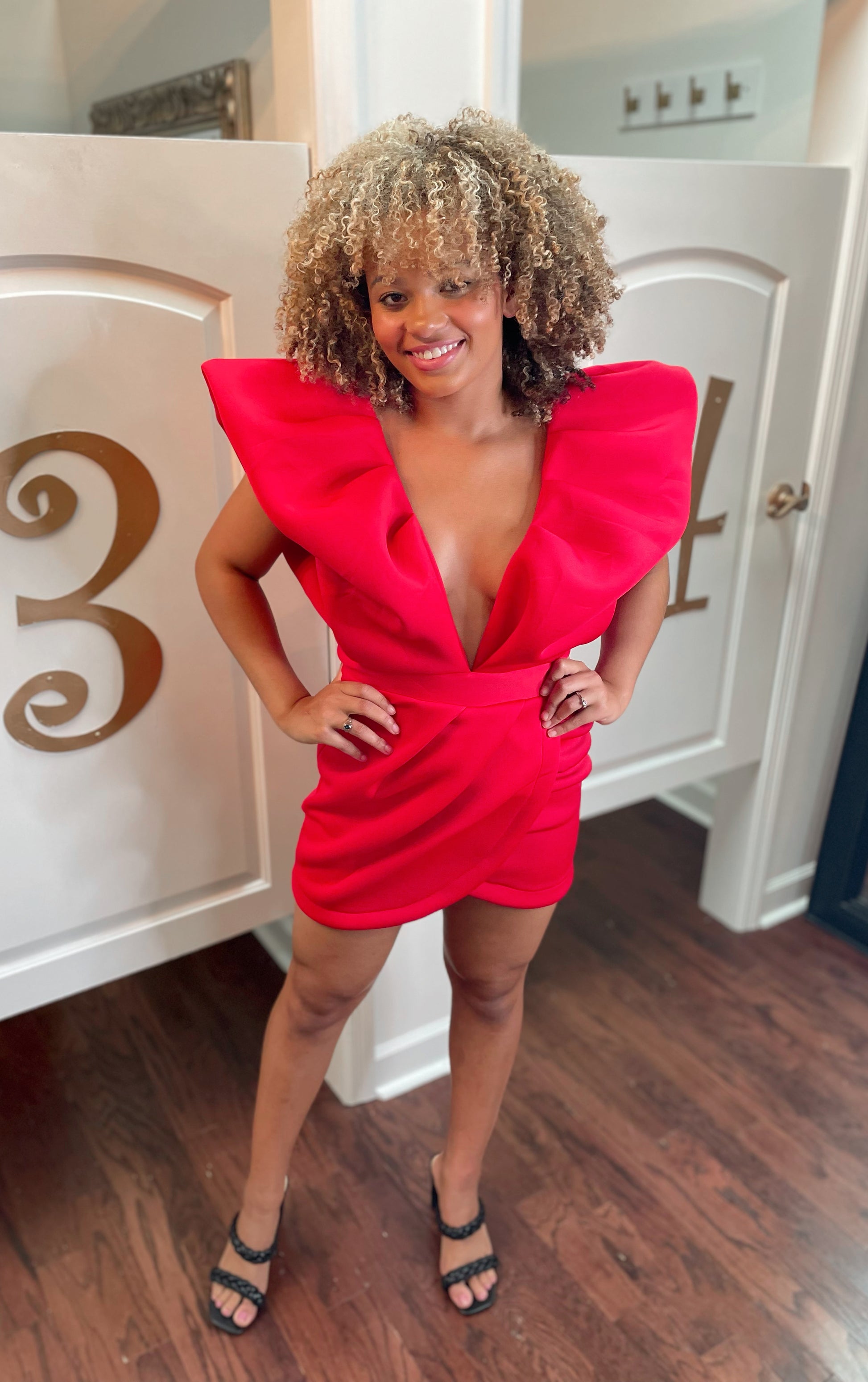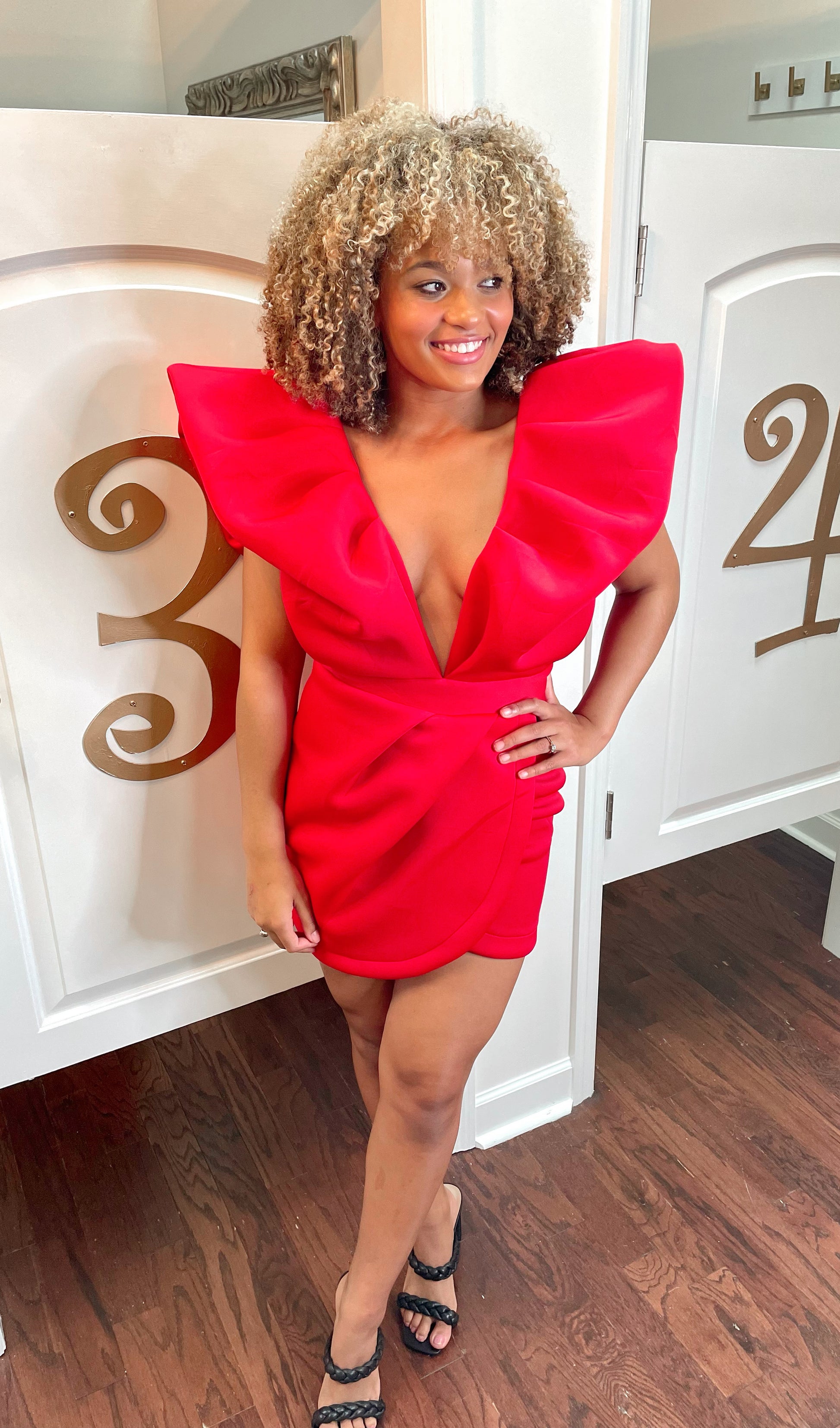 Scuba deep v-neck puff sleeve mini dress with tulip skirt and open back detailing. Back invisible zipper. 95% polyester and 5% spandex.