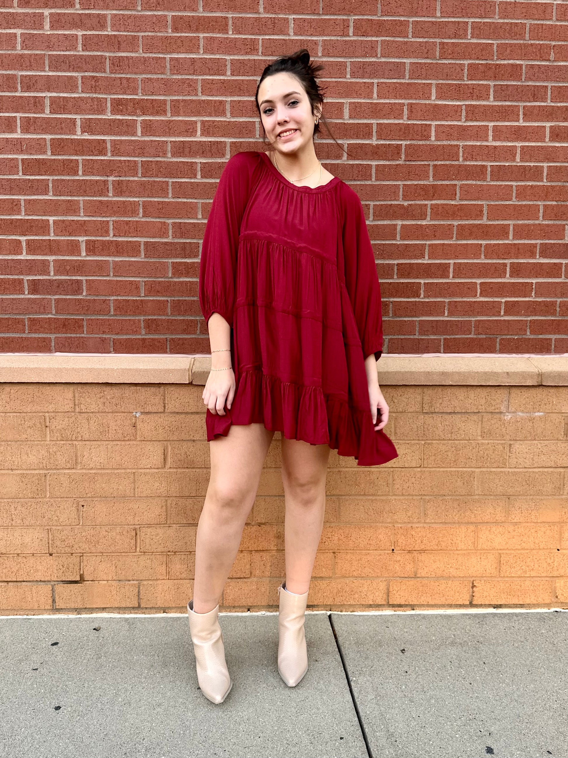 Look no further than our wine-colored Serena Dress for a mini that makes a major statement! Featuring a tiered design, 3/4 puff sleeves, built in shorts, round neckline, and pockets - you'll be ready to tackle any occasion with style, and you won't have your hands full either! Now that's a win-win! 100% polyester.