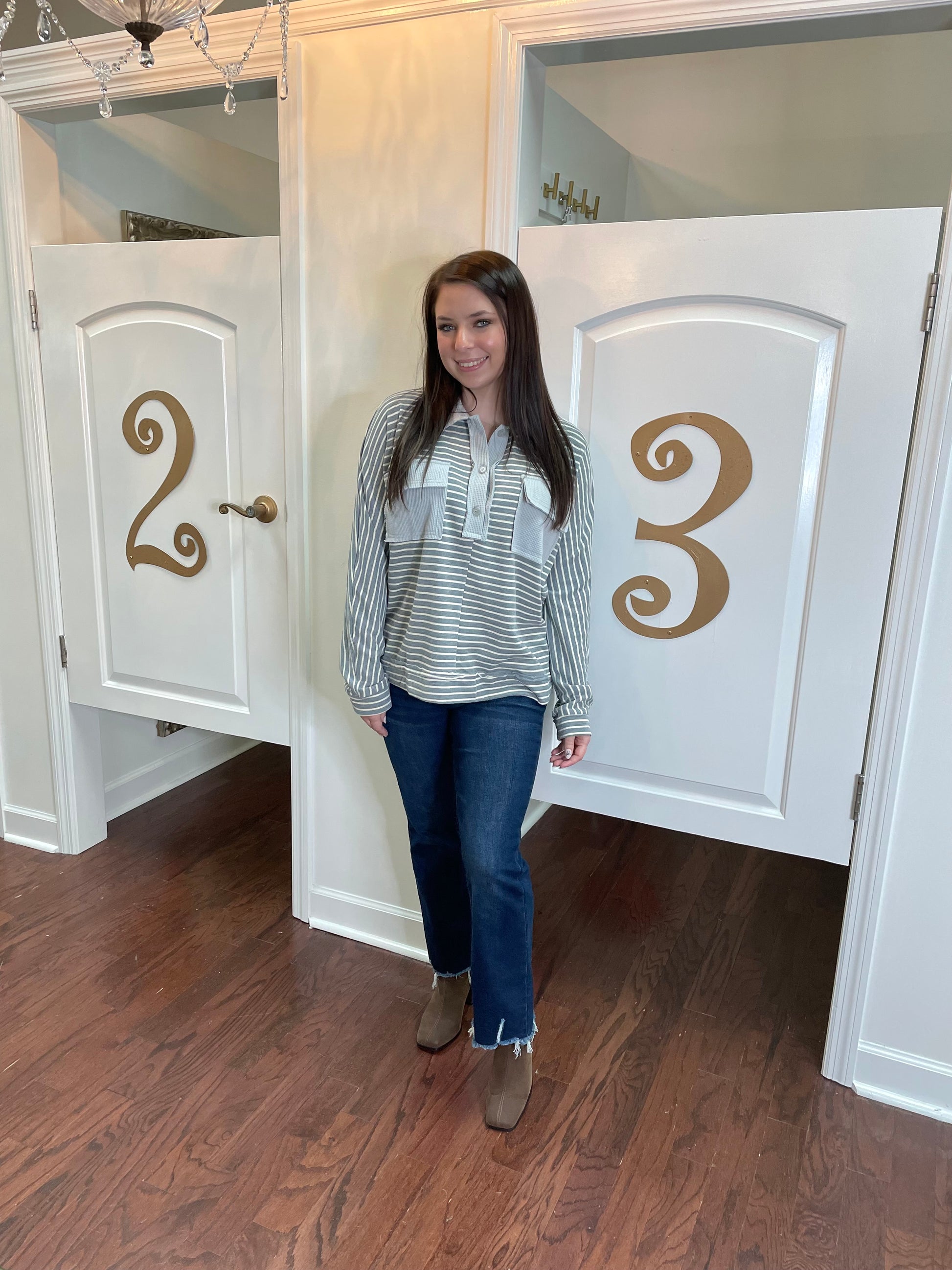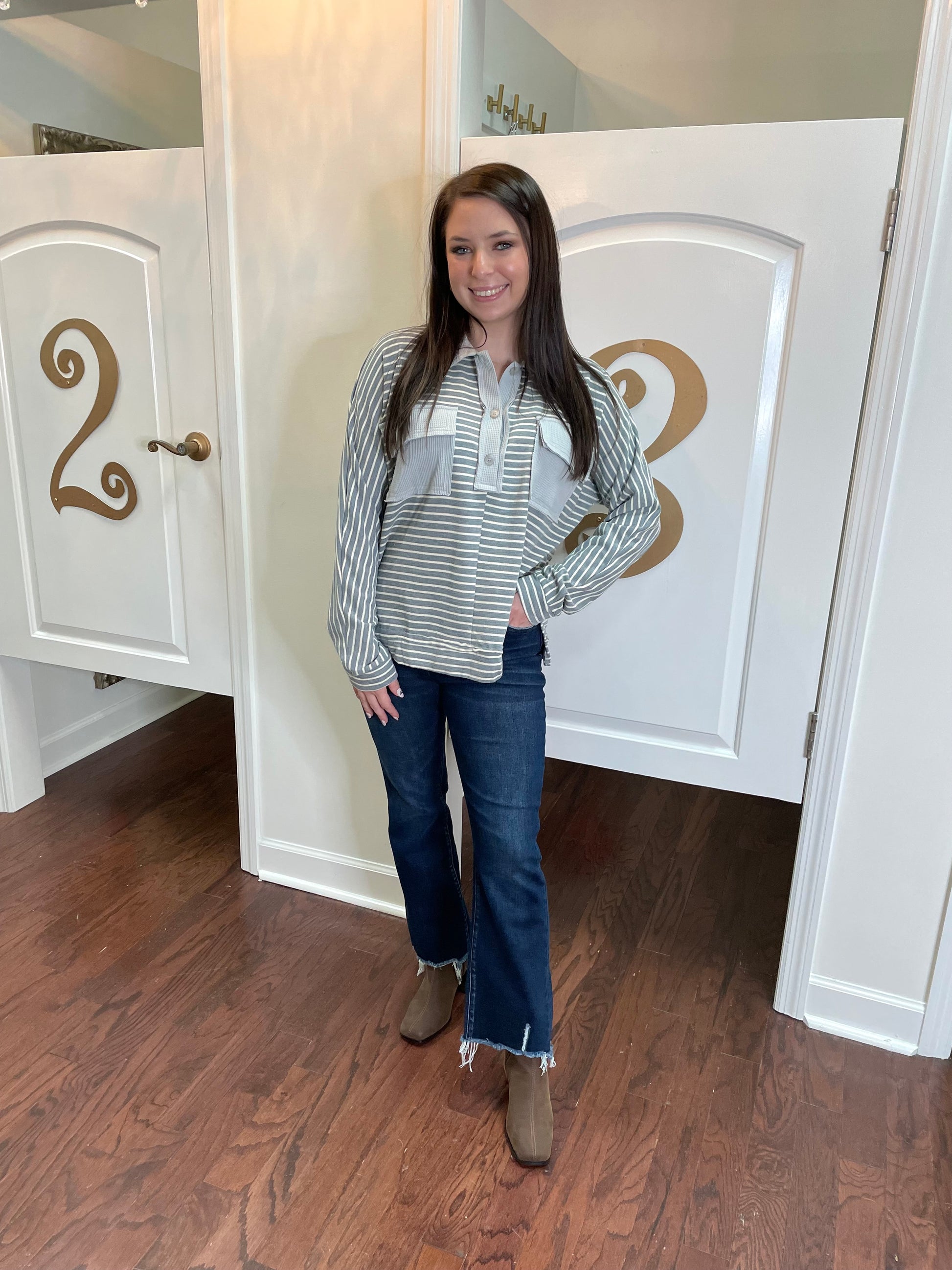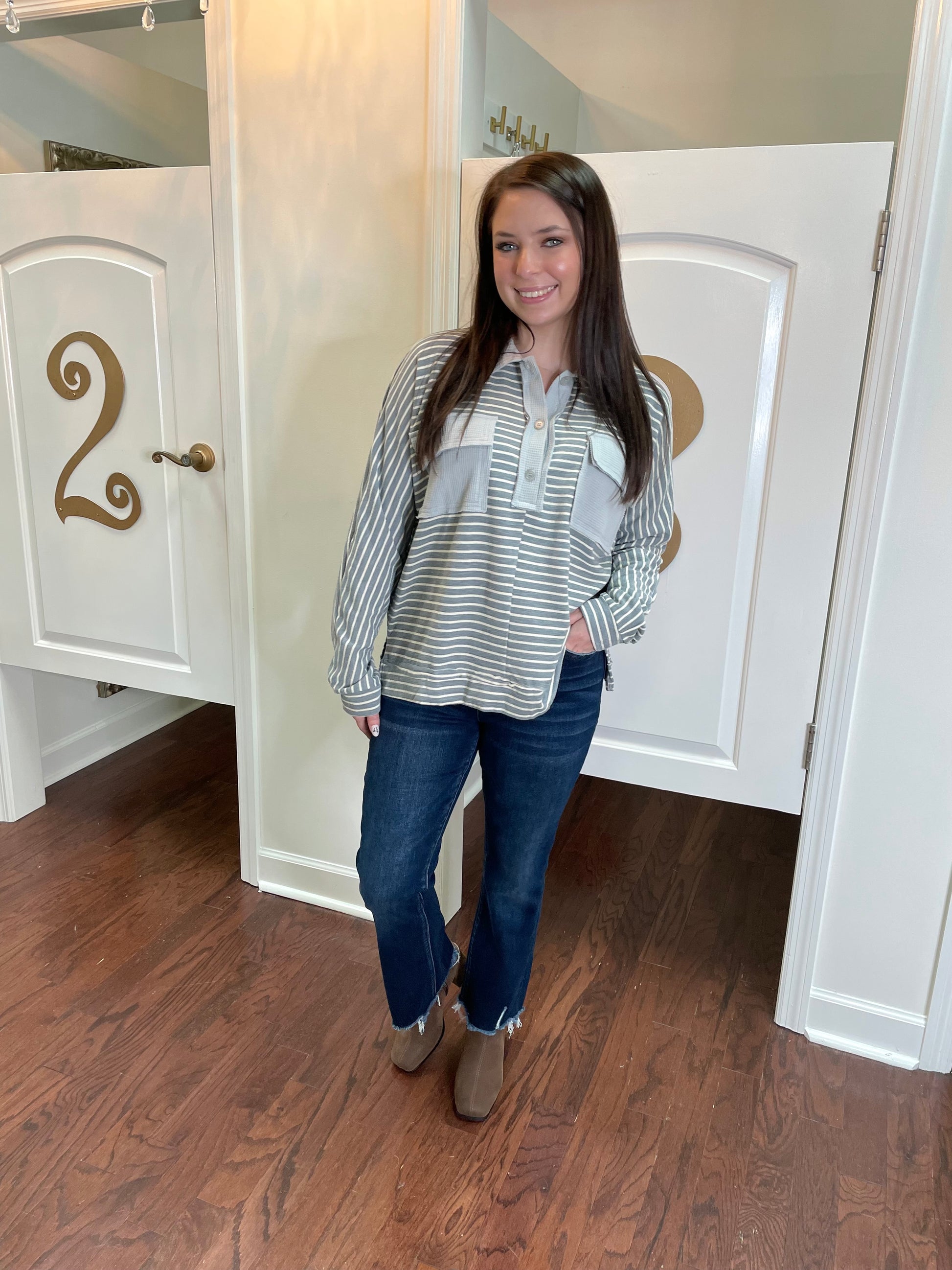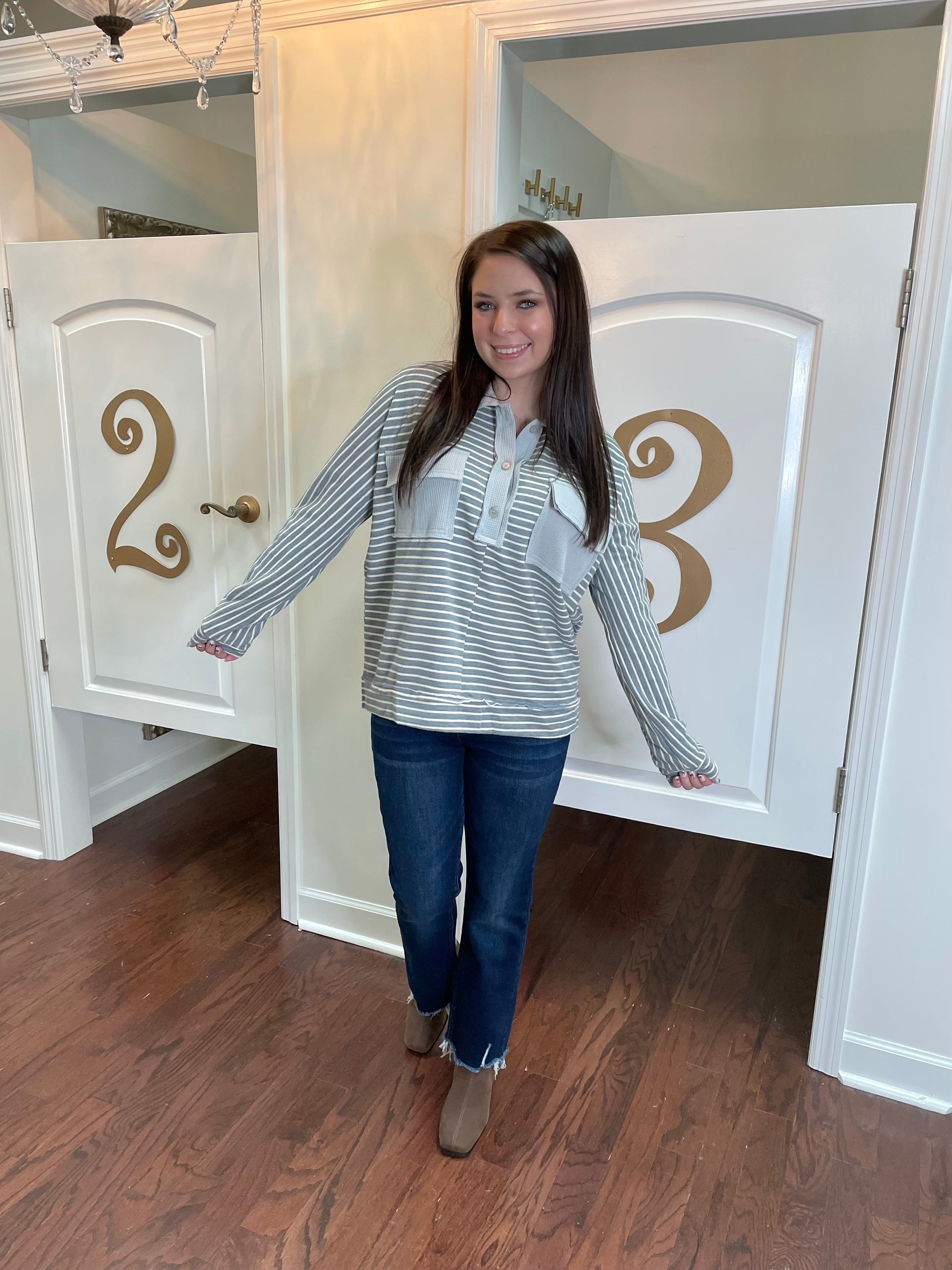 Laid-back looks just got even better with our Serene Top! This vintage-inspired piece features a soft striped terry knit, long dolman sleeves, and a loose fit for ultimate comfort. Plus, the contrast pocket and collar, outseam detail, and side slit add a touch of playful charm. Get ready to relax in style!