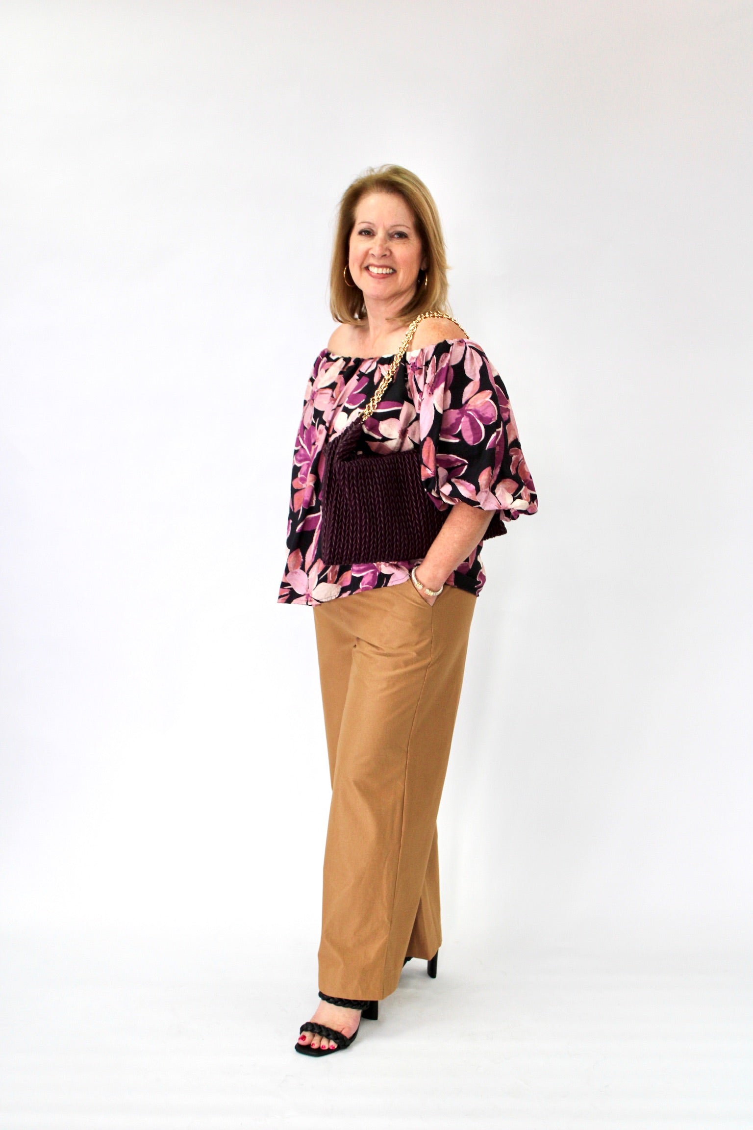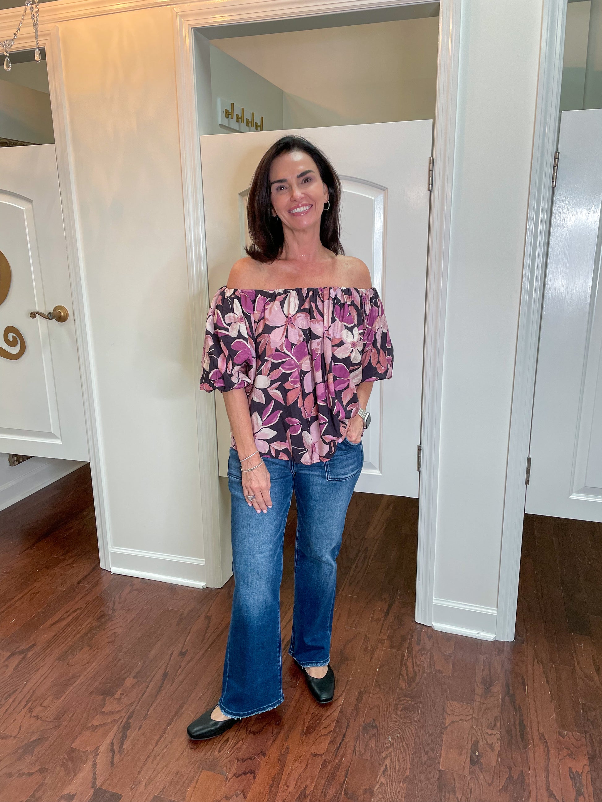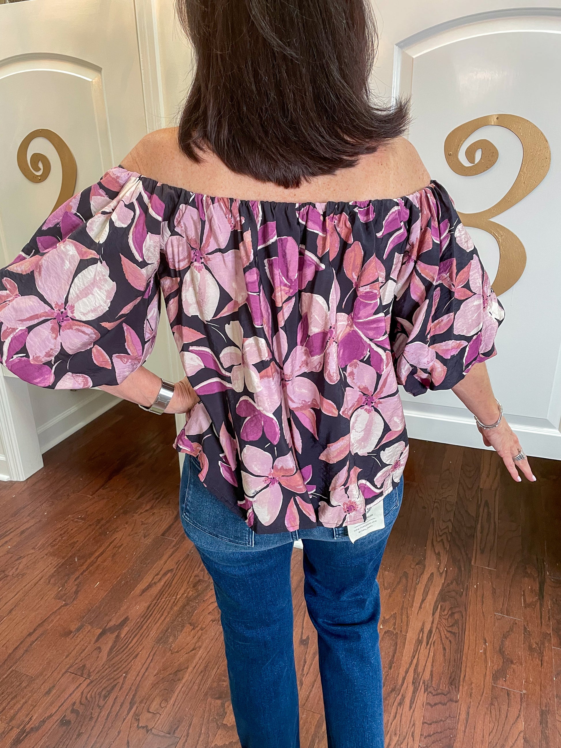 Get ready to bloom in style with our Suki Floral Top! Made with a woven blend of rayon and nylon, this chic off-the-shoulder top features a vibrant floral print in pretty violet multi coloring. With a flattering boatneck and short sleeves, it's perfect for year-round wear. Don't miss out on adding this versatile piece to your wardrobe!