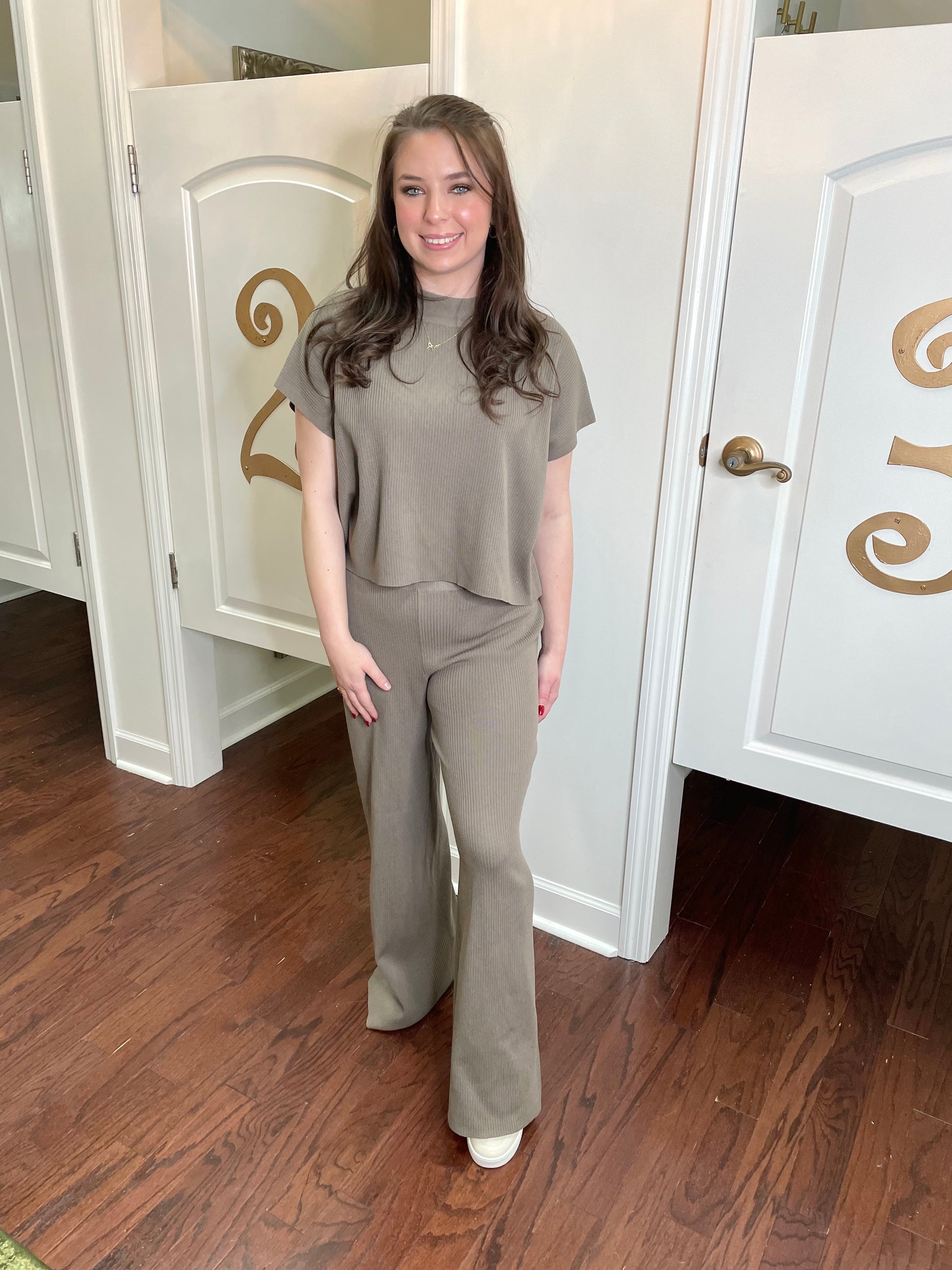 Get cozy this fall with our Leonie set! The high-waisted, mocha-colored Leonie Pants are made of a knit sweater material and feature a ribbed design and wide leg fit. Complete the look with the matching Leonie Top, featuring a mock neck and short sleeves. Lounge in style with this chic set!